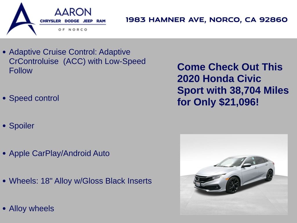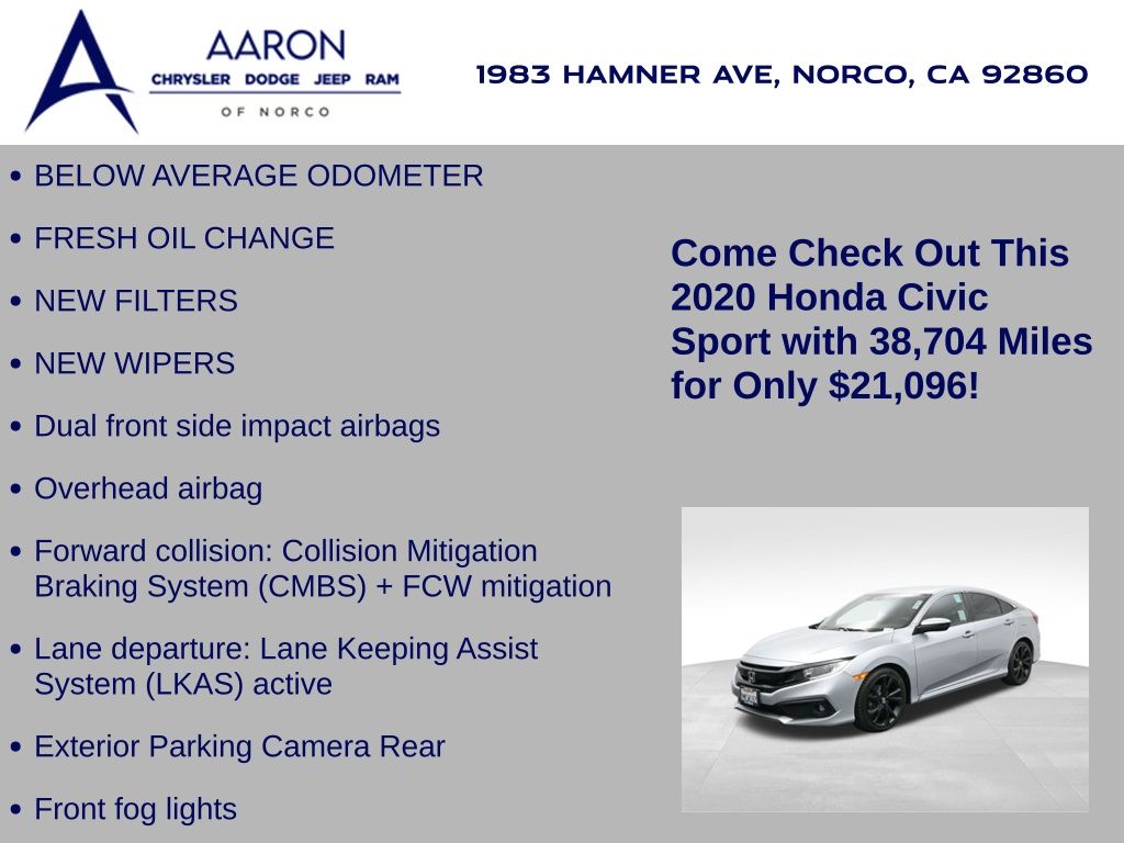 Priced below KBB Fair Purchase Price!BELOW AVERAGE ODOMETER, FRESH OIL CHANGE, NEW FILTERS, NEW WIPERS, Civic Sport, 4D Sedan, 2.0L I4 DOHC 16V i-VTEC, FWD, Adaptive Cruise Control: Adaptive CrControluise (ACC) with Low-Speed Follow, Alloy wheels, Apple CarPlay/Android Auto, Dual front side impact airbags, Exterior Parking Camera Rear, Forward collision: Collision Mitigation Braking System (CMBS) + FCW mitigation, Front fog lights, Lane departure: Lane Keeping Assist System (LKAS) active, Overhead airbag, Speed control, Spoiler, Wheels: 18" Alloy w/Gloss Black Inserts.Clean CARFAX.