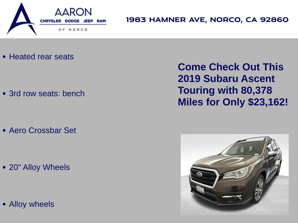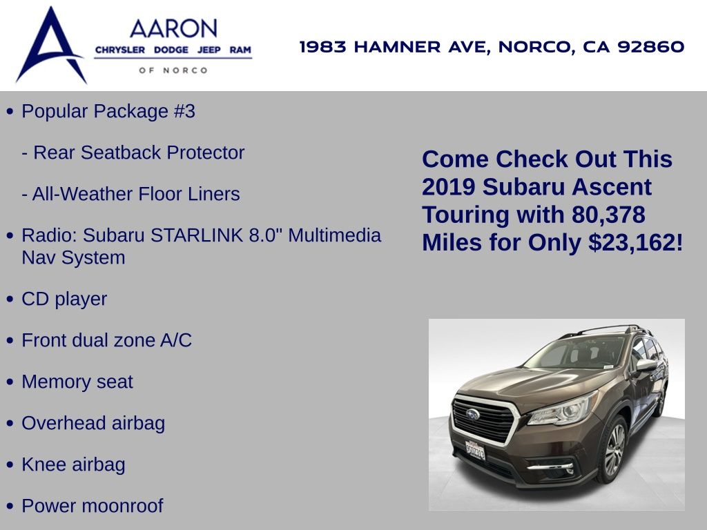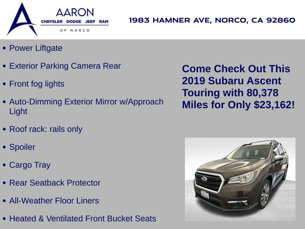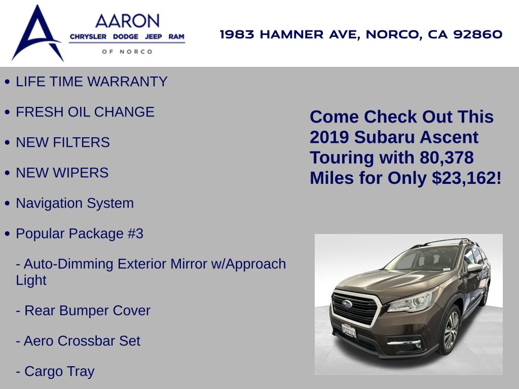 LIFE TIME WARRANTY, FRESH OIL CHANGE, NEW FILTERS, NEW WIPERS, Ascent Touring, 4D Sport Utility, 2.4L DOHC, AWD, 20" Alloy Wheels, 3rd row seats: bench, Aero Crossbar Set, All-Weather Floor Liners, Alloy wheels, Auto-Dimming Exterior Mirror w/Approach Light, Cargo Tray, CD player, Exterior Parking Camera Rear, Front dual zone A/C, Front fog lights, Heated & Ventilated Front Bucket Seats, Heated rear seats, Knee airbag, Memory seat, Navigation System, Overhead airbag, Popular Package #3, Power Liftgate, Power moonroof, Radio: Subaru STARLINK 8.0" Multimedia Nav System, Rear Bumper Cover, Rear Seatback Protector, Roof rack: rails only, Spoiler.Awards: * 2019 KBB.com 12 Best Family Cars * 2019 KBB.com 10 Favorite New-for-2019 Cars * 2019 KBB.com Brand Image Awards * 2019 KBB.com 5-Year Cost to Own Awards