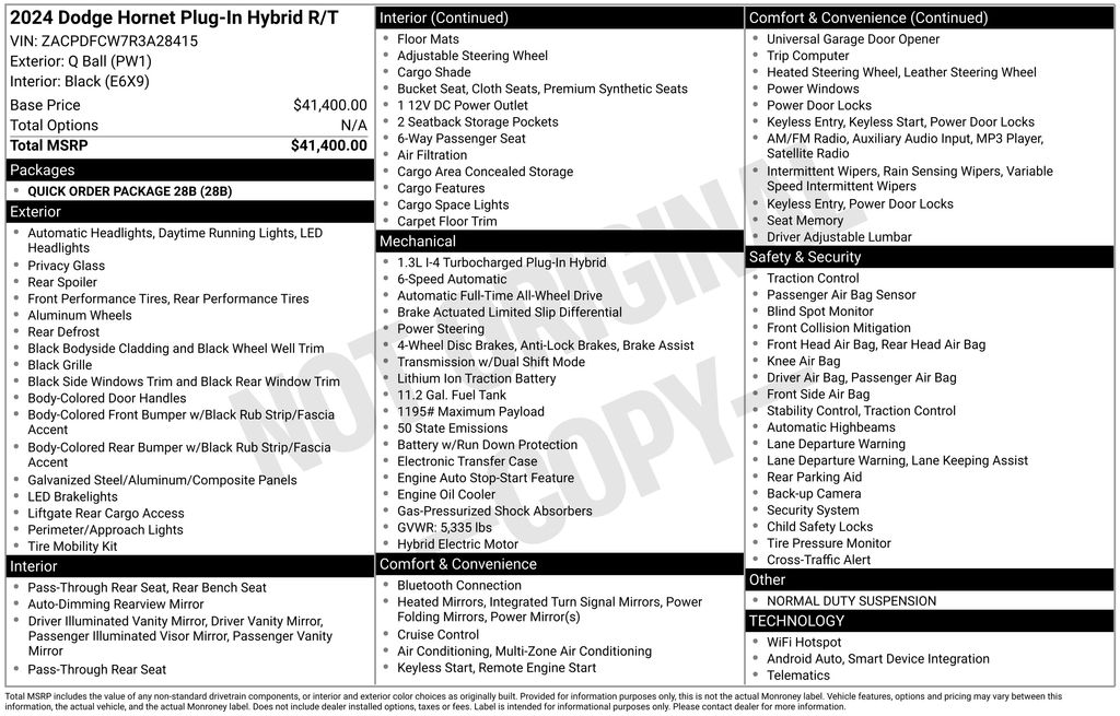 Q Ball 2024 Dodge Hornet R/T AWD 6-Speed Automatic 1.3L I4 1.3L I4, Alloy wheels, Apple CarPlay, Brake assist, Electronic Stability Control, Front Bucket Seats, Front dual zone A/C, GPS Antenna Input, Heated front seats, Lane Departure Warning System, Power 4-Way Driver Lumbar Adjust, Power Adjust 8-Way Driver Seat, Quick Order Package 28B (DISC), Speed-sensing steering, Wheels: 18" x 7.5" Graphite Aluminum.