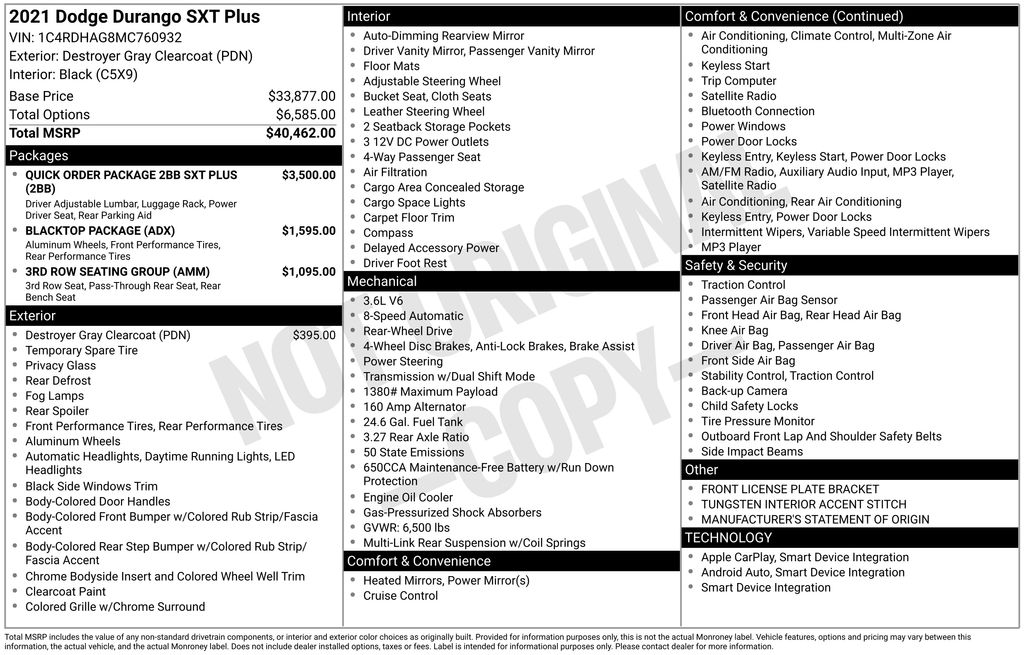 Destroyer Gray Clearcoat 2021 Dodge Durango SXT Plus RWD 8-Speed Automatic 3.6L V6 24V VVT 2nd Row 60/40 Fold & Tumble Seat, 3rd Row Remote Headrest Dumping, 3rd Row Seat, 3rd Row Seating Group, 4-Way Power Driver Lumber Adjust, 7-Passenger Seating, Black Headlamp Bezels, Black Headliner, Blacktop Package, Body Color Lower Fascia, Body Color Rear Fascia, Body Color Shark Fin Antenna, Body Color Sill Molding, Body Color Wheel Lip Moldings, Bridgestone Brand Tires, Bright Side Roof Rails, Delete Roof Rack, Dual Rear Exhaust w/Bright Tips, Gloss Black Badges, Gloss Black Exterior Mirrors, Gloss Black Grille w/Granite Inner, Integrated Roof Rail Crossbars, ParkSense Rear Park Assist w/Stop, ParkView Rear Back-Up Camera, Power 8-Way Driver/Manual Passenger Seat, Quick Order Package 2BB SXT Plus, Remote keyless entry, Satin Black Dodge Tail Lamp Badge, Wheels: 20" x 8.0" Black Noise Aluminum.19/26 City/Highway MPG