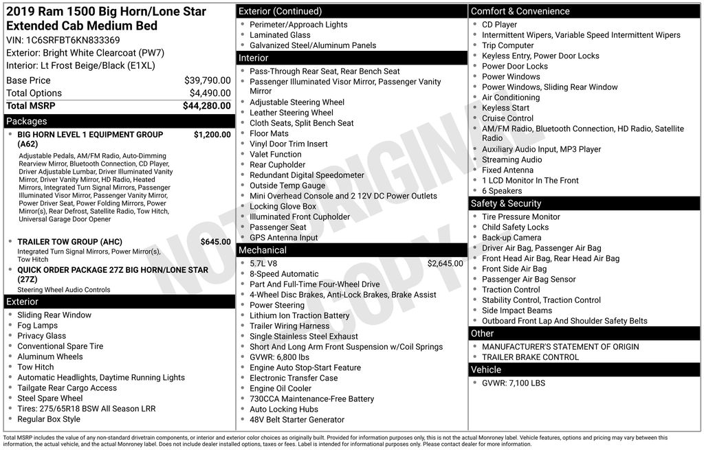 FRESH OIL CHANGE, NEW FILTERS, NEW WIPERS, 1500 Big Horn/Lone Star, 4D Quad Cab, HEMI 5.7L V8 Multi Displacement VVT, 8-Speed Automatic, 4WD, Add Class IV Receiver Hitch, Alloy wheels, Auto-Dimming Rear-View Mirror, Big Horn IP Badge, Big Horn Level 1 Equipment Group, Class IV Receiver Hitch, Cluster 3.5" TFT Color Display, Dual front side impact airbags, Exterior Mirrors Courtesy Lamps, Exterior Mirrors w/Supplemental Signals, Foam Bottle Insert (Door Trim Panel), Front fog lights, Glove Box Lamp, GPS Antenna Input, Overhead airbag, ParkView Rear Back-Up Camera, Power 4-Way Driver Lumbar Adjust, Power 8-Way Driver Seat, Power Adjustable Pedals, Power Black Trailer Tow Mirrors, Power Heated Fold Away Mirrors, Quick Order Package 27Z Big Horn/Lone Star, Radio: Uconnect 4 w/8.4" Display, Rear Dome w/On/Off Switch Lamp, Rear Power Sliding Window, Rear Window Defroster, Single Disc Remote CD Player, SiriusXM Satellite Radio, Steering Wheel Mounted Audio Controls, Sun Visors w/Illuminated Vanity Mirrors, Trailer Brake Control, Trailer Tow Group, Trailer Tow Mirrors, Universal Garage Door Opener, Wheels: 18" x 8".Clean CARFAX.Awards: * Motor Trend Automobiles of the year * 2019 KBB.com Best Auto Tech Awards * NACTOY 2019 North American Truck of the Year * 2019 KBB.com 10 Best Road Trip Cars * 2019 KBB.com 10 Favorite New-for-2019 Cars