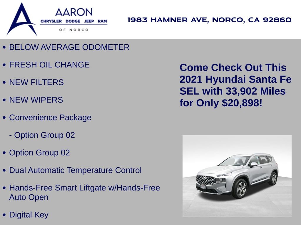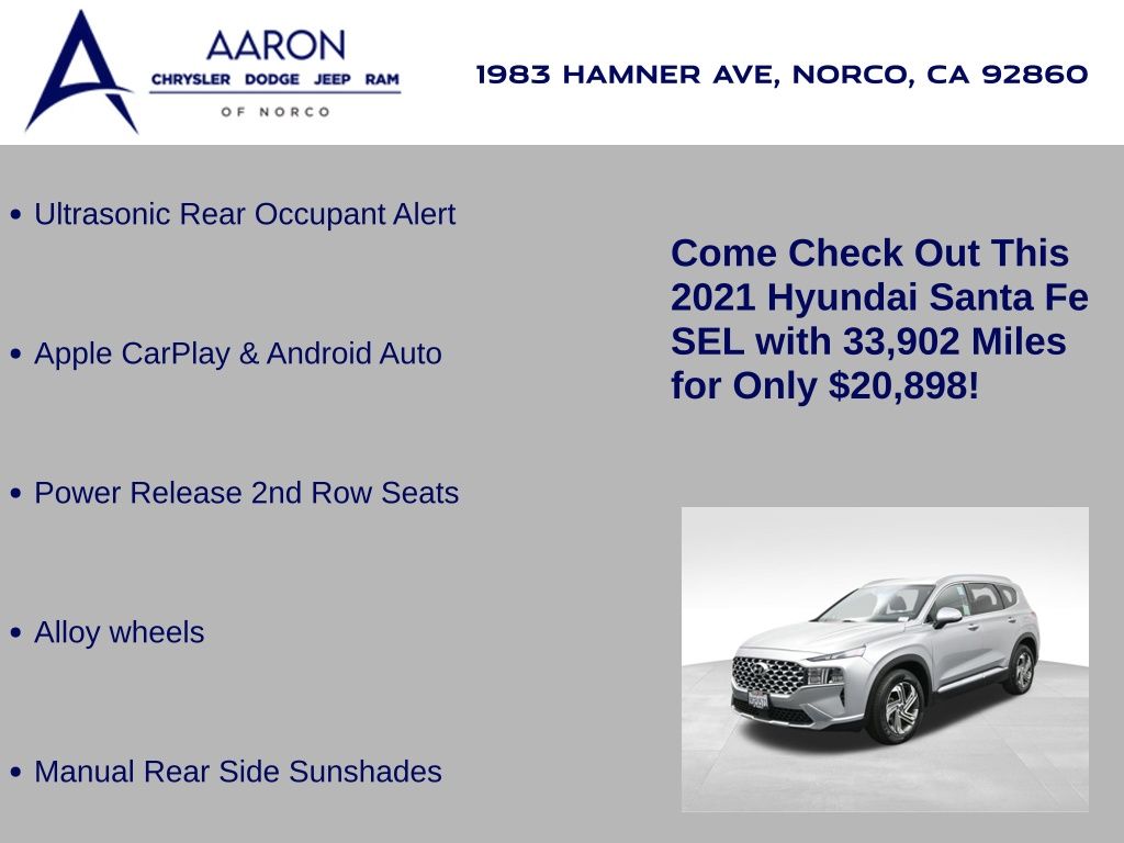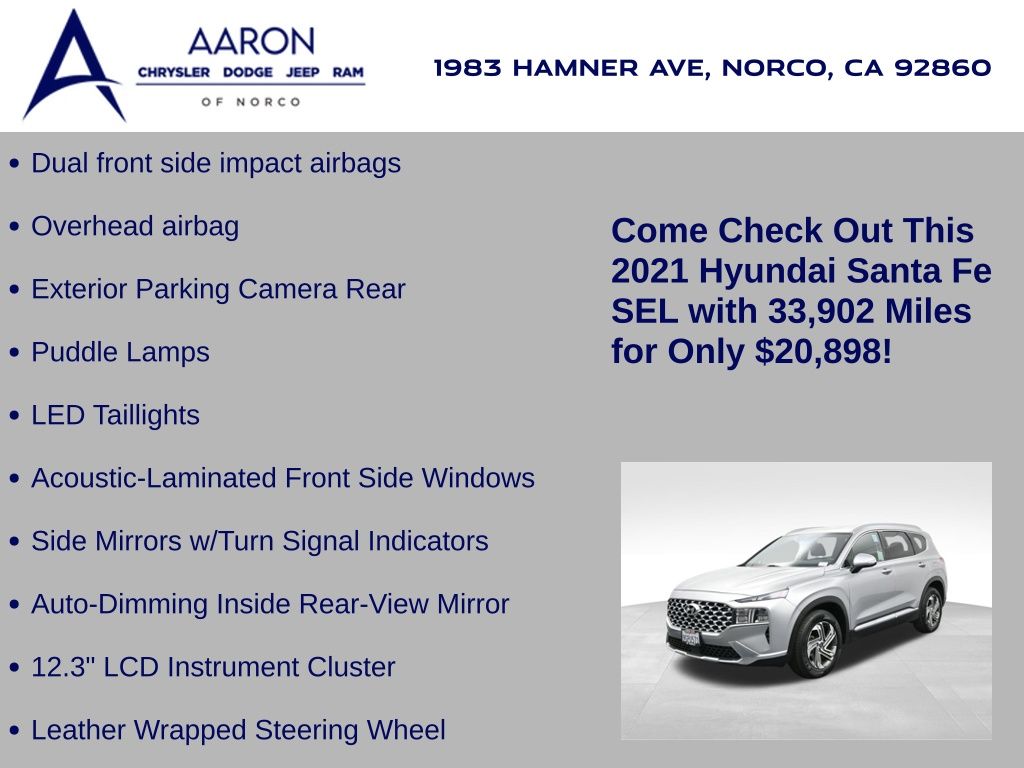 Priced below KBB Fair Purchase Price!BELOW AVERAGE ODOMETER, FRESH OIL CHANGE, NEW FILTERS, NEW WIPERS, Santa Fe SEL, 4D Sport Utility, 2.5L I4, 8-Speed Automatic with SHIFTRONIC, FWD, 12.3" LCD Instrument Cluster, Acoustic-Laminated Front Side Windows, Alloy wheels, Apple CarPlay & Android Auto, Auto-Dimming Inside Rear-View Mirror, Convenience Package, Digital Key, Dual Automatic Temperature Control, Dual front side impact airbags, Exterior Parking Camera Rear, Hands-Free Smart Liftgate w/Hands-Free Auto Open, Leather Wrapped Steering Wheel, LED Taillights, Manual Rear Side Sunshades, Option Group 02, Overhead airbag, Power Release 2nd Row Seats, Puddle Lamps, Side Mirrors w/Turn Signal Indicators, Ultrasonic Rear Occupant Alert.CARFAX One-Owner.