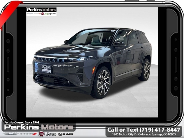 Factory MSRP: $67,790 $21,643 off MSRP! Priced below KBB Fair Purchase Price! Baltic Gray Metallic Clearcoat 2025 Jeep Wagoneer S Limited 4WD 1-Speed Automatic Electric Motor<br><br>Check us out at www.perkinsmotors.com to see our specials! Since opening our doors in 1944, we’ve been proud to serve Colorado Springs, CO, and the surrounding areas of Pueblo, Castle Rock and Denver, CO. Throughout this time of being family owned for 80 years, we’ve maintained a firm commitment to our customers: to offer a wide selection of New Chrysler, Dodge, Fiat, Jeep, and Ram vehicles and quality pre-owned vehicles, and provide a quick, no-hassle car-buying process that ensures everyone drives off the lot satisfied with their purchase.<br><br>Dark Appearance Package (Dark Daylight Opening Upper, Titanium Exterior Accents, Titanium Rear Fascia Applique, and Titanium Upper Grille Applique), Quick Order Package 25D, Two Tone Paint Group, 10 Speakers, 4-Wheel Disc Brakes, ABS brakes, Air Conditioning, Alloy wheels, AM/FM radio: SiriusXM with 360L, Apple CarPlay/Android Auto, Audio memory, Auto High-beam Headlights, Auto-dimming door mirrors, Auto-dimming Rear-View mirror, Automatic temperature control, Brake assist, Bumpers: body-color, Compass, Cruise Control, Delay-off headlights, Driver door bin, Driver vanity mirror, Dual front impact airbags, Dual front side impact airbags, Electronic Stability Control, Emergency communication system: Jeep Connect, Four wheel independent suspension, Front anti-roll bar, Front Bucket Seats, Front Center Armrest w/Storage, Front dual zone A/C, Front fog lights, Front reading lights, Fully automatic headlights, Garage door transmitter, Heated door mirrors, Heated front seats, Heated steering wheel, Heavy Duty Suspension, Illuminated entry, Knee airbag, Low tire pressure warning, Memory seat, Navigation System, Neo Ultra Lux II Seats, Occupant sensing airbag, Outside temperature display, Overhead airbag, Panic alarm, ParkView Rear Back-Up Camera, Passenger door bin, Passenger vanity mirror, Power door mirrors, Power driver seat, Power Liftgate, Power moonroof, Power passenger seat, Power steering, Power windows, Premium audio system: UConnect 5, Radio data system, Radio: Uconnect 5 Nav w/12.3 Display, Rain sensing wipers, Rear air conditioning, Rear anti-roll bar, Rear dual zone A/C, Rear reading lights, Rear seat center armrest, Rear side impact airbag, Rear window defroster, Rear window wiper, Remote keyless entry, Security system, Speed-sensing steering, Speed-Sensitive Wipers, Split folding rear seat, Spoiler, Steering wheel mounted audio controls, Telescoping steering wheel, Tilt steering wheel, Traction control, Trip computer, Turn signal indicator mirrors, Variably intermittent wipers, and Wheels: 20 x 8.5 Painted Diamond Aluminum Design 1. Sale price includes all manufacture's incentives and dealer discounts. Sale price not available on lease or compatible with special APR. $3500 - Colorado Innovative Motor Vehicle Retail Credit. Exp. 12/31/2025 $4500 - 2025 National Retail Consumer Cash. Exp. 06/30/2025 $7500 - 2025 CDJ Federal Tax Credit Purchase FTC251. Exp. 01/05/2026