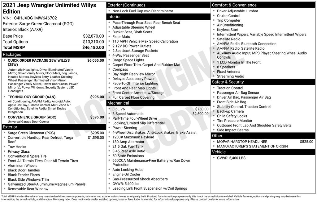 Priced below KBB Fair Purchase Price!LIFE TIME WARRANTY, FRESH OIL CHANGE, NEW FILTERS, NEW WIPERS, Wrangler Unlimited Willys, 4D Sport Utility, 3.6L V6 24V VVT, 8-Speed Automatic, 4WD, 4-Wheel Drive Swing Gate Decal, 7.0" Touchscreen Display, Air Conditioning w/Auto Temperature Control, Air Filtering, Anti-Spin Differential Rear Axle, Apple CarPlay, Automatic Headlamps, Black Grille, Black Trail Rated Badge, Cluster 7.0" TFT Color Display, Convenience Group, Deep Tint Sunscreen Windows, Dual front impact airbags, For More Info, Call 800-643-2112, Front 1-Touch Down Power Windows, Front fog lights, Front LED Fog Lamps, Google Android Auto, GPS Antenna Input, Integrated Center Stack Radio, Leather Wrapped Steering Wheel, LED Headlamp & Fog Lamp Group, LED Premium Reflector Headlamps, Matte Black Jeep Badge, Mold In Color Bumper w/Gloss Black, MOPAR All-Weather Floor Mats (DISC), ParkView Rear Back-Up Camera, Power Heated Mirrors, Quick Order Package 25W Willys (DISC), Radio: Uconnect 4 w/7" Display, Remote Keyless Entry, Security Alarm, SiriusXM Radio Service, SiriusXM Satellite Radio, Speed Sensitive Power Locks, Stop-Start Dual Battery System, Sun Visors w/Illuminated Vanity Mirrors, Technology Group, Universal Garage Door Opener, USB Host Flip, Wheels: 17" x 7.5" Black Steel Styled, Wheels: 17" x 7.5" Moab Black Aluminum, Willys, Willys Hood Decal, Wrangler Decal.Clean CARFAX.CARFAX One-Owner.