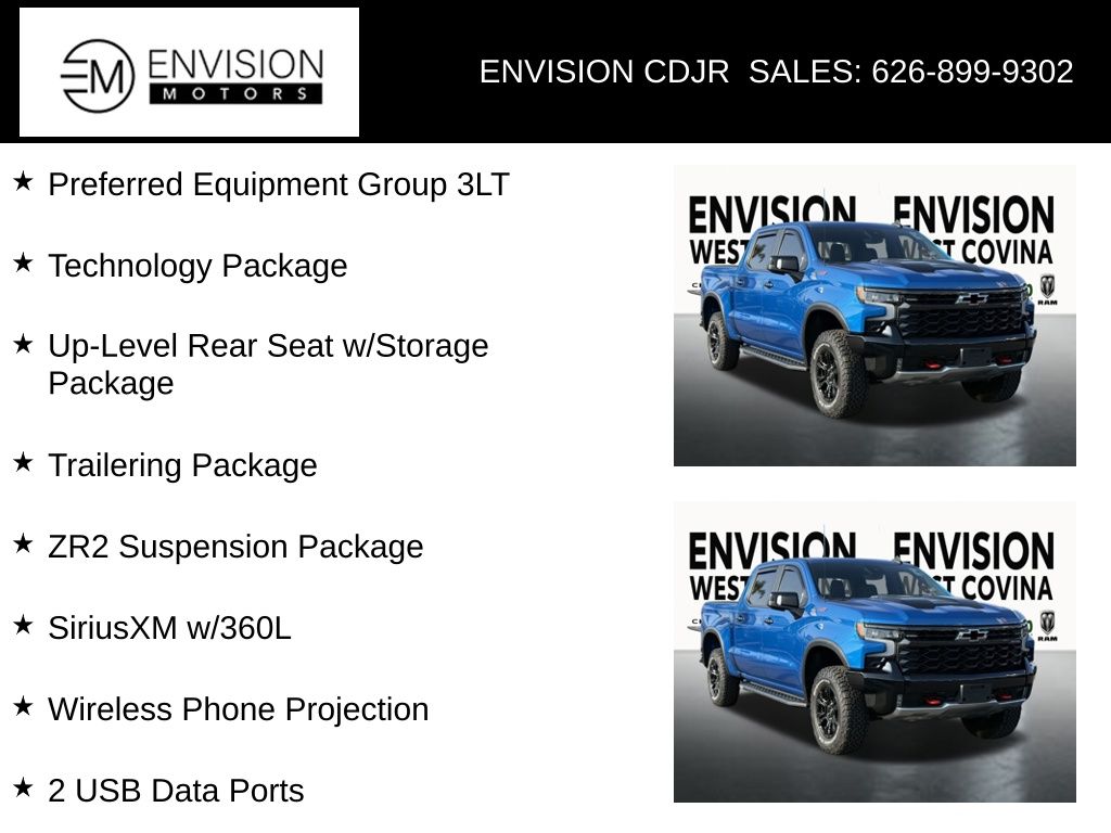 WE SPECIALIZE IN ALL CREDIT PROFILES! See what we can do for you! Call to find out (626) 899-9302.Odometer is 13476 miles below market average! 10-Speed Automatic, 4WD, Jet Black/Graystone Leather, 10-Way Power Driver Seat w/Lumbar, 10-Way Power Passenger Seat Adjuster w/Lumbar, 12.3" Multicolor Reconfigurable Digital Display, 120-Volt Bed Mounted Power Outlet, 120-Volt Instrument Panel Power Outlet, 15" Diagonal Multicolor Head-Up Display, 170 Amp Alternator, 2 USB Data Ports, 2nd Row Heated Outboard Seats, Adaptive Cruise Control, All-Weather Floor Liner (LPO), Auto-Dimming Inside Rear-View Mirror, Auto-Locking Rear Differential, Bed View Camera, Bluetooth® For Phone, Chevrolet Connected Access Capable, Chevytec Spray-On Black Bedliner, Color-Keyed Carpeting Floor Covering, Compass, Deep-Tinted Glass, Driver Memory, Dual Exhaust, Dual Rear USB Ports (Charge Only), Electric Rear-Window Defogger, Electrical Steering Column Lock, Electronic Cruise Control, EZ Lift Power Lock & Release Tailgate, Floor Mounted Center Console, Front LED Fog Lamps, Front Rainsensing Wipers, HD Surround Vision, Heated Driver & Front Outboard Passenger Seats, Heated Steering Wheel, Heavy-Duty Air Filter, High Gloss Black Mirror Caps, Hill Descent Control, Hitch Guidance, Hitch Guidance w/Hitch View, Integrated Trailer Brake Controller, Keyless Open & Start, Leather Wrapped Steering Wheel, LED Cargo Area Lighting, Manual Tilt/Telescoping Steering Column, OnStar & Chevrolet Connected Services Capable, Outside Heated Power-Adjustable Mirrors, Performance Red Recovery Hooks, Perimeter Lighting, Power Front Passenger Windows w/Express Up/Down, Power Front Windows w/Driver Express Up/Down, Power Rear Windows w/Express Down, Power Sliding Rear Window w/Rear Defogger, Power Sunroof, Power Tilt & Telescoping Steering Column, Preferred Equipment Group 3LT, Rear Camera Mirror, Rear Cross Traffic Alert-Braking, Rear Park Assist, Rear Pedestrian Detection, Rear Wheelhouse Liners, Remote Vehicle Starter System, Safety Alert Seat, SiriusXM w/360L, Standard Tailgate, Steering Wheel Audio Controls, Technology Package, Theft Deterrent System (Unauthorized Entry), Trailer Camera Provisions, Trailer Side Blind Zone Alert, Trailering App, Trailering Package, Universal Home Remote, Up-Level Rear Seat w/Storage Package, Ventilated Driver & Front Passenger Seats, Wheels: 18" x 8.5" Aluminum Machined Face, Wheels: 18" x 8.5" Gloss Black, Wi-Fi Hot Spot Capable, Wireless Charging, Wireless Phone Projection, ZR2 Suspension Package.Glacier Blue Metallic2022 Chevrolet Silverado 1500 ZR2 4WD 10-Speed Automatic EcoTec3 6.2L V8**********All Pricing and Advertised Prices for any/all vehicles offered for sale does not include dealer installed accessories which can be purchased for an additional cost.********** The Factory Rebates may not be available on this vehicle if you elect to take advantage of a Special Alternative APR or Special Lease program. Some Factory Rebates are California Resident specific and may vary for residents of other states. NO sales to Dealers, Brokers or Exporters. For out of state purchase, customers must be present to purchase. If shipping is required, dealership must facilitate; no exceptions. Please contact us for special Multi-Vehicle or Fleet pricing. Prices are plus government fees and taxes, any finance charges, $85 documentary fee, $29 electronic registration fee, any emission testing charge and $1.75 per new tire state tire fee. *** We make every effort to provide accurate information, but please verify before purchasing. Leasing & financing available on approved credit. Trade-ins accepted. Subject to prior sale.