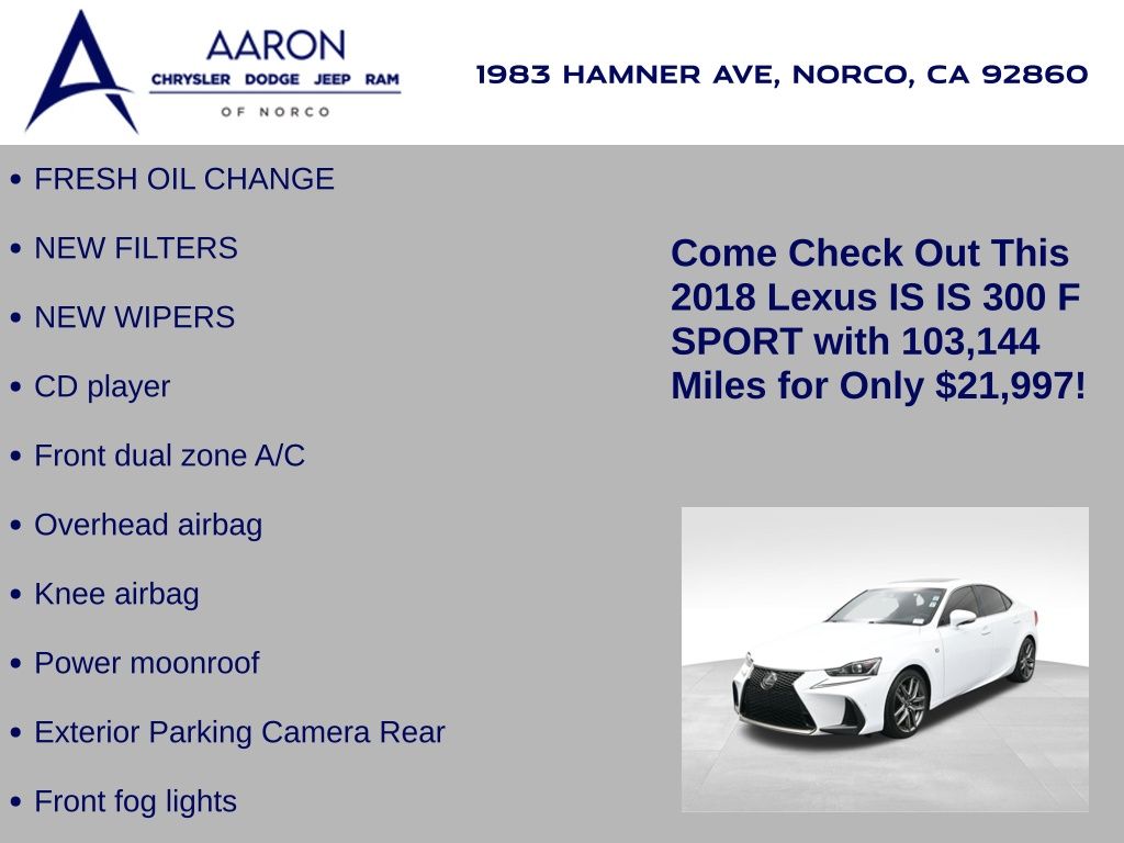 FRESH OIL CHANGE, NEW FILTERS, NEW WIPERS, IS 300, 2.0L I4 Turbocharged, 8-Speed Automatic with Direct Shift, RWD, Alloy wheels, CD player, Exterior Parking Camera Rear, Front dual zone A/C, Front fog lights, Knee airbag, Overhead airbag, Power moonroof, Wheels: 17" x 7.5" Split 5-Spoke Alloy.Clean CARFAX.Awards: * 2018 KBB.com Brand Image Awards * 2018 KBB.com 10 Most Awarded Brands
