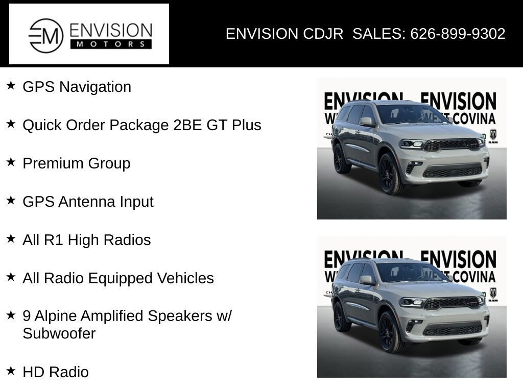 WE SPECIALIZE IN ALL CREDIT PROFILES! See what we can do for you! Call to find out (626) 899-9302.Certified.Odometer is 15201 miles below market average! AWD, #2 Seat Foam Cushion, 1-Year Trial (Registration Required), 10.1" Touchscreen Display, 115V Auxiliary Power Outlet, 180 Amp Alternator, 4G LTE Wi-Fi Hot Spot, 506 Watt Amplifier, 9 Alpine Amplified Speakers w/Subwoofer, Adaptive Cruise Control w/Stop, Advanced Brake Assist, All R1 High Radios, All Radio Equipped Vehicles, Apple CarPlay, Auto High Beam Headlamp Control, Auto-Dimming Exterior Driver Mirror, Black Roof Rails, Body Color Exterior Mirrors, Bright Cargo Area Scuff Pads, Bright Front Door Sill Scuff Pads, Cargo Compartment Cover, Connected Travel & Traffic Services, Disassociated Touchscreen Display, Dual Remote USB Port - Charge Only, Exterior Mirrors w/Heating Element, Exterior Mirrors w/Memory, Exterior Mirrors w/Supplemental Signals, For Details Visit DriveUconnect.com, For More Info, Call 800-643-2112, Full Speed Forward Collision Warning Plus, Global Telematics Box Module (TBM), Google Android Auto, GPS Antenna Input, GPS Navigation, HD Radio, Heated Second Row Seats, Integrated Center Stack Radio, Integrated Roof Rail Crossbars, Integrated Voice Command w/Bluetooth, Lane Departure Warning Plus, Leather Suede Bucket Seats, LED Auxiliary Low Beam & Turn Signal, Power 6x9 Multi-Function Foldaway Mirrors, Power 8-Way Driver Memory 6-Way Passenger Seats, Power Driver/Passenger 4-Way Lumbar Adjust, Power Sunroof, Power Tilt & Telescopic Steering Column, Premium Door Trim Panel, Premium Group, Quick Order Package 2BE GT Plus, Radio: Uconnect 5 Nav w/10.1" Display, Radio/Driver Seat/Mirrors Memory, Rain Sensitive Windshield Wipers, Security Alarm, SiriusXM Guardian - Included Trial (B), SiriusXM Radio Service, SiriusXM Satellite Radio, SiriusXM w/360L, Sun Visors w/Illuminated Vanity Mirrors, Tungsten Accent Stitching, Universal Garage Door Opener, USB Host Flip, Wheels: 20" x 8.0" Fine Silver, Wireless Charging Pad.Destroyer Gray Clearcoat2022 Dodge Durango GT Plus AWD 8-Speed Automatic 3.6L V6 24V VVTFCA US LLC Certified Pre-Owned Details: * Vehicle History * Roadside Assistance * Limited Warranty: 3 Month/3,000 Mile (whichever comes first) after new car warranty expires or from certified purchase date * Powertrain Limited Warranty: 84 Month/100,000 Mile (whichever comes first) from original in-service date * Warranty Deductible: $100 * 125 Point Inspection * Vehicles Up to 75,000 Miles and/or 5 Model Years. 24-Hour Towing & Roadside Assistance, Car Rental Allowance, CARFAX® Vehicle History ReportTM and an Introductory 3-month Subscription to SiriusXM® Satellite Radio & Certified Warranty Upgrades * Transferable Warranty**********All Pricing and Advertised Prices for any/all vehicles offered for sale does not include dealer installed accessories which can be purchased for an additional cost.********** The Factory Rebates may not be available on this vehicle if you elect to take advantage of a Special Alternative APR or Special Lease program. Some Factory Rebates are California Resident specific and may vary for residents of other states. NO sales to Dealers, Brokers or Exporters. For out of state purchase, customers must be present to purchase. If shipping is required, dealership must facilitate; no exceptions. Please contact us for special Multi-Vehicle or Fleet pricing. Prices are plus government fees and taxes, any finance charges, $85 documentary fee, $29 electronic registration fee, any emission testing charge and $1.75 per new tire state tire fee. *** We make every effort to provide accurate information, but please verify before purchasing. Leasing & financing available on approved credit. Trade-ins accepted. Subject to prior sale.