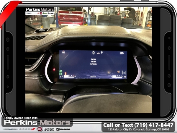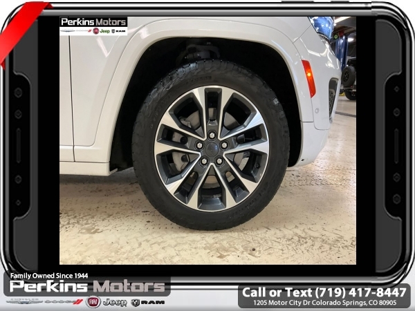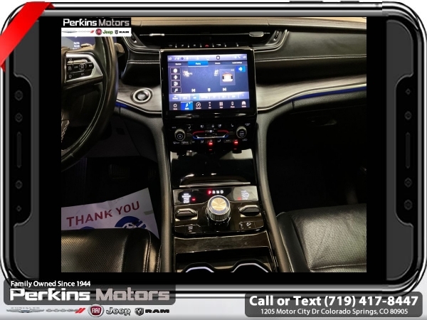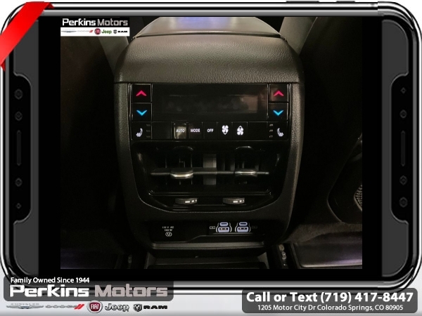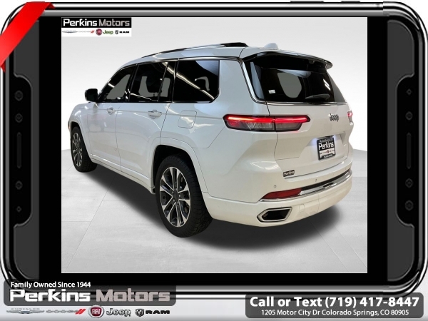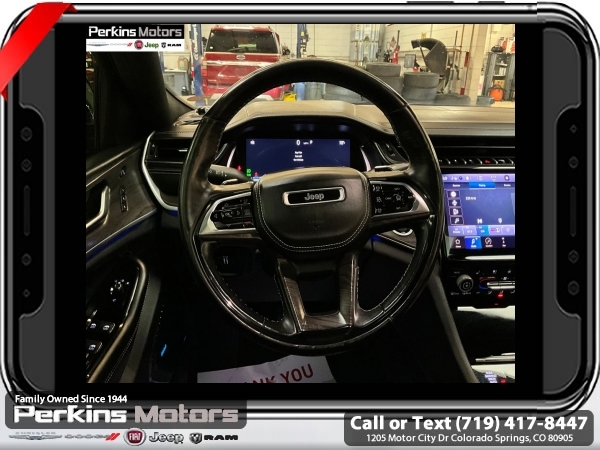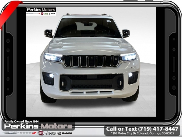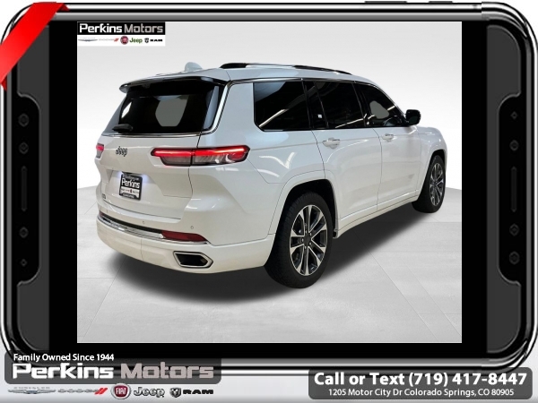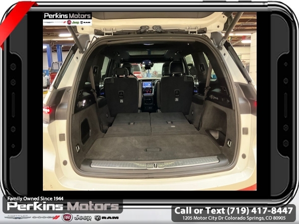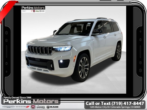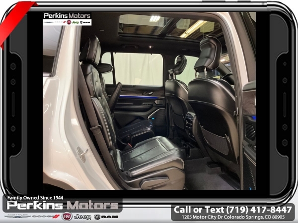 Bright White Clearcoat 4WD 3.6L V6 24V VVT 8-Speed Automatic<br><br><br>Clean CARFAX.<br><br>Check us out at www.perkinsmotors.com to see our specials! Since opening our doors in 1944, we’ve been proud to serve Colorado Springs, CO, and the surrounding areas of Pueblo, Castle Rock and Denver, CO. Throughout this time of being family owned for 80 years, we’ve maintained a firm commitment to our customers: to offer a wide selection of New Chrysler, Dodge, Fiat, Jeep, and Ram vehicles and quality pre-owned vehicles, and provide a quick, no-hassle car-buying process that ensures everyone drives off the lot satisfied with their purchase.<br><br><br>Advanced Protech Group III (Heads-Up Display, Highway Assist System, Integrated Off-Road Camera, Interior Rear Facing Camera, Intersection Collision Assist System, Map-In-Cluster Display, Night Vision/Pedestrian-Animal Detection, Rear Back Up Camera Washer, and Surround View Camera System), Luxury Tech Group IV (2nd Row Manual Window Shades, ATC w/4 Zone Temp Control, Driver Power Seat Back Massage, Front Passenger Power Seat Back Massage, Nappa Leather Seats (TL), Passenger Seat Memory, Power Adjust 12-Way Driver Seat, Power Adjust 12-Way Front Passenger Seat, Rearview Autodim Digital Display Mirror, and Wireless Charging Pad), Quick Order Package 22N, 10 Speakers, 10.1 Touchscreen Display, 19 Speakers High Performance Audio, 3.45 Rear Axle Ratio, 3rd row seats: split-bench, 4-Wheel Disc Brakes, 950 Watt Amplifier, ABS brakes, Adaptive suspension, Air Conditioning, Alloy wheels, AM/FM radio: SiriusXM w/360L, Anti-whiplash front head restraints, Apple CarPlay, Apple CarPlay/Android Auto, Audio memory, Auto High-beam Headlights, Auto-dimming door mirrors, Auto-dimming Rear-View mirror, Auto-leveling suspension, Automatic temperature control, Aux Battery, Brake assist, Bumpers: body-color, Compass, Connected Travel & Traffic Services, Connectivity - US/Canada, Cruise Control, Delay-off headlights, Disassociated Touchscreen Display, Driver door bin, Driver vanity mirror, Dual front impact airbags, Dual front side impact airbags, Electronic Stability Control, Emergency communication system, Four wheel independent suspension, Front anti-roll bar, Front Bucket Seats, Front Center Armrest w/Storage, Front dual zone A/C, Front fog lights, Front License Plate Bracket (DISC), Front reading lights, Fully automatic headlights, Garage door transmitter, Google Android Auto, GPS Antenna Input, GPS Navigation, HD Radio, Heated door mirrors, Heated front seats, Heated rear seats, Heated steering wheel, Illuminated entry, Integrated Center Stack Radio, Integrated Voice Command w/Bluetooth, Knee airbag, Leather steering wheel, Low tire pressure warning, Memory seat, Nappa Leather Seats, Navigation System, Normal Duty Suspension, Occupant sensing airbag, Outside temperature display, Overhead airbag, Overhead console, Panic alarm, ParkView Rear Back-Up Camera, Passenger door bin, Passenger vanity mirror, Power door mirrors, Power driver seat, Power Fold Seatbacks, Power Liftgate, Power moonroof: CommandView, Power passenger seat, Power steering, Power windows, Radio data system, Radio: Uconnect 5 Nav w/10.1 Display, Radio: Uconnect 5 Nav w/8.4 Display, Rain sensing wipers, Rear air conditioning, Rear anti-roll bar, Rear reading lights, Rear window defroster, Rear window wiper, Reclining 3rd row seat, Remote keyless entry, Roof rack: rails only, Security system, SiriusXM Satellite Radio, SiriusXM w/360L, Speed-Sensitive Wipers, Split folding rear seat, Spoiler, Steering wheel memory, Steering wheel mounted audio controls, Tachometer, Telescoping steering wheel, Tilt steering wheel, Traction control, Trip computer, Turn signal indicator mirrors, USB Host Flip, Variably intermittent wipers, Ventilated front seats, Voltmeter, and Wheels: 20 x 8.5 Machined Face Aluminum.
