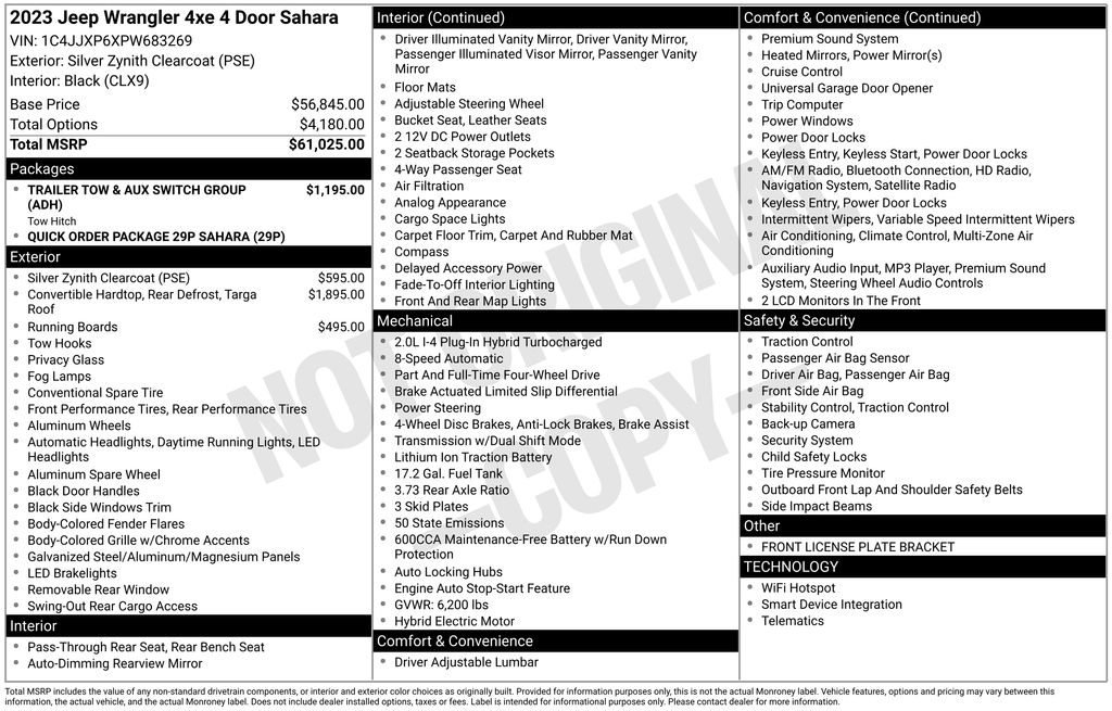 Silver Zynith Clearcoat 2023 Jeep Wrangler Sahara 4xe 4WD 8-Speed Automatic 2.0L I4 DOHC 2.0L I4 DOHC, 7 & 4 Pin Wiring Harness, 700 Amp Maintenance Free Battery, 9 Speakers, Air Conditioning, Auxiliary Switches, Class II Receiver Hitch, Front dual zone A/C, Navigation System, ParkView Rear Back-Up Camera, Quick Order Package 29P Sahara, Radio: Uconnect 4C Nav w/8.4" Display, Remote keyless entry, Trailer Tow & Aux Switch Group, Wheels: 20" x 8" Fully Painted Aluminum.