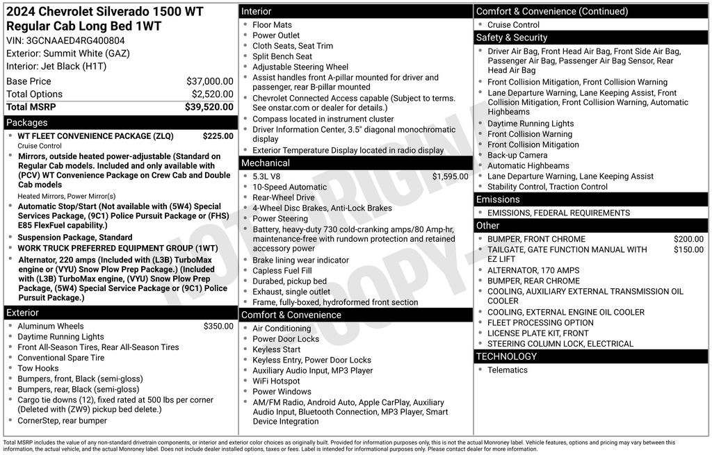 Summit White 2024 Chevrolet Silverado 1500 WT RWD 10-Speed Automatic EcoTec3 5.3L V8 10-Speed Automatic, Black Cloth, 3.5" Monochromatic Display Driver Info Center, Black (Semi-Gloss) Front Bumper, Black (Semi-Gloss) Rear Bumper, Bluetooth® For Phone, Chevrolet Connected Access Capable, Electrical Steering Column Lock, Front Frame-Mounted Black Recovery Hooks, HD Rear Vision Camera, Heated Power-Adjustable Outside Mirrors, Inside Rear-View Mirror w/Tilt, Locking Tailgate, Manual Tailgate Function w/No EZ Lift, Manual Tilt Wheel Steering Column, OnStar & Chevrolet Connected Services Capable, Power Front Windows w/Driver Express Up/Down, Power Front Windows w/Passenger Express Down, Preferred Equipment Group 1WT, Remote Keyless Entry, Rubberized-Vinyl Floor Covering, SiriusXM Delete, Solar Absorbing Tinted Glass, Standard Suspension Package, Standard Tailgate, Wi-Fi Hot Spot Capable.