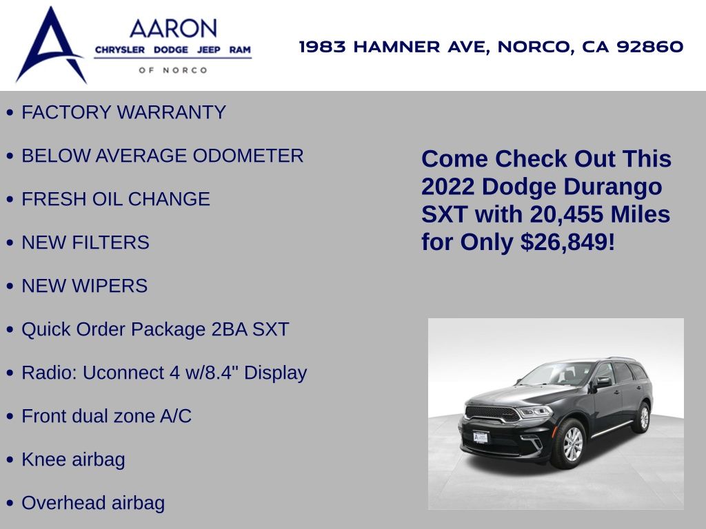 Priced below KBB Fair Purchase Price!FACTORY WARRANTY, BELOW AVERAGE ODOMETER, FRESH OIL CHANGE, NEW FILTERS, NEW WIPERS, Durango SXT, 4D Sport Utility, 3.6L V6 24V VVT, 8-Speed Automatic, RWD, 3rd row seats: split-bench, Alloy wheels, Apple CarPlay/Android Auto, Front dual zone A/C, Front fog lights, Knee airbag, Overhead airbag, ParkView Rear Back-Up Camera, Quick Order Package 2BA SXT, Radio: Uconnect 4 w/8.4" Display, Roof rack, Spoiler, Wheels: 18" x 8.0" Painted Aluminum.Clean CARFAX.CARFAX One-Owner.