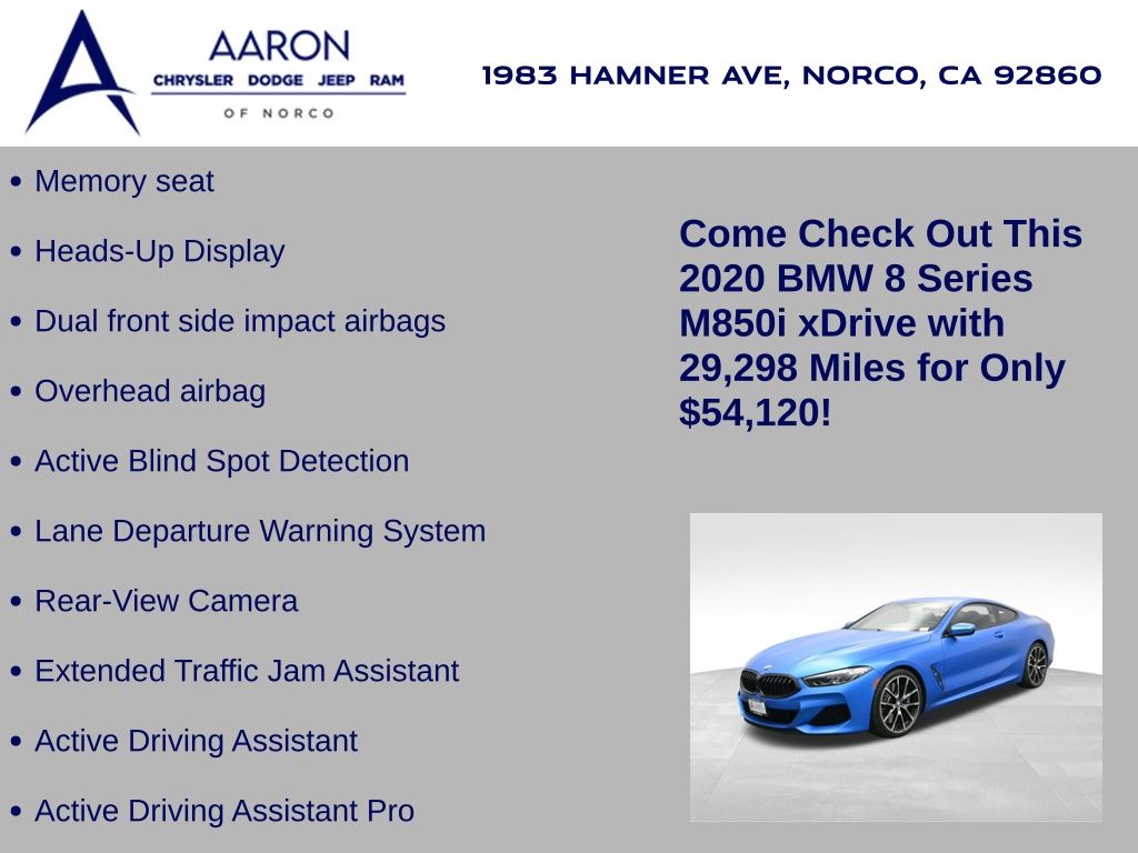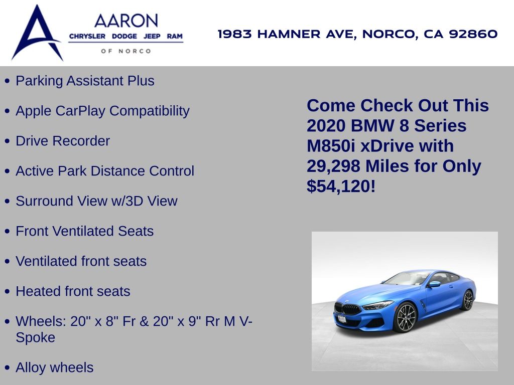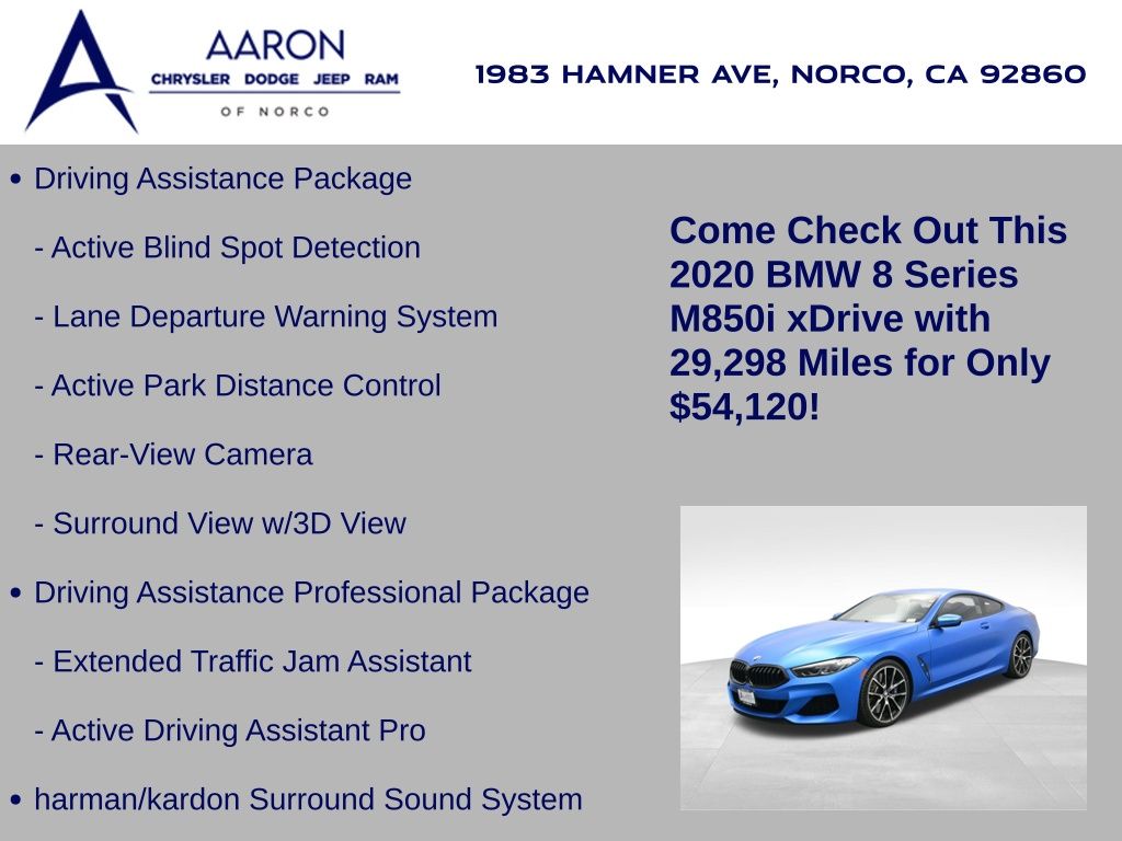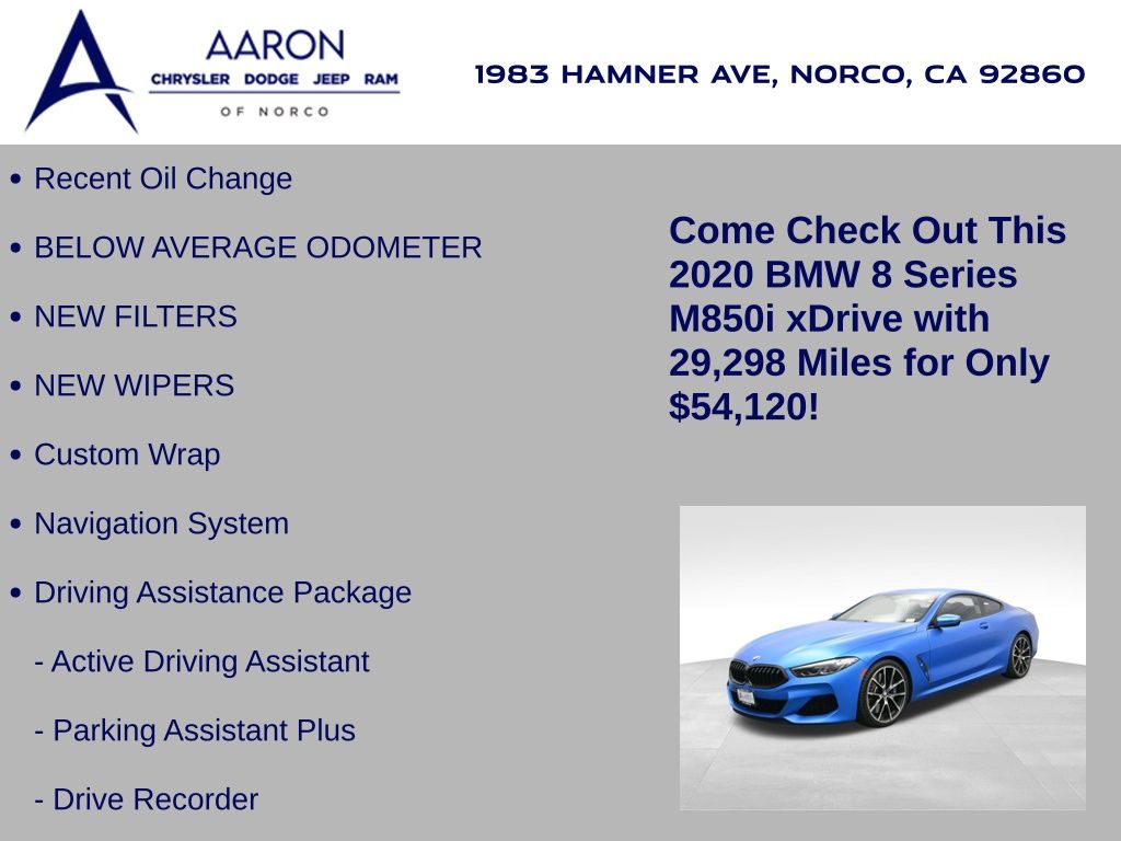 Unleash exhilarating performance and uncompromising luxury with this stunning 2020 BMW M850i xDrive Coupe, a masterclass in engineering, elegance, and cutting-edge technology. Dressed in the exclusive Tanzanite Blue II Metallic paint over a rich Tartufo/Black Extended Merino Leather interior, this grand tourer is powered by a thrilling 4.4L BMW M TwinPower Turbo V8 engine producing 523 horsepower, paired with an 8-speed Sport Automatic transmission and intelligent xDrive all-wheel drive for incredible acceleration and cornering precision in any condition. With just 29,298 miles on the odometer and a well-documented service history, this M850i balances raw power with refined comfort, achieving an EPA-estimated 18 MPG city and 25 MPG highway. Loaded with premium factory options and performance packages totaling over $4,750, this M850i features the coveted Driving Assistance Package and Driving Assistance Pro Package, which equip the vehicle with adaptive cruise control, lane keep assist, blind spot detection, surround view camera with 3D view, front and rear parking sensors, cross-traffic alert, and a head-up display for enhanced situational awareness. The optional Executive Package brings Icon adaptive LED headlights with Laserlight, soft-close doors, ventilated front seats, and rear window shades, adding first-class sophistication. Interior appointments include a Harman Kardon surround sound system, heated and cooled multi-contour seats, BMW Live Cockpit Professional with dual 12.3-inch displays, wireless Apple CarPlay, gesture control, and connected package pro. Technology lovers will appreciate the full suite of BMW ConnectedDrive services, wireless device charging, WiFi hotspot, remote start, and digital key compatibility. Safety and convenience meet in the form of advanced driver assist features, including collision mitigation, front and rear cross-traffic alert, and BMWs intelligent parking systems. From the muscular stance, chrome grille, and aerodynamic lines to the fully adaptive suspension, this M850i is engineered to thrill while cocooning you in a cabin built for the discerning driver. If you've been searching for a true high-performance coupe that offers exclusivity, innovation, and style, this M850i xDrive is a rare opportunity. Call or visit us today and take the wheel of a true statement machine designed to leave a lasting impression.