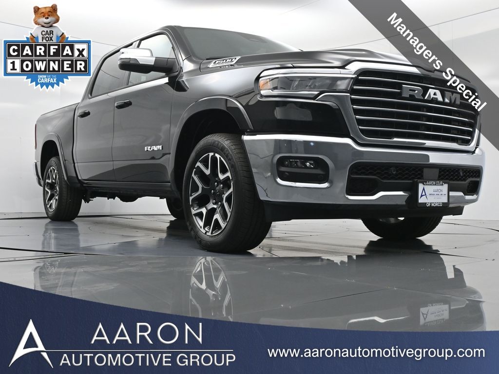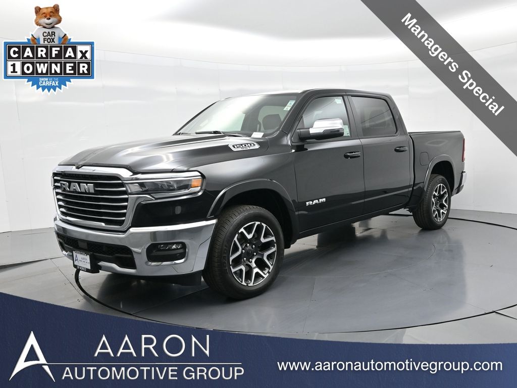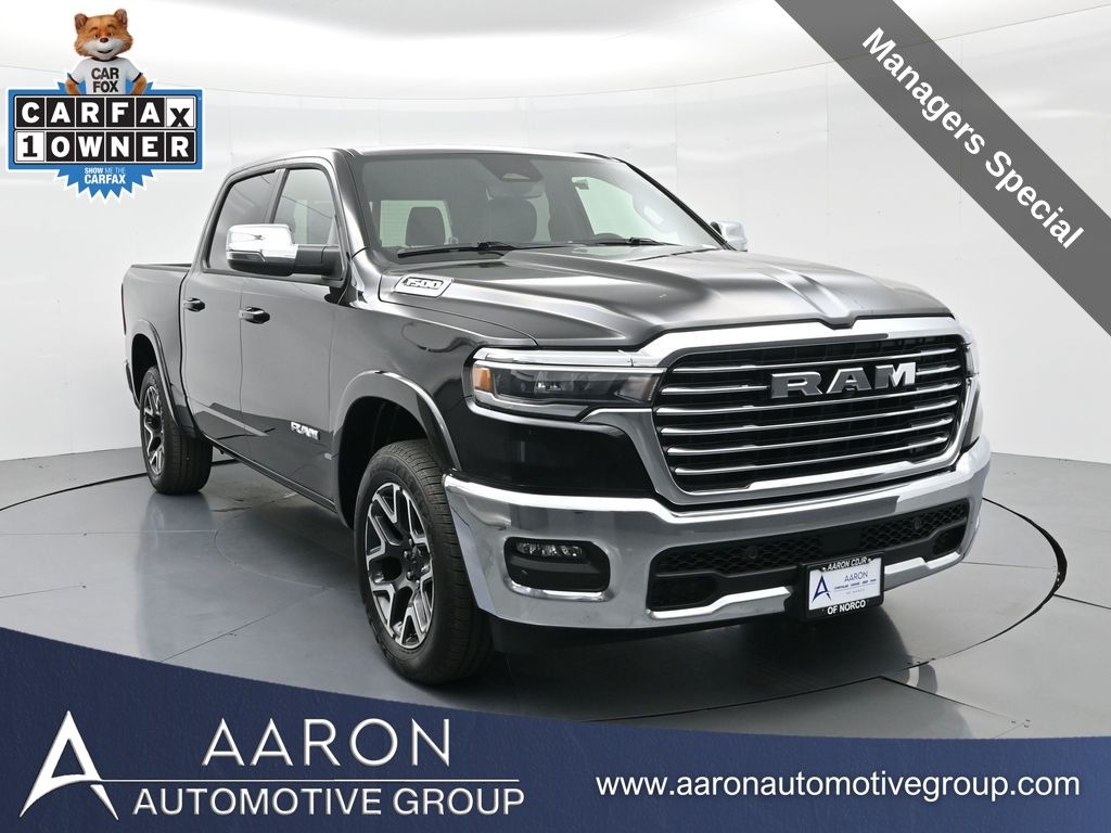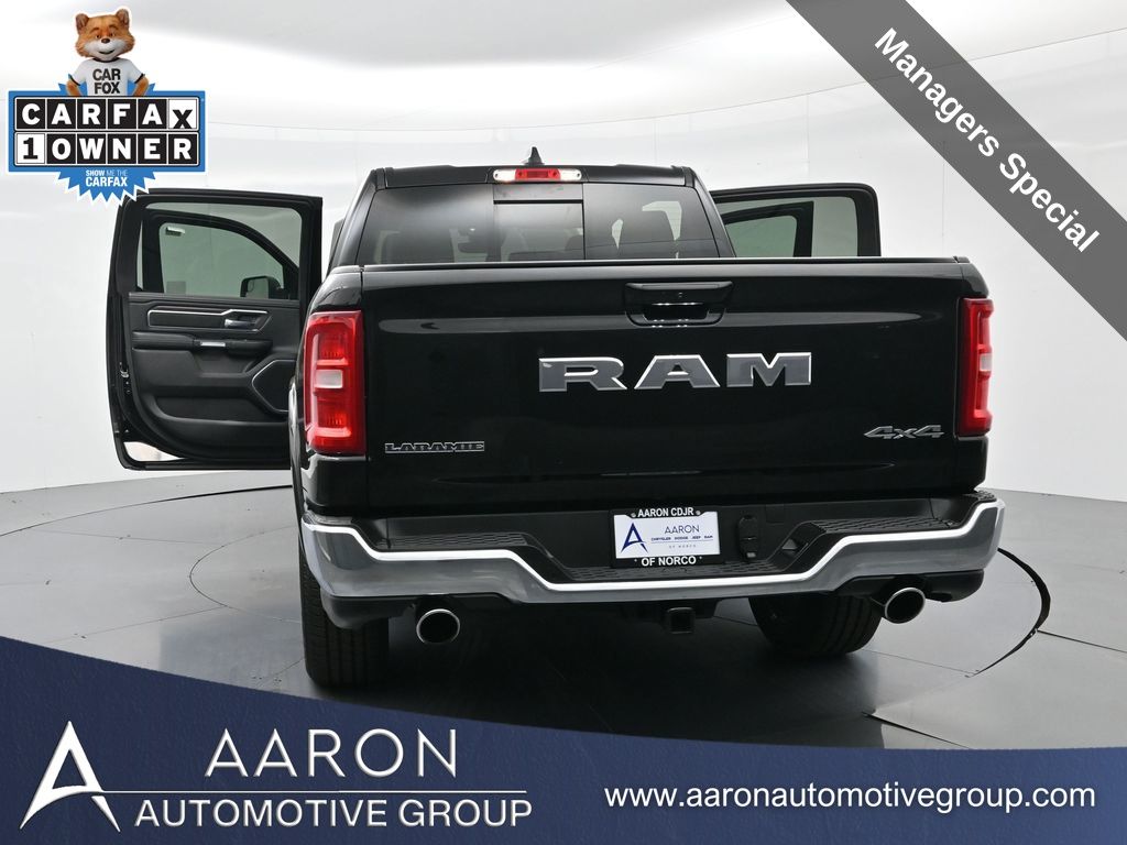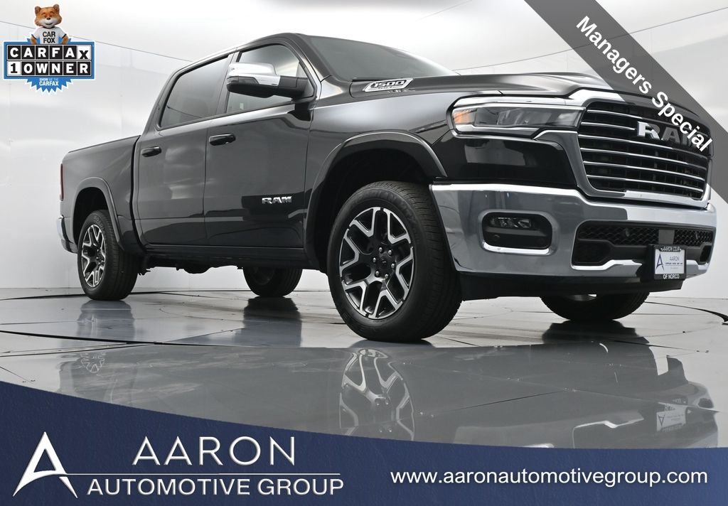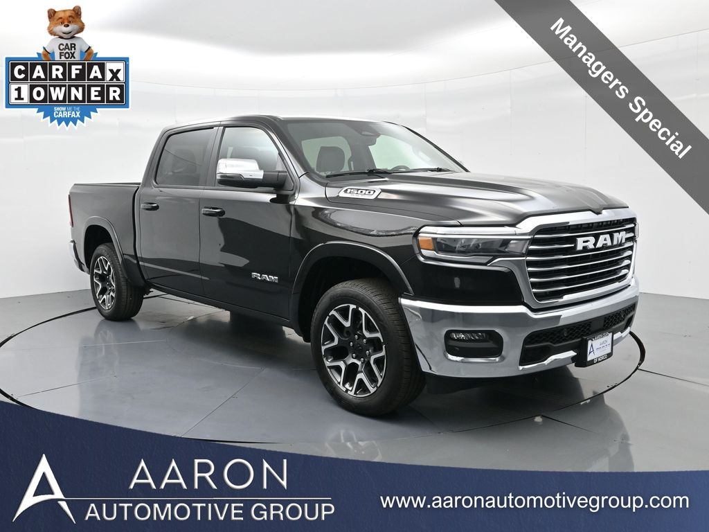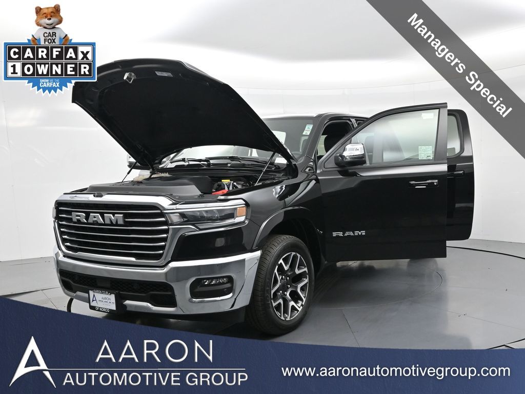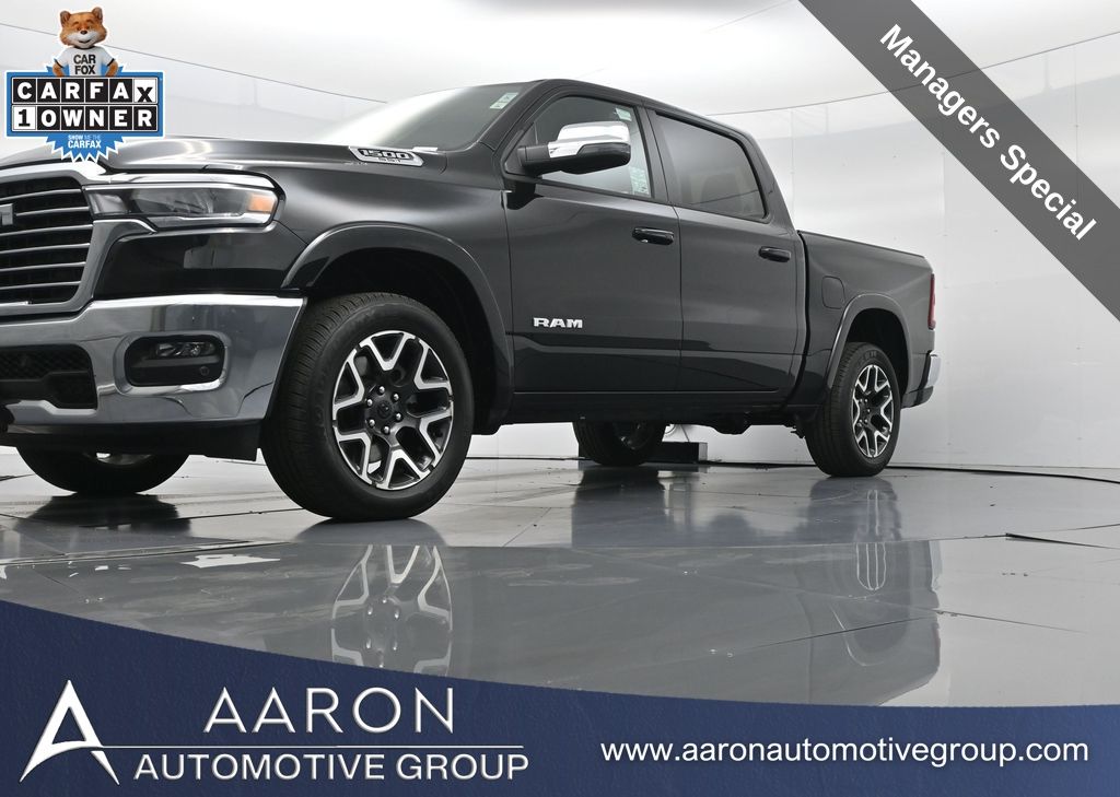 Experience unmatched strength, luxury, and technology in this 2025 Ram 1500 Laramie Crew Cab 4x4, a premium full-size pickup that delivers refined performance and utility from bumper to bumper. With just 10,161 miles, this 1-owner vehicle features a clean Carfax report, no accidents, and a documented service history, making it an outstanding opportunity for drivers seeking like-new reliability and modern capability. Under the hood, the powerful and efficient 3.0L I6 Turbocharged engine pairs with a TorqueFlite 8-speed automatic transmission and electronic shift-on-demand transfer case, producing confident torque and fuel-saving efficiency at an EPA-estimated 19 MPG combined (17 city and 24 highway). Finished in sleek Diamond Black Crystal Pearl-Coat Paint over a luxurious Black leather interior, this Laramie makes a bold statement on and off the road. The truck sits on 20-inch polished aluminum wheels, with LED headlamps, fog lamps, and chrome exterior trim enhancing its commanding presence. Inside, enjoy premium features including heated and ventilated leather front seats, heated rear seats, 8-way power-adjustable driver and passenger seats, Uconnect 5 NAV with 12-inch touchscreen, Apple CarPlay, Android Auto, SiriusXM with 360L, and a 9-amplified speaker Alpine audio system. Technology extends to convenience with remote start, power tailgate, dual-zone automatic climate control, rear power sliding window, and memory driver settings for seat, pedals, and mirrors. Safety features include Full-Speed Forward Collision Warning Plus, Blind Spot and Cross-Path Detection, ParkView rear backup camera, ParkSense front and rear park assist, pedestrian emergency braking, and Rain Brake Support. This truck is also optioned with the Customer Preferred Package 21H and a Diamond Black painted exterior for a sleek, upgraded appearance. Backed by Rams 5-year/60,000-mile powertrain warranty, this low-mileage Laramie 4x4 is ready for whatever the road, job site, or weekend throws your way. When you're ready to invest in something built to last and designed to impress, you can trust this Ram to deliver performance and dependability with every mile.