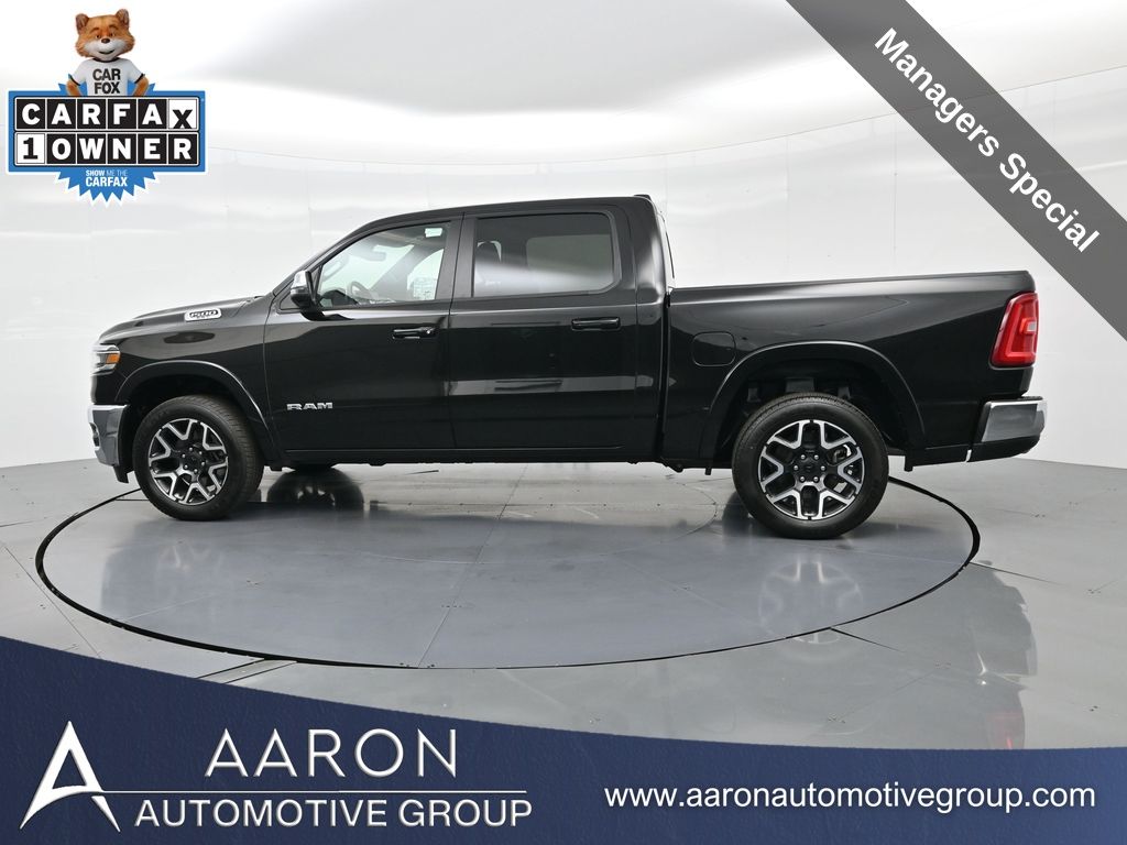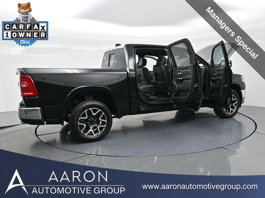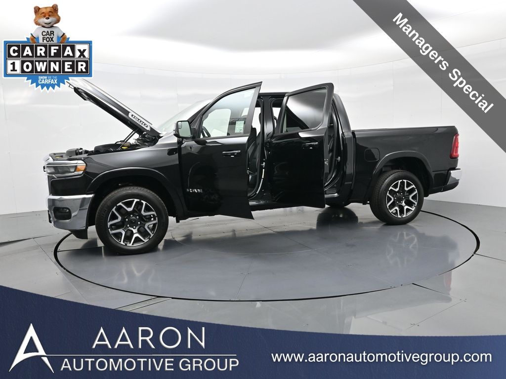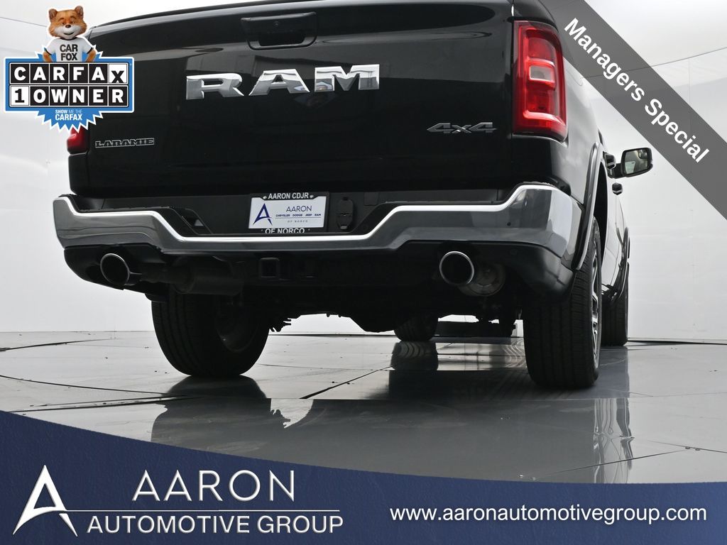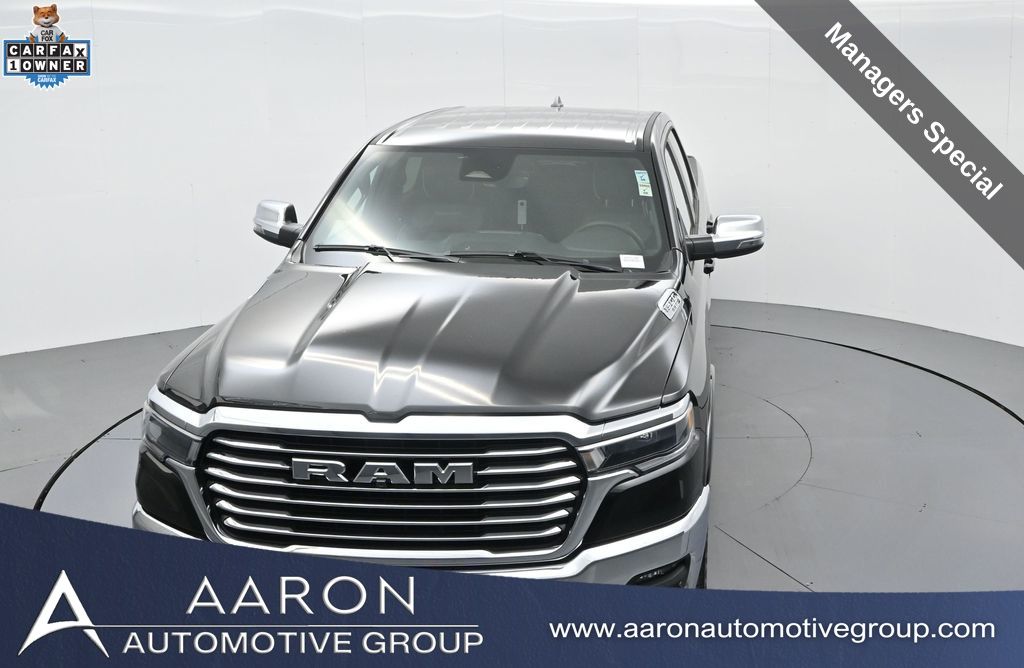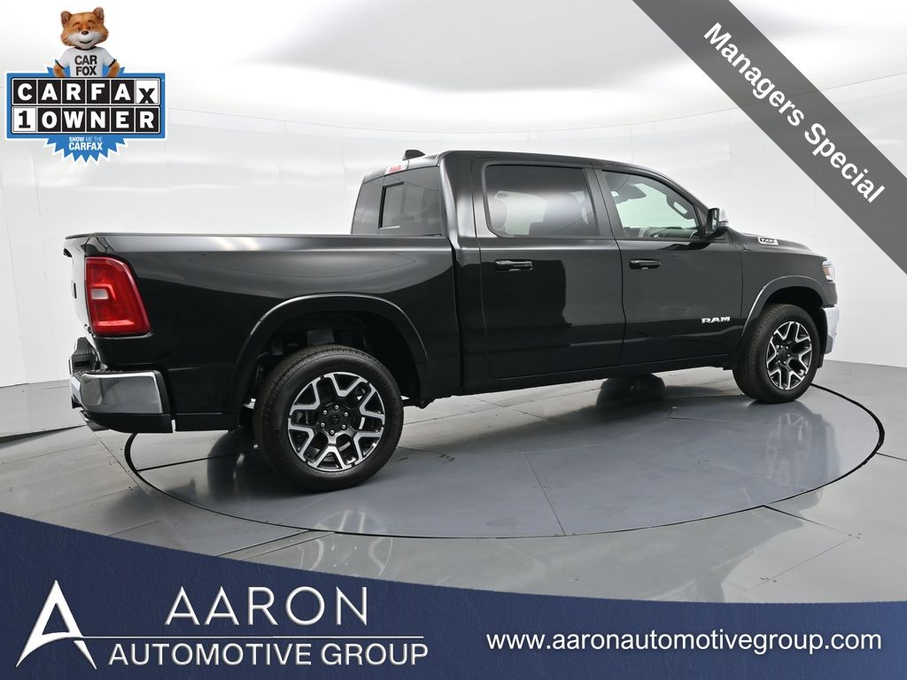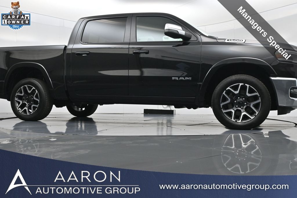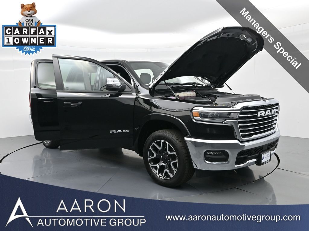 Experience unmatched strength, luxury, and technology in this 2025 Ram 1500 Laramie Crew Cab 4x4, a premium full-size pickup that delivers refined performance and utility from bumper to bumper. With just 10,161 miles, this 1-owner vehicle features a clean Carfax report, no accidents, and a documented service history, making it an outstanding opportunity for drivers seeking like-new reliability and modern capability. Under the hood, the powerful and efficient 3.0L I6 Turbocharged engine pairs with a TorqueFlite 8-speed automatic transmission and electronic shift-on-demand transfer case, producing confident torque and fuel-saving efficiency at an EPA-estimated 19 MPG combined (17 city and 24 highway). Finished in sleek Diamond Black Crystal Pearl-Coat Paint over a luxurious Black leather interior, this Laramie makes a bold statement on and off the road. The truck sits on 20-inch polished aluminum wheels, with LED headlamps, fog lamps, and chrome exterior trim enhancing its commanding presence. Inside, enjoy premium features including heated and ventilated leather front seats, heated rear seats, 8-way power-adjustable driver and passenger seats, Uconnect 5 NAV with 12-inch touchscreen, Apple CarPlay, Android Auto, SiriusXM with 360L, and a 9-amplified speaker Alpine audio system. Technology extends to convenience with remote start, power tailgate, dual-zone automatic climate control, rear power sliding window, and memory driver settings for seat, pedals, and mirrors. Safety features include Full-Speed Forward Collision Warning Plus, Blind Spot and Cross-Path Detection, ParkView rear backup camera, ParkSense front and rear park assist, pedestrian emergency braking, and Rain Brake Support. This truck is also optioned with the Customer Preferred Package 21H and a Diamond Black painted exterior for a sleek, upgraded appearance. Backed by Rams 5-year/60,000-mile powertrain warranty, this low-mileage Laramie 4x4 is ready for whatever the road, job site, or weekend throws your way. When you're ready to invest in something built to last and designed to impress, you can trust this Ram to deliver performance and dependability with every mile.