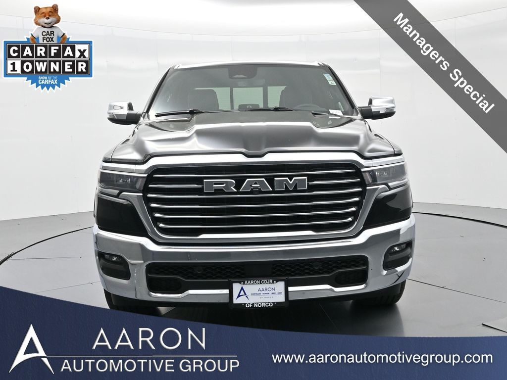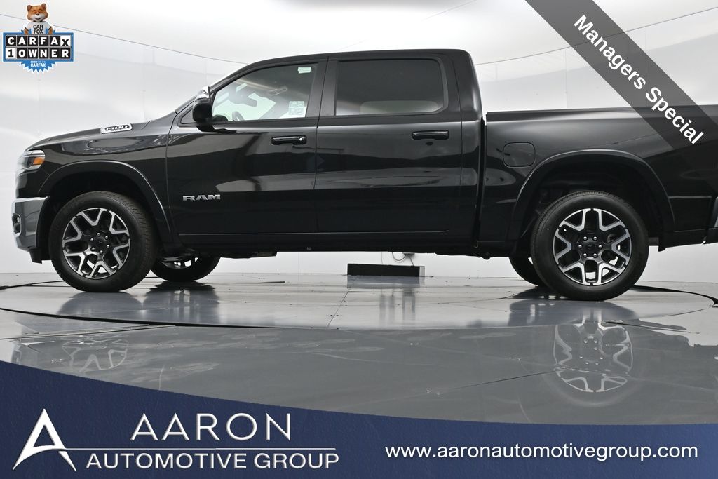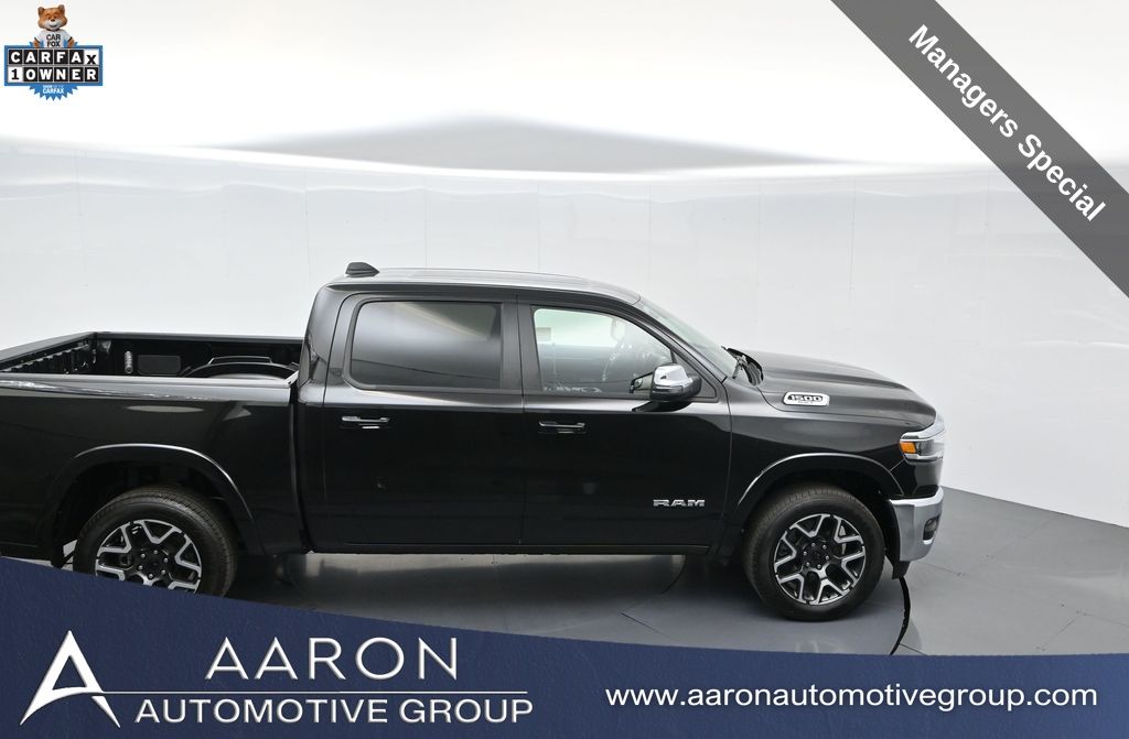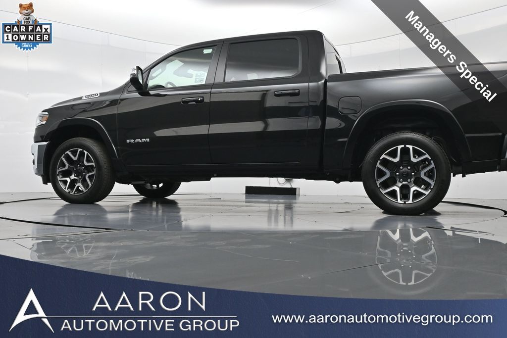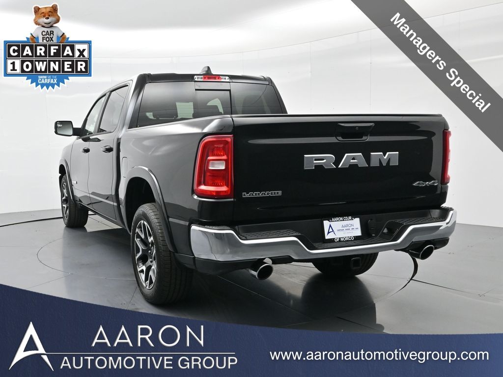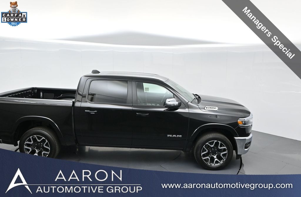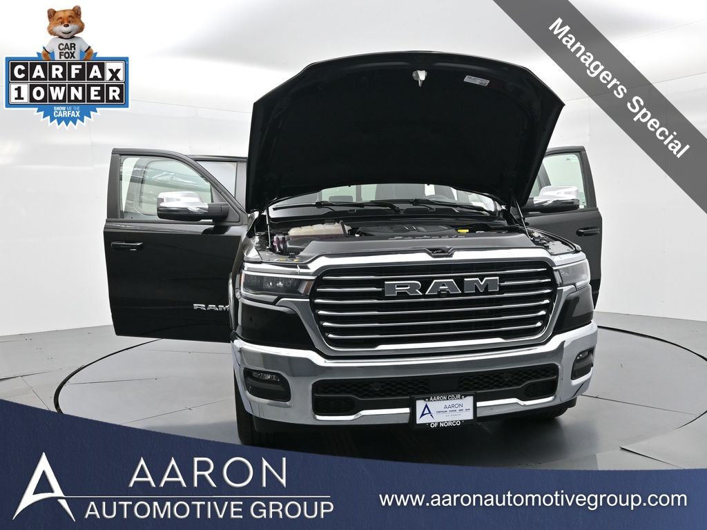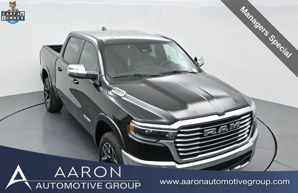 Experience unmatched strength, luxury, and technology in this 2025 Ram 1500 Laramie Crew Cab 4x4, a premium full-size pickup that delivers refined performance and utility from bumper to bumper. With just 10,161 miles, this 1-owner vehicle features a clean Carfax report, no accidents, and a documented service history, making it an outstanding opportunity for drivers seeking like-new reliability and modern capability. Under the hood, the powerful and efficient 3.0L I6 Turbocharged engine pairs with a TorqueFlite 8-speed automatic transmission and electronic shift-on-demand transfer case, producing confident torque and fuel-saving efficiency at an EPA-estimated 19 MPG combined (17 city and 24 highway). Finished in sleek Diamond Black Crystal Pearl-Coat Paint over a luxurious Black leather interior, this Laramie makes a bold statement on and off the road. The truck sits on 20-inch polished aluminum wheels, with LED headlamps, fog lamps, and chrome exterior trim enhancing its commanding presence. Inside, enjoy premium features including heated and ventilated leather front seats, heated rear seats, 8-way power-adjustable driver and passenger seats, Uconnect 5 NAV with 12-inch touchscreen, Apple CarPlay, Android Auto, SiriusXM with 360L, and a 9-amplified speaker Alpine audio system. Technology extends to convenience with remote start, power tailgate, dual-zone automatic climate control, rear power sliding window, and memory driver settings for seat, pedals, and mirrors. Safety features include Full-Speed Forward Collision Warning Plus, Blind Spot and Cross-Path Detection, ParkView rear backup camera, ParkSense front and rear park assist, pedestrian emergency braking, and Rain Brake Support. This truck is also optioned with the Customer Preferred Package 21H and a Diamond Black painted exterior for a sleek, upgraded appearance. Backed by Rams 5-year/60,000-mile powertrain warranty, this low-mileage Laramie 4x4 is ready for whatever the road, job site, or weekend throws your way. When you're ready to invest in something built to last and designed to impress, you can trust this Ram to deliver performance and dependability with every mile.