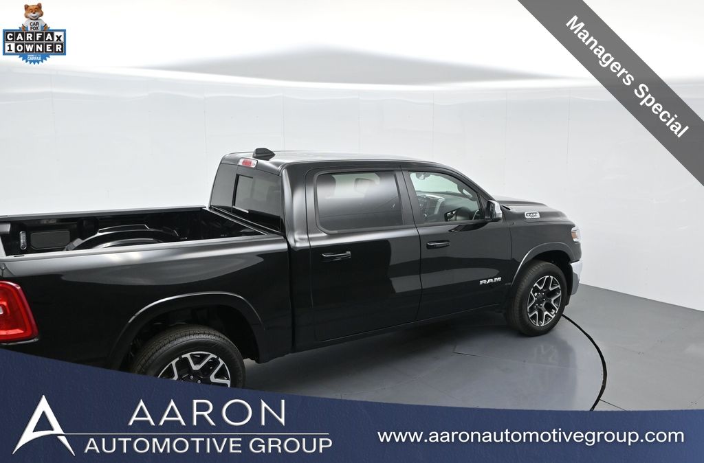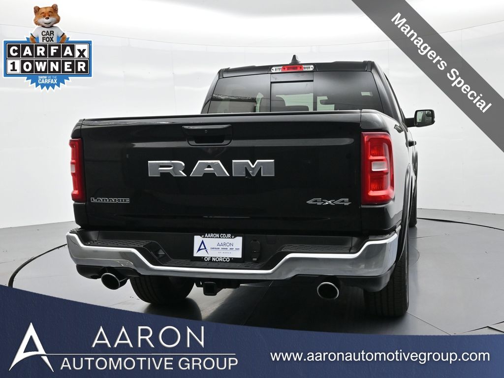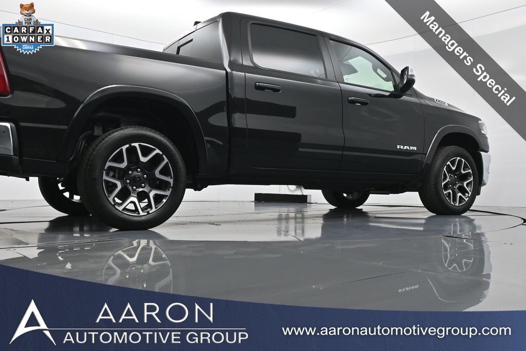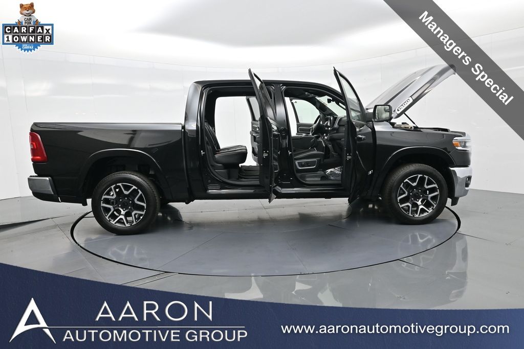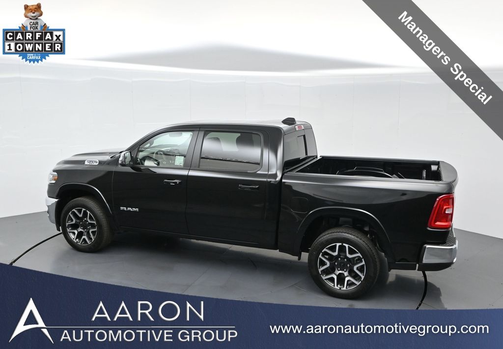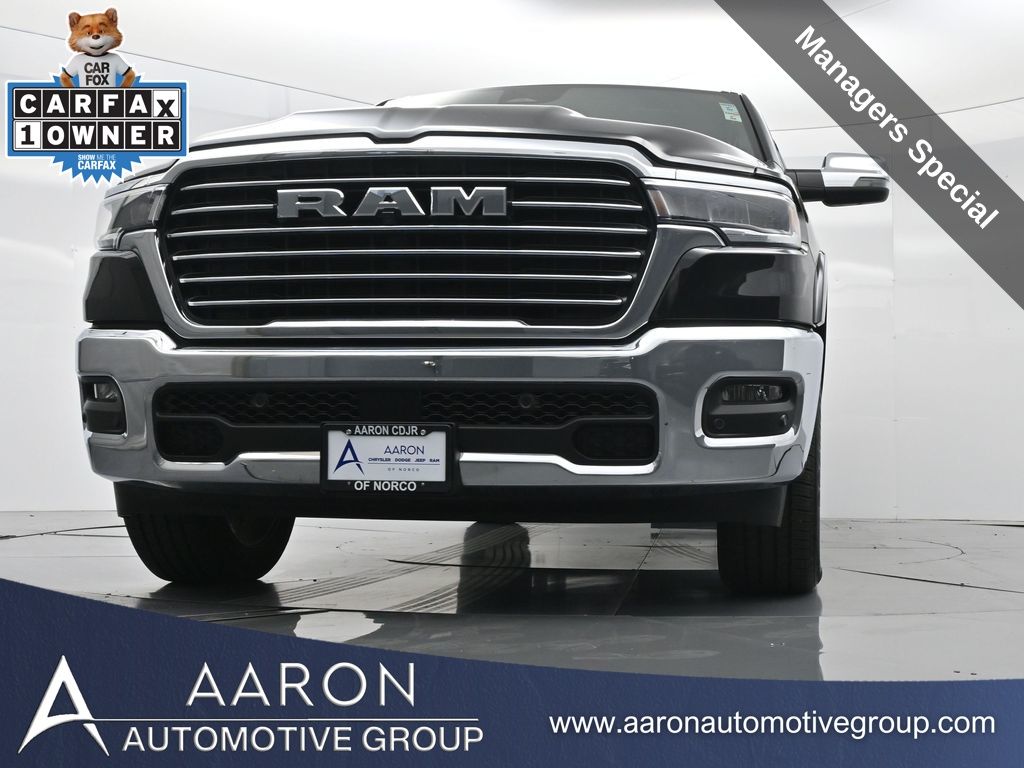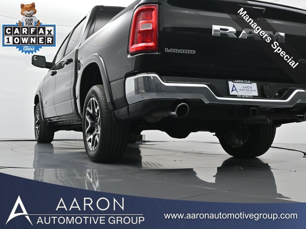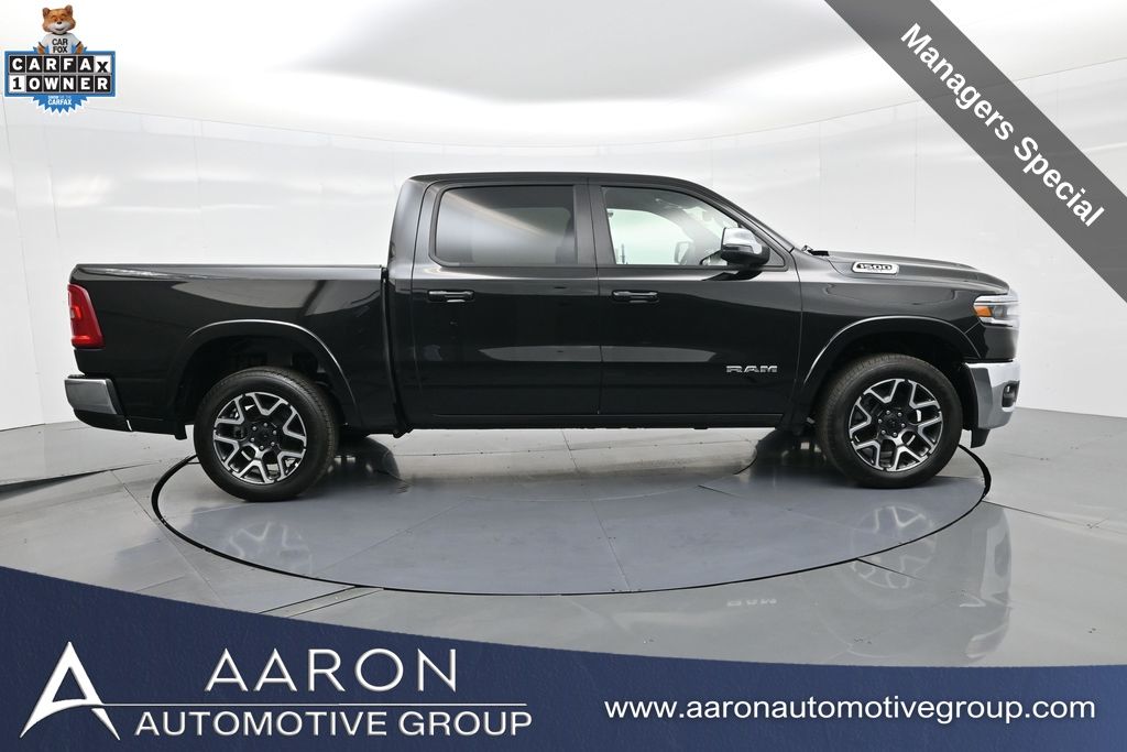 Experience unmatched strength, luxury, and technology in this 2025 Ram 1500 Laramie Crew Cab 4x4, a premium full-size pickup that delivers refined performance and utility from bumper to bumper. With just 10,161 miles, this 1-owner vehicle features a clean Carfax report, no accidents, and a documented service history, making it an outstanding opportunity for drivers seeking like-new reliability and modern capability. Under the hood, the powerful and efficient 3.0L I6 Turbocharged engine pairs with a TorqueFlite 8-speed automatic transmission and electronic shift-on-demand transfer case, producing confident torque and fuel-saving efficiency at an EPA-estimated 19 MPG combined (17 city and 24 highway). Finished in sleek Diamond Black Crystal Pearl-Coat Paint over a luxurious Black leather interior, this Laramie makes a bold statement on and off the road. The truck sits on 20-inch polished aluminum wheels, with LED headlamps, fog lamps, and chrome exterior trim enhancing its commanding presence. Inside, enjoy premium features including heated and ventilated leather front seats, heated rear seats, 8-way power-adjustable driver and passenger seats, Uconnect 5 NAV with 12-inch touchscreen, Apple CarPlay, Android Auto, SiriusXM with 360L, and a 9-amplified speaker Alpine audio system. Technology extends to convenience with remote start, power tailgate, dual-zone automatic climate control, rear power sliding window, and memory driver settings for seat, pedals, and mirrors. Safety features include Full-Speed Forward Collision Warning Plus, Blind Spot and Cross-Path Detection, ParkView rear backup camera, ParkSense front and rear park assist, pedestrian emergency braking, and Rain Brake Support. This truck is also optioned with the Customer Preferred Package 21H and a Diamond Black painted exterior for a sleek, upgraded appearance. Backed by Rams 5-year/60,000-mile powertrain warranty, this low-mileage Laramie 4x4 is ready for whatever the road, job site, or weekend throws your way. When you're ready to invest in something built to last and designed to impress, you can trust this Ram to deliver performance and dependability with every mile.