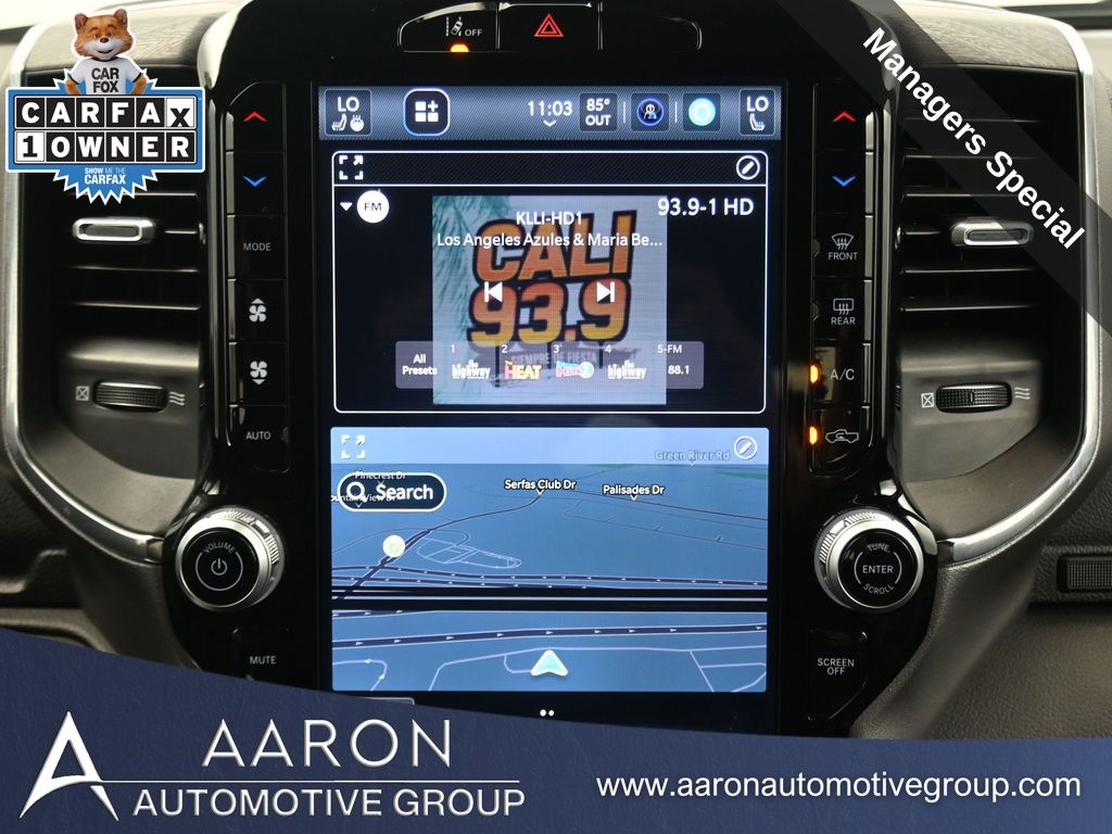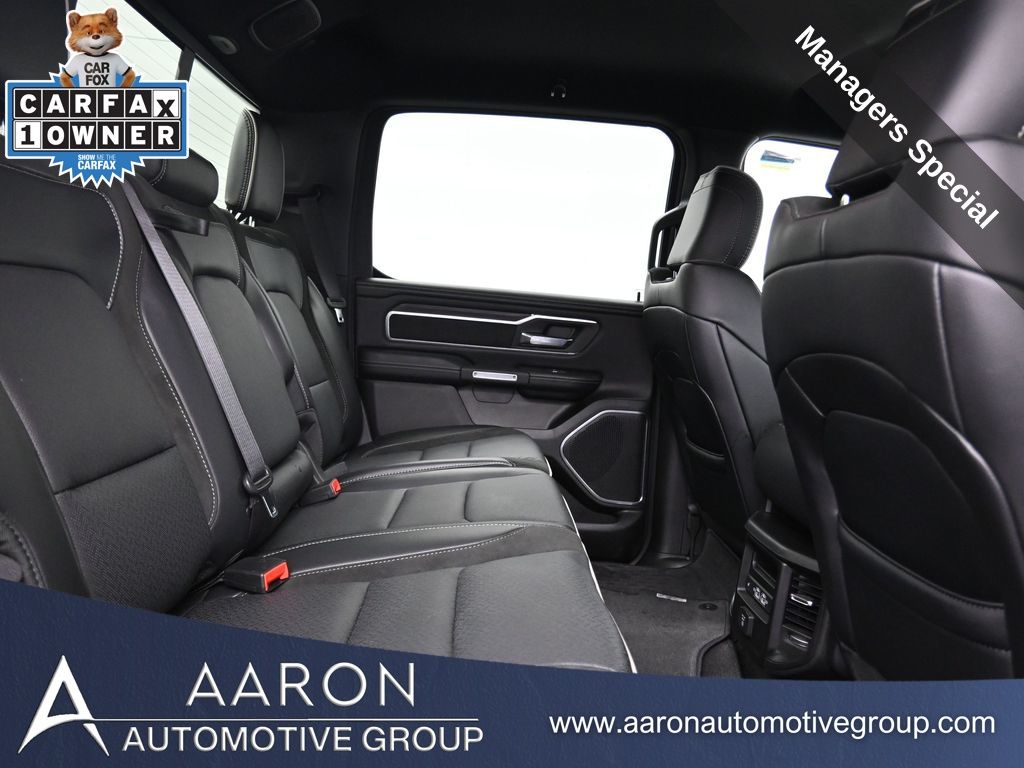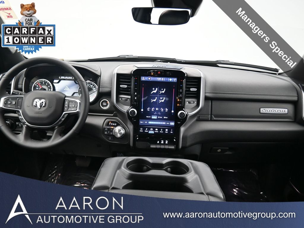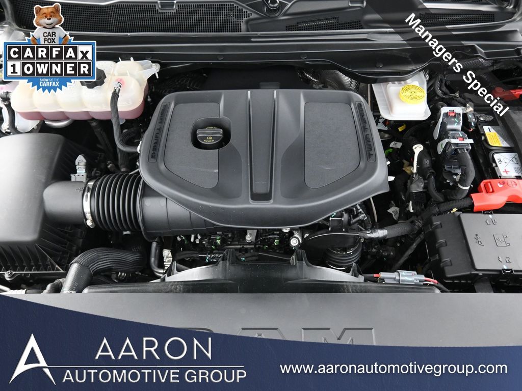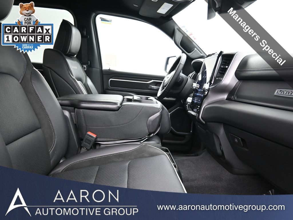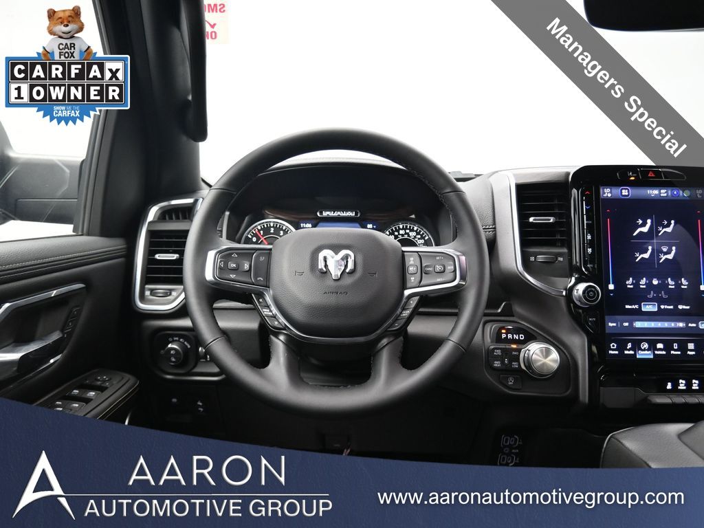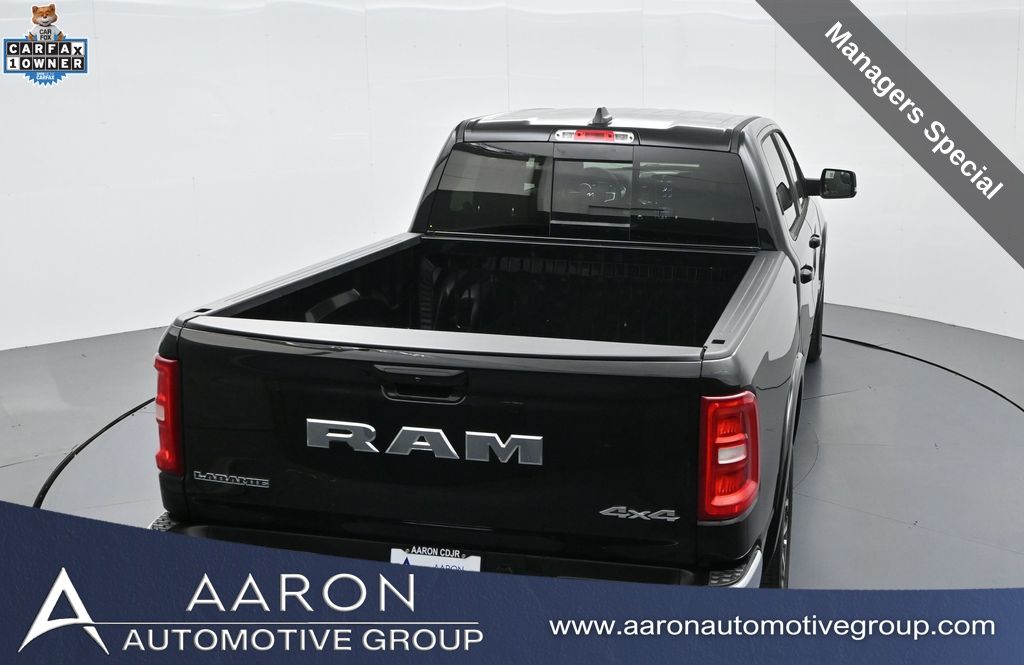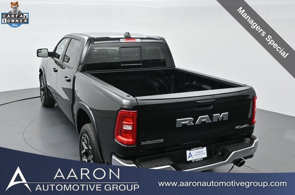 Experience unmatched strength, luxury, and technology in this 2025 Ram 1500 Laramie Crew Cab 4x4, a premium full-size pickup that delivers refined performance and utility from bumper to bumper. With just 10,161 miles, this 1-owner vehicle features a clean Carfax report, no accidents, and a documented service history, making it an outstanding opportunity for drivers seeking like-new reliability and modern capability. Under the hood, the powerful and efficient 3.0L I6 Turbocharged engine pairs with a TorqueFlite 8-speed automatic transmission and electronic shift-on-demand transfer case, producing confident torque and fuel-saving efficiency at an EPA-estimated 19 MPG combined (17 city and 24 highway). Finished in sleek Diamond Black Crystal Pearl-Coat Paint over a luxurious Black leather interior, this Laramie makes a bold statement on and off the road. The truck sits on 20-inch polished aluminum wheels, with LED headlamps, fog lamps, and chrome exterior trim enhancing its commanding presence. Inside, enjoy premium features including heated and ventilated leather front seats, heated rear seats, 8-way power-adjustable driver and passenger seats, Uconnect 5 NAV with 12-inch touchscreen, Apple CarPlay, Android Auto, SiriusXM with 360L, and a 9-amplified speaker Alpine audio system. Technology extends to convenience with remote start, power tailgate, dual-zone automatic climate control, rear power sliding window, and memory driver settings for seat, pedals, and mirrors. Safety features include Full-Speed Forward Collision Warning Plus, Blind Spot and Cross-Path Detection, ParkView rear backup camera, ParkSense front and rear park assist, pedestrian emergency braking, and Rain Brake Support. This truck is also optioned with the Customer Preferred Package 21H and a Diamond Black painted exterior for a sleek, upgraded appearance. Backed by Rams 5-year/60,000-mile powertrain warranty, this low-mileage Laramie 4x4 is ready for whatever the road, job site, or weekend throws your way. When you're ready to invest in something built to last and designed to impress, you can trust this Ram to deliver performance and dependability with every mile.
