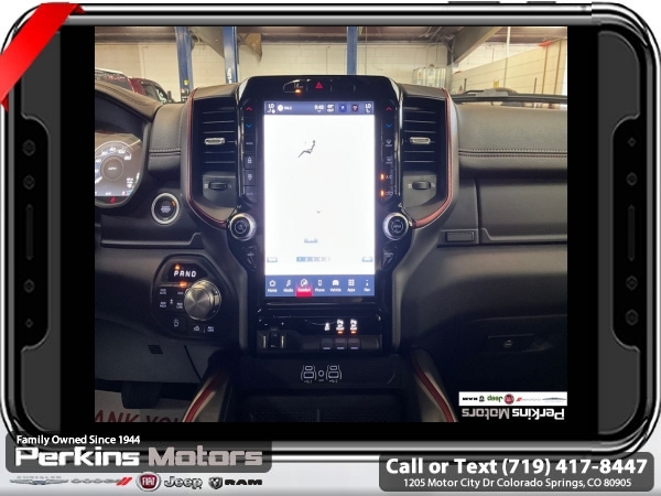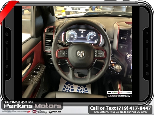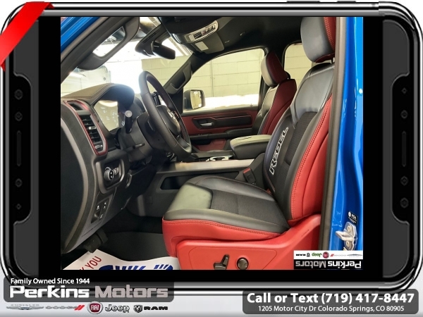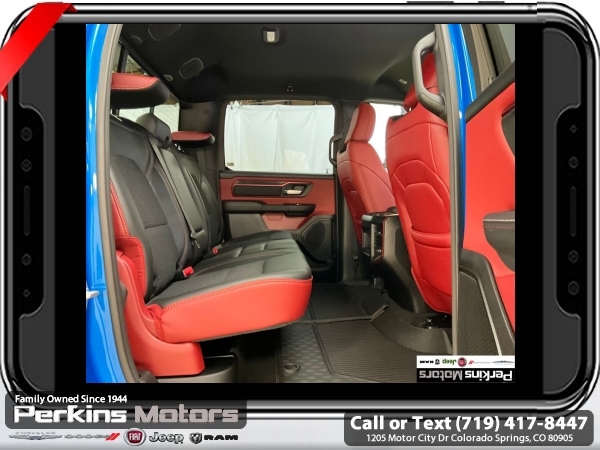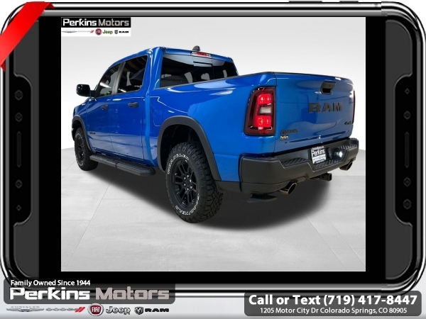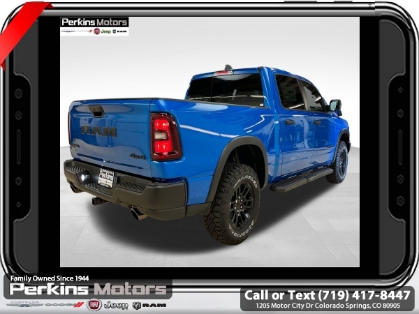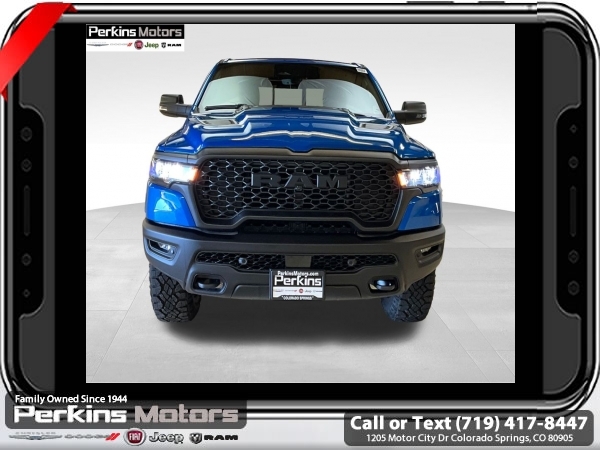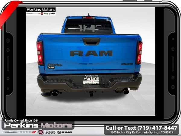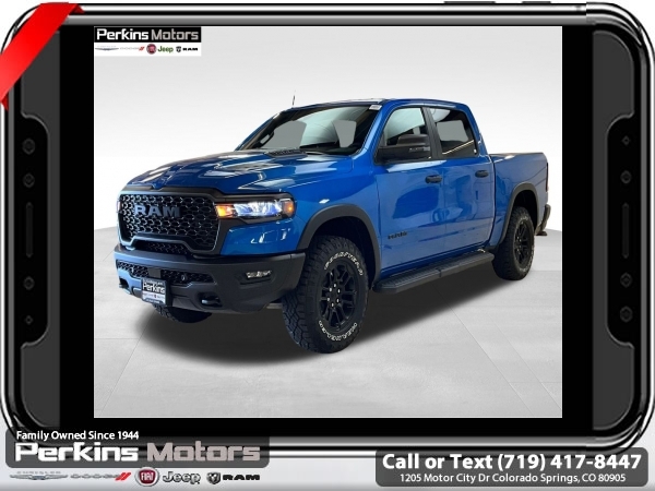 Factory MSRP: $68,615 $10,176 off MSRP! Priced below KBB Fair Purchase Price! Hydro Blue Pearlcoat 2025 Ram 1500 Rebel 4WD 8-Speed Automatic 3.0L I6<br><br>Check us out at www.perkinsmotors.com to see our specials! Since opening our doors in 1944, we’ve been proud to serve Colorado Springs, CO, and the surrounding areas of Pueblo, Castle Rock and Denver, CO. Throughout this time of being family owned for 80 years, we’ve maintained a firm commitment to our customers: to offer a wide selection of New Chrysler, Dodge, Fiat, Jeep, and Ram vehicles and quality pre-owned vehicles, and provide a quick, no-hassle car-buying process that ensures everyone drives off the lot satisfied with their purchase.<br><br>Bed Utility Group (Exterior 115V AC Outlet, MOPAR 4 Adjustable Cargo Tie-Down Hooks, and MOPAR Spray In Bedliner), Quick Order Package 21W Rebel, Rebel Level 1 Equipment Group (Auto Power-Folding Mirrors, Auto-Dimming Exterior Driver Mirror, Black Premium Power Mirrors, Convex Wide-Angle Exterior Mirror Insert, Exterior Mirrors Courtesy Lamps, Exterior Mirrors w/Heating Element, Exterior Mirrors w/Supplemental Signals, Power Adjustable Pedals, Rear Window Defroster, Remote Tailgate Release, and Wireless Charging Pad), 10 Speakers, 3.92 Rear Axle Ratio, 33 Gallon Fuel Tank, 4 Way Front Headrests, 4-Wheel Disc Brakes, 4G LTE Wi-Fi Hot Spot, ABS brakes, Air Conditioning, Alloy wheels, AM/FM radio: SiriusXM with 360L, Apple CarPlay, Apple CarPlay/Android Auto, Auto High-beam Headlights, Auto-dimming Rear-View mirror, Automatic temperature control, Brake assist, Bucket Seats, Cloth/Vinyl Bucket Seats, Compass, Connected Travel & Traffic Services, Connectivity - US/Canada, Cruise Control, Delay-off headlights, Driver door bin, Driver vanity mirror, Dual front impact airbags, Dual front side impact airbags, Electronic Stability Control, Front anti-roll bar, Front Bucket Seats, Front Center Armrest w/Storage, Front dual zone A/C, Front fog lights, Front License Plate Bracket, Front reading lights, Front Seat Back Map Pockets, Front wheel independent suspension, Full Length Upgraded Floor Console, Fully automatic headlights, Garage door transmitter, Google Android Auto, GPS Antenna Input, GPS Navigation, Heated door mirrors, Heated front seats, Heated steering wheel, Illuminated entry, Integrated Voice Command w/Bluetooth, Leather steering wheel, Low tire pressure warning, Manual Folding Exterior Mirrors, Manufacturer's Statement of Origin, Mopar Black Tubular Side Steps, Navigation System, Occupant sensing airbag, Outside temperature display, Overhead airbag, Overhead console, Panic alarm, ParkView Rear Back-Up Camera, Passenger door bin, Passenger vanity mirror, Power Adjust 8-Way Driver Seat, Power door mirrors, Power driver seat, Power steering, Power windows, Radio data system, Radio: Uconnect 5 Nav w/12.0 Display, Rear 60/40 Folding Seat, Rear anti-roll bar, Rear seat center armrest, Rear step bumper, Remote keyless entry, SiriusXM w/360L, Split folding rear seat, Steering wheel mounted audio controls, Tachometer, Telescoping steering wheel, Tilt steering wheel, Traction control, Trailer Brake Control, Trip computer, USB Host Flip, Variably intermittent wipers, Voltmeter, and Wheels: 18 x 8.0 Painted Mid-Gloss Black. Sale price includes all manufacture's incentives and dealer discounts. Sale price not available on lease or compatible with special APR. $2000 - 2025 National Retail Consumer Cash. Exp. 06/30/2025 $6176 - 2025 National Minimum Employee Pricing Discount. Exp. 06/30/2025