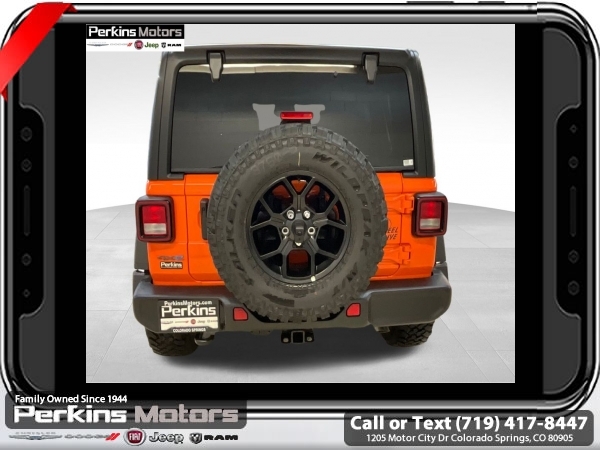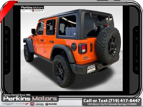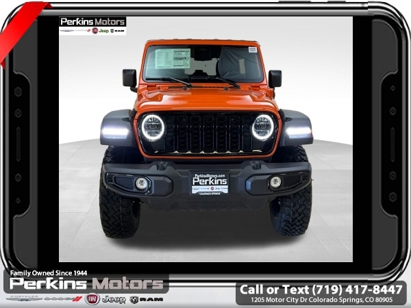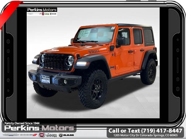 Factory MSRP: $62,895 $7,331 off MSRP! Joose 2025 Jeep Wrangler Willys 4xe 4WD 8-Speed Automatic 2.0L I4 DOHC<br>2.0L I4 DOHC.<br>Check us out at www.perkinsmotors.com to see our specials! Since opening our doors in 1944, we’ve been proud to serve Colorado Springs, CO, and the surrounding areas of Pueblo, Castle Rock and Denver, CO. Throughout this time of being family owned for 80 years, we’ve maintained a firm commitment to our customers: to offer a wide selection of New Chrysler, Dodge, Fiat, Jeep, and Ram vehicles and quality pre-owned vehicles, and provide a quick, no-hassle car-buying process that ensures everyone drives off the lot satisfied with their purchase.<br><br>Convenience Group (2-Door Passive Entry, Front Door Locks, Air Conditioning w/Auto Temperature Control, Air Filtering, Emergency/Assistance Call, Heated Front Seats, Heated Steering Wheel, Remote Start System, and Universal Garage Door Opener), Quick Order Package 29W Willys 4xe (4-Wheel Drive Swing Gate Decal, 4.10 Rear Axle Ratio, 7 & 4 Pin Wiring Harness, 97 MPH Vehicle Max Speed Calibration, Auxiliary Switches, Black Grille, Class II Receiver Hitch, Conventional Differential Front Axle, E-Locker Rear Axle, Front LED Fog Lamps, LED Premium Reflector Headlamps, Molded in Color Rubicon Highline Flare, MOPAR All-Weather Floor Mats, Off-Road Plus Mode, Wheels: 17 x 7.5 Painted Black, Willy's Suspension, and Willys 4xe Hood Decal), 2.0L I4 DOHC, 3.73 Rear Axle Ratio, 4-Wheel Disc Brakes, 8 Speakers, ABS brakes, Air Conditioning, Alloy wheels, AM/FM radio: SiriusXM, Apple CarPlay/Android Auto, Black 3-Piece Hard Top, Brake assist, Cloth Low-Back Bucket Seats, Compass, Cruise Control, Delay-off headlights, Driver door bin, Driver vanity mirror, Dual front impact airbags, Dual front side impact airbags, Electronic Stability Control, Freedom Panel Storage Bag, Front anti-roll bar, Front Bucket Seats, Front Center Armrest w/Storage, Front fog lights, Front License Plate Bracket (DISC), Front reading lights, Fully automatic headlights, Heated door mirrors, Illuminated entry, Integrated roll-over protection, Low tire pressure warning, MOPAR Hardtop Headliner, MOPAR Plastic Door Sill Guards, Occupant sensing airbag, Outside temperature display, Overhead airbag, Panic alarm, ParkView Rear Back-Up Camera, Passenger door bin, Passenger vanity mirror, Power door mirrors, Power steering, Power windows, Radio data system, Radio: Uconnect 5 w/12.3 Display, Rear anti-roll bar, Rear reading lights, Rear Window Defroster, Rear Window Wiper/Washer, Remote keyless entry, Security system, Split folding rear seat, Sport Suspension, Steering wheel mounted audio controls, Tachometer, Telescoping steering wheel, Tilt steering wheel, Traction control, Trip computer, Variably intermittent wipers, Voltmeter, and Wheels: 20 x 8 Machined/Painted Gray. Sale price includes all manufacture's incentives and dealer discounts. Sale price not available on lease or compatible with special APR. $2000 - 2025 National Retail Consumer Cash. Exp. 06/30/2025 $3646 - 2025 National Minimum Employee Pricing Discount. Exp. 06/30/2025