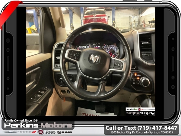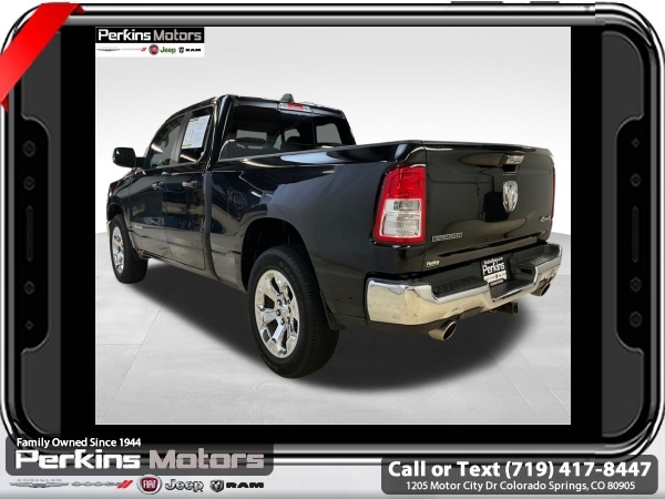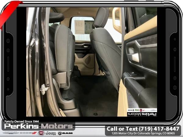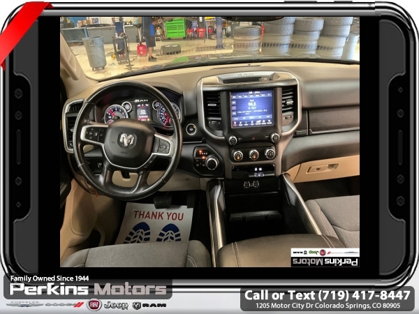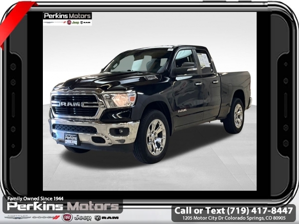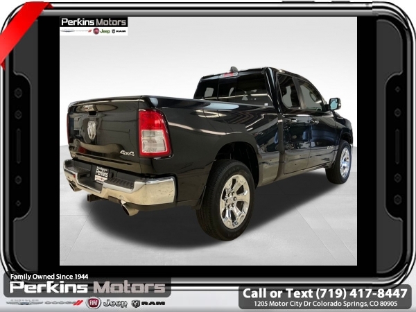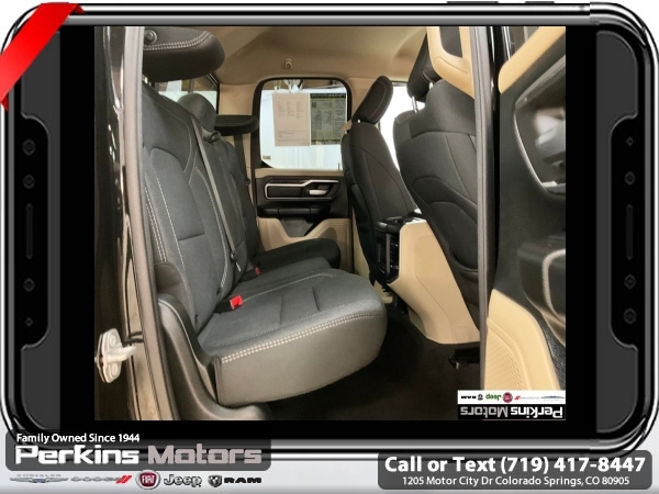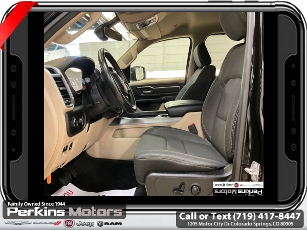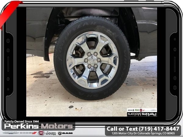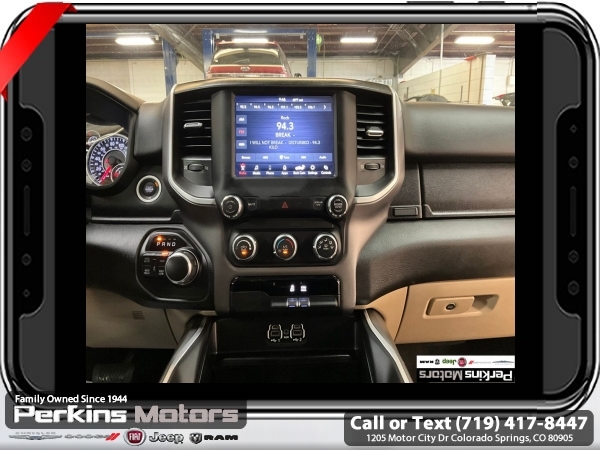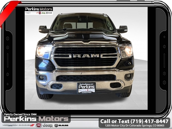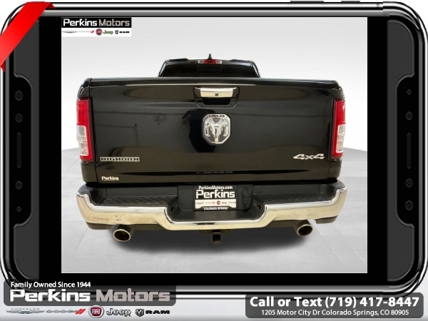Diamond Black Crystal Pearlcoat 4WD HEMI 5.7L V8 Multi Displacement VVT 8-Speed Automatic<br><br><br>Clean CARFAX.<br><br>Check us out at www.perkinsmotors.com to see our specials! Since opening our doors in 1944, we’ve been proud to serve Colorado Springs, CO, and the surrounding areas of Pueblo, Castle Rock and Denver, CO. Throughout this time of being family owned for 80 years, we’ve maintained a firm commitment to our customers: to offer a wide selection of New Chrysler, Dodge, Fiat, Jeep, and Ram vehicles and quality pre-owned vehicles, and provide a quick, no-hassle car-buying process that ensures everyone drives off the lot satisfied with their purchase.<br><br><br>Big Horn Level 1 Equipment Group (Auto-Dimming Rear-View Mirror, Big Horn IP Badge, Black Premium Power Mirrors, Class IV Receiver Hitch, Cluster 3.5 TFT Color Display, Foam Bottle Insert (Door Trim Panel), Glove Box Lamp, Power 4-Way Driver Lumbar Adjust, Power 8-Way Driver Seat, Power Adjustable Pedals, Radio: Uconnect 4 w/8.4 Display, Rear Dome w/On/Off Switch Lamp, Rear Power Sliding Window, Rear Window Defroster, SiriusXM Satellite Radio, Sun Visors w/Illuminated Vanity Mirrors, and Universal Garage Door Opener), Quick Order Package 25Z Big Horn, 3 Rear Seat Head Restraints, 3.21 Rear Axle Ratio, 3.92 Rear Axle Ratio, 4 Way Front Headrests, 4-Wheel Disc Brakes, 48V Belt Starter Generator, 6 Speakers, ABS brakes, Air Conditioning, Alloy wheels, AM/FM radio, Anti-Spin Differential Rear Axle, Brake assist, Bumpers: chrome, Cloth Bench Seat, Compass, Cruise Control, Delay-off headlights, Driver door bin, Dual front impact airbags, Dual front side impact airbags, Electronic Stability Control, Front anti-roll bar, Front Center Armrest w/Storage, Front fog lights, Front reading lights, Front Seat Back Map Pockets, Front wheel independent suspension, Fully automatic headlights, GPS Antenna Input, Heated door mirrors, Illuminated entry, Leather steering wheel, Low tire pressure warning, Manual Adjust 4-Way Front Passenger Seat, Occupant sensing airbag, Outside temperature display, Overhead airbag, Overhead console, Panic alarm, ParkView Rear Back-Up Camera, Passenger door bin, Passenger vanity mirror, Power door mirrors, Power steering, Power windows, Radio data system, Radio: Uconnect 3 w/5 Display, Rear 60/40 Folding Seat, Rear anti-roll bar, Rear seat center armrest, Rear step bumper, Remote keyless entry, Remote Start System, Split folding rear seat, Steering wheel mounted audio controls, Tachometer, Telescoping steering wheel, Tilt steering wheel, Traction control, Trip computer, Variably intermittent wipers, Voltmeter, Wheels: 18 x 8 Cast-Aluminum Painted, and Wheels: 20 x 9 Aluminum Chrome Clad (WRK)