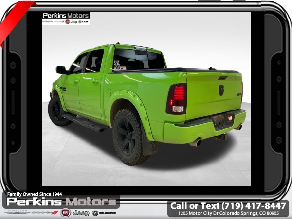 Sublime Metallic Clearcoat 4WD HEMI 5.7L V8 Multi Displacement VVT 8-Speed Automatic<br><br><br>Check us out at www.perkinsmotors.com to see our specials! Since opening our doors in 1944, we’ve been proud to serve Colorado Springs, CO, and the surrounding areas of Pueblo, Castle Rock and Denver, CO. Throughout this time of being family owned for 80 years, we’ve maintained a firm commitment to our customers: to offer a wide selection of New Chrysler, Dodge, Fiat, Jeep, and Ram vehicles and quality pre-owned vehicles, and provide a quick, no-hassle car-buying process that ensures everyone drives off the lot satisfied with their purchase.<br><br><br>Convenience Group (Auto High Beam Headlamp Control, Keyless Enter-N-Go, Rain Sensitive Windshield Wipers, and Remote Proximity Keyless Entry), Heated Seats & Wheel Group, Premium Sound Group (9 Alpine Speakers w/Subwoofer), Quick Order Package 26L Sport (Dual Rear Exhaust w/Bright Tips), Sublime Green Sport Package (DISC) (4x4 Flat Black Badge, Black Closeout Trim, Black Ram Head Tailgate Badge, Body Color/Bright Billets Grille, Bucket Seats, Center Hub, Deluxe Cloth High-Back Bucket Seats (DISC), Flat Black 5.7L Hemi Badge, Flat Black Ram 1500 Badge, Folding Flat Load Floor Storage, Full Length Upgraded Floor Console, High Back Seats, MOPAR Sport Performance Hood Decal, Power Lumbar Adjust, Rear 60/40 Split Folding Seat, Sport Performance Hood, and Wheels: 20 x 9 Semi-Gloss Black Aluminum), 1 Yr. Trial (Registration Required), 115V Auxiliary Power Outlet, 20 x 9 Polished Aluminum Wheels, 3.21 Rear Axle Ratio, 4-Wheel Disc Brakes, 5-Year SiriusXM Traffic Service, 5-Year SiriusXM Travel Link Service, 6 Speakers, 8.4 Touchscreen Display, ABS brakes, Active Grille Shutters, Adjustable pedals, Air Conditioning, Alloy wheels, AM/FM radio, Anti-Spin Differential Rear Axle, Audio Jack Input for Mobile Devices, Auto-dimming door mirrors, Auto-dimming Rear-View mirror, Automatic temperature control, Brake assist, Bright Rotary Shifter, Bumpers: body-color, Cloth Bucket Seats, Compass, Cruise Control, Delay-off headlights, Driver door bin, Driver vanity mirror, Dual front impact airbags, Dual front side impact airbags, Electronic Shift, Electronic Stability Control, Electronically Controlled Throttle, Emergency communication system: Uconnect Access, Front & Rear Rubber Floor Mats, Front anti-roll bar, Front Bucket Seats, Front Center Armrest w/Storage, Front dual zone A/C, Front fog lights, Front reading lights, Front wheel independent suspension, Fully automatic headlights, Garage door transmitter, GPS Antenna Input, GPS Navigation, HD Radio, Heated door mirrors, Heated Front Seats, Heated front seats, Heated Steering Wheel, Heated steering wheel, Heavy-Duty Engine Cooling, Illuminated entry, Integrated Voice Command w/Bluetooth, Leather steering wheel, Low tire pressure warning, Manufacturer's Statement of Origin, Media Hub (USB, AUX), Next Generation Engine Controller, Occupant sensing airbag, Outside temperature display, Overhead airbag, Overhead console, Panic alarm, ParkSense Front/Rear Park Assist System, ParkView Rear Back-Up Camera, Passenger door bin, Passenger vanity mirror, Power door mirrors, Power driver seat, Power steering, Power Sunroof, Power windows, Radio data system, Radio: Uconnect 3C Nav w/8.4 Display, Radio: Uconnect 3C w/8.4 Display, Rear anti-roll bar, Rear seat center armrest, Rear step bumper, Rear Window Defroster, Remote keyless entry, Remote USB Port, Single Disc Remote CD Player, SIRIUSXM Satellite Radio, SIRIUSXM Traffic, SiriusXM Travel Link, Split folding rear seat, Steering wheel mounted audio controls, Tachometer, Tilt steering wheel, Tip Start, Traction control, Trip computer, Turn signal indicator mirrors, Uconnect Access, Uconnect Access 1 Year Trial, Variably intermittent wipers, and Voltmeter.