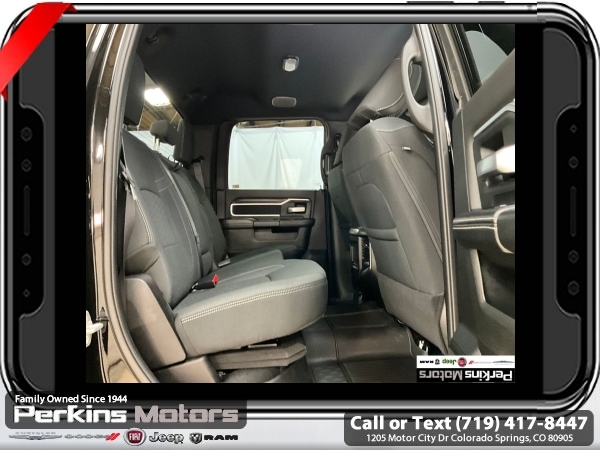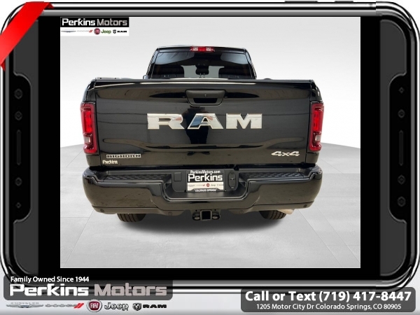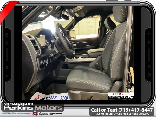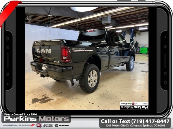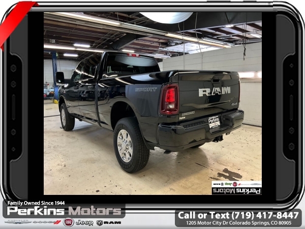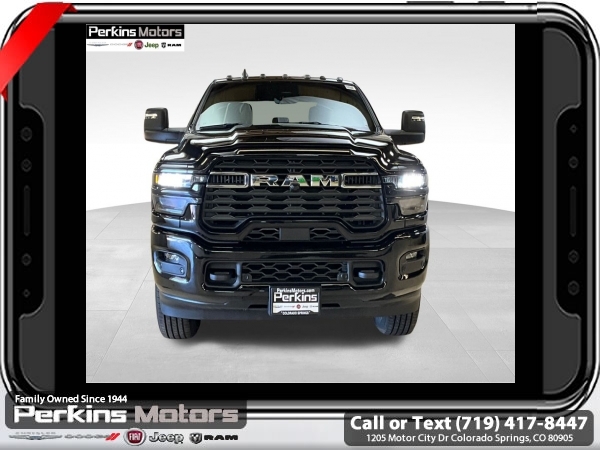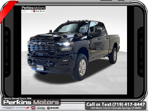 Factory MSRP: $76,095 $3,000 off MSRP! Diamond Black Crystal Pearlcoat 2025 Ram 2500 Big Horn 4WD 8-Speed Automatic 6.7L I6<br><br>Check us out at www.perkinsmotors.com to see our specials! Since opening our doors in 1944, we’ve been proud to serve Colorado Springs, CO, and the surrounding areas of Pueblo, Castle Rock and Denver, CO. Throughout this time of being family owned for 80 years, we’ve maintained a firm commitment to our customers: to offer a wide selection of New Chrysler, Dodge, Fiat, Jeep, and Ram vehicles and quality pre-owned vehicles, and provide a quick, no-hassle car-buying process that ensures everyone drives off the lot satisfied with their purchase.<br><br>Big Horn Level 1 Plus Equipment Group (12 Touchscreen Display, 2 Way Rear Headrest Seat, 2nd Row In Floor Storage Bins, 4 Way Front Headrests, 40/20/40 Split Bench Seat, 4G LTE Wi-Fi Hot Spot, 9 Alpine Speakers w/Subwoofer, Air Conditioning ATC w/Dual Zone Control, Alexa Built-In, Anti-Spin Differential Rear Axle, Apple CarPlay, Auto Power-Folding Mirrors, Auto-Dimming Rear-View Mirror, Black Exterior Mirrors, Connected Travel & Traffic Services, Connectivity - US/Canada, Dual Glove Boxes, Emergency Vehicle Alert System (EVAS), Exterior Mirrors Courtesy Lamps, Exterior Mirrors w/Heating Element, Exterior Mirrors w/Supplemental Signals, Foam Bottle Insert (Door Trim Panel), Folding Flat Load Floor Storage, Footwell Courtesy Lamp, Forward & Reverse Utility Lights, Front Armrest w/Cupholders, Front Center Seat Cushion Storage, Front Seat Back Map Pockets, Global Telematics Box Module (TBM), Glove Box Lamp, Google Android Auto, GPS Antenna Input, GPS Navigation, HD Radio, Integrated Voice Command w/Bluetooth, LED Bed Lighting, Locking Lower Glove Box, Luxury Steering Wheel, Manual Adjust 4-Way Front Passenger Seat, Mirror Running Lights, MOPAR Deployable Bed Step, MOPAR Spray In Bedliner, Off-Road Info Pages, Power 2-Way Driver Lumbar Adjust, Power Adjust 8-Way Driver Seat, Power Adjust Mirrors, Power Adjustable Convex Aux Mirrors, Power Heated Folding Telescopic Mirrors, Power Telescoping Mirrors, Premium Cloth 40/20/40 Bench Seat, Radio: Uconnect 5 Nav w/12.0 Display, Rear 60/40 Folding Seat, Rear Dome w/On/Off Switch Lamp, Remote Start System, Remote USB Port - Charge Only, Selectable Tire Fill Alert, SiriusXM Radio Service, SiriusXM w/360L, Steering Wheel Mounted Audio Controls, Storage Tray, and Trailer Tow Pages), Cold Weather Group (Engine Block Heater and MOPAR Winter Front Grille Cover), Heated Seats & Wheel Group (Heated Front Seats and Heated Steering Wheel), Quick Order Package 24Z Big Horn, Sport Appearance Package (Black Interior Accents, Body Color Grille Surround, Painted Front Bumper, Painted Rear Bumper, and Sport Decal), 3.42 Axle Ratio, 3.73 Axle Ratio, 4-Wheel Disc Brakes, 5th Wheel/Gooseneck Towing Prep Group, 6 Speakers, ABS brakes, Air Conditioning, Alloy wheels, AM/FM radio: SiriusXM, Apple CarPlay/Android Auto, Brake assist, Bumpers: chrome, Clearance Lamps, Cloth 40/20/40 Bench Seat, Compass, Cruise Control, Delay-off headlights, Driver door bin, Dual front impact airbags, Dual front side impact airbags, Electronic Stability Control, Front anti-roll bar, Front Center Armrest w/Storage, Front fog lights, Front License Plate Bracket, Front reading lights, Fully automatic headlights, Heated door mirrors, Illuminated entry, Low tire pressure warning, Manual Adjust 4-Way Driver Seat, Manufacturer's Statement of Origin, MOPAR Front & Rear Rubber Floor Mats, Occupant sensing airbag, Outside temperature display, Overhead airbag, Overhead console, Panic alarm, ParkView Rear Back-Up Camera, Passenger door bin, Passenger vanity mirror, Power door mirrors, Power steering, Power windows, Radio data system, Radio: Uconnect 5 w/8.4 Display, Rear anti-roll bar, Sale price includes all manufacture's incentives and dealer discounts. Sale price not available on lease or compatible with special APR. $1000 - 2025 National Bonus Cash . Exp. 0