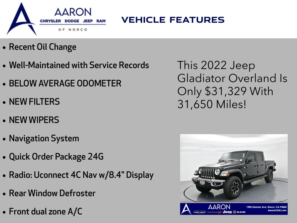 Built for bold adventures and everyday comfort, this 2022 Jeep Gladiator Overland 4x4 blends iconic Jeep capability with refined amenities and smart technology to deliver a midsize truck that truly does it all. With just 31,650 miles and a clean Carfax history, this Gladiator Overland is powered by the trusted 3.6L Pentastar V6 engine mated to an 8-speed automatic transmission, offering robust performance, smooth highway cruising, and legendary off-road strength with a Command-Trac 4x4 system and heavy-duty Dana 44 axles. Finished in sleek Black Clear-Coat with body-color fender flares, 18-inch Granite Crystal aluminum wheels, and the optional black Freedom Top 3-piece hardtop, this Gladiator turns heads wherever it goes. Designed with versatility in mind, it includes a spray-in bedliner by Mopar, Class IV hitch receiver, and full-size spare for serious hauling and towing. The Overland trim enhances daily driving with luxury touches like a leather-wrapped steering wheel, premium cloth bucket seats, 2-way lumbar adjustable driver seat, and automatic dual-zone climate control. Technology is front and center with the 8.4-inch Uconnect display, integrated navigation, Apple CarPlay, Android Auto, SiriusXM Guardian, and Alpine Premium Audio System for crystal-clear sound. Safety features include a rear backup camera, electronic stability control, trailer sway damping, and tire pressure monitoring. Added Mopar upgrades such as the hardtop headliner, all-weather mats, and windshield Gorilla Glass make this Gladiator ready for both rugged terrain and refined travel. Whether youre conquering backcountry trails or commuting in comfort, the 2022 Jeep Gladiator Overland offers unmatched versatility, authenticity, and value. Backed by a 5-year/60,000-mile powertrain warranty and designed to deliver durability and convenience without compromise, this is your chance to step into a truck thats built to go beyond. Don't wait visit us today to experience the capability and freedom of owning a Jeep Gladiator Overland.