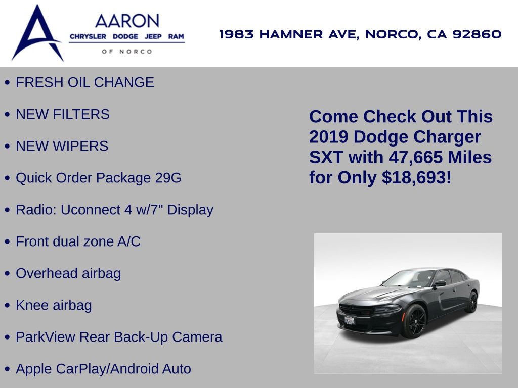 Priced below KBB Fair Purchase Price!FRESH OIL CHANGE, NEW FILTERS, NEW WIPERS, Charger SXT, 4D Sedan, 3.6L 6-Cylinder SMPI DOHC, 8-Speed Automatic, RWD, Alloy wheels, Apple CarPlay/Android Auto, Front dual zone A/C, Knee airbag, Overhead airbag, ParkView Rear Back-Up Camera, Quick Order Package 29G, Radio: Uconnect 4 w/7" Display, Wheels: 17" x 7.0" Painted Cast Aluminum.Awards: * 2019 KBB.com Best Resale Value Awards * 2019 KBB.com Brand Image Awards