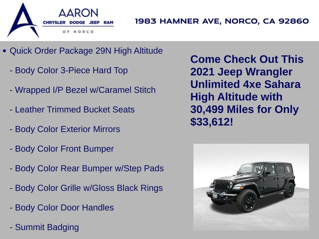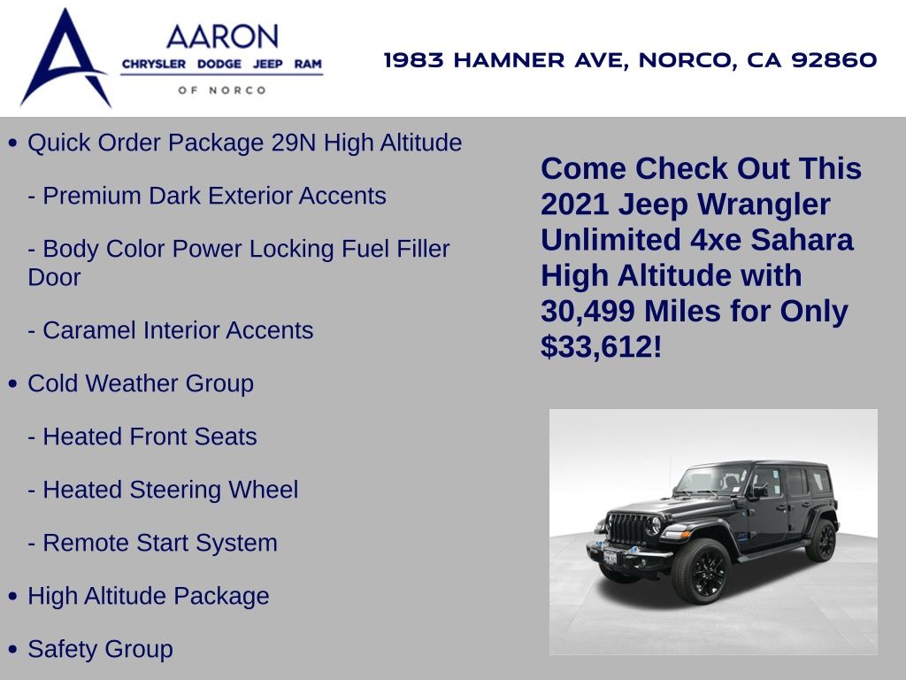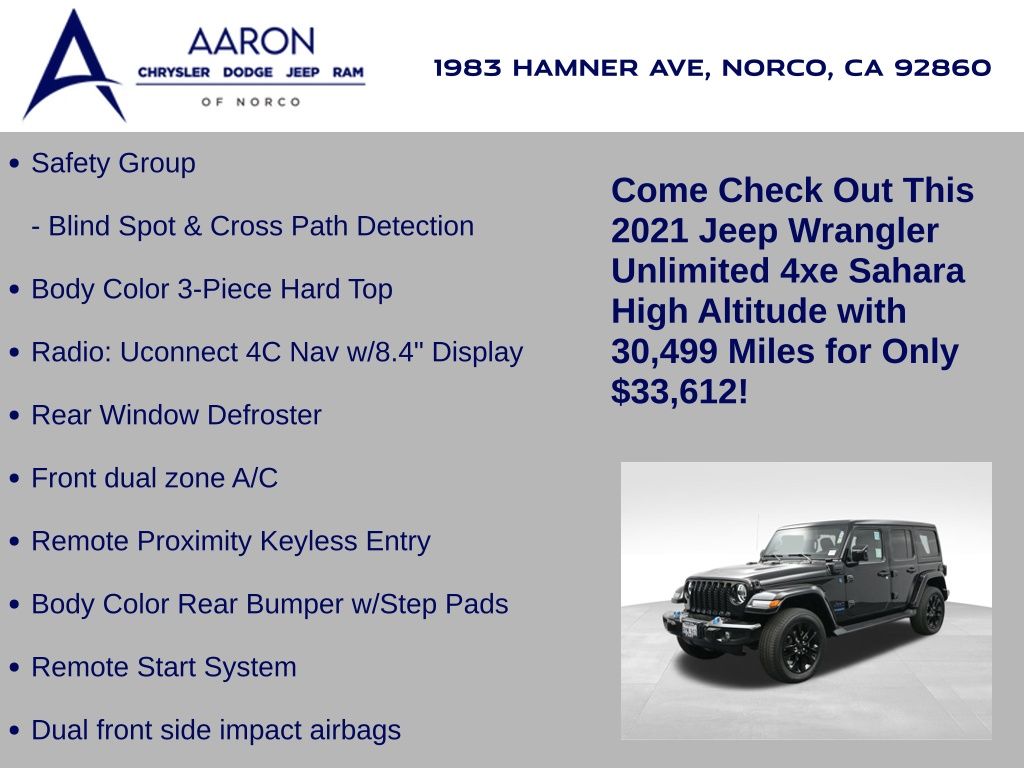 BELOW AVERAGE ODOMETER, FRESH OIL CHANGE, NEW FILTERS, NEW WIPERS, Wrangler Unlimited Sahara High Altitude 4xe, 4D Sport Utility, 2.0L I4 DOHC, 8-Speed Automatic, 4WD, Alloy wheels, Apple CarPlay/Android Auto, Blind Spot & Cross Path Detection, Blue Tow Hooks, Body Color 3-Piece Hard Top, Body Color Door Handles, Body Color Exterior Mirrors, Body Color Front Bumper, Body Color Grille w/Gloss Black Rings, Body Color Power Locking Fuel Filler Door, Body Color Rear Bumper w/Step Pads, Caramel Interior Accents, Cold Weather Group, Dual front side impact airbags, Freedom Panel Storage Bag, Front dual zone A/C, Front fog lights, Heated Front Seats, Heated Steering Wheel, High Altitude Package, Leather Trimmed Bucket Seats, Leather Wrapped Park Brake Handle, Navigation System, ParkSense Rear Park Assist System, Power Top Quarter Window Storage Bag, Premium Dark Exterior Accents, Quick Order Package 29N High Altitude, Radio: Uconnect 4C Nav w/8.4" Display, Rear Window Defroster, Rear Window Wiper/Washer, Remote Proximity Keyless Entry, Remote Start System, Removable Rear Quarter Windows, Safety Group, Sky 1-Touch Power Top, Summit Badging, Wheels: 20" x 8" Fully Painted Aluminum, Wrapped I/P Bezel w/Caramel Stitch.Clean CARFAX.CARFAX One-Owner.