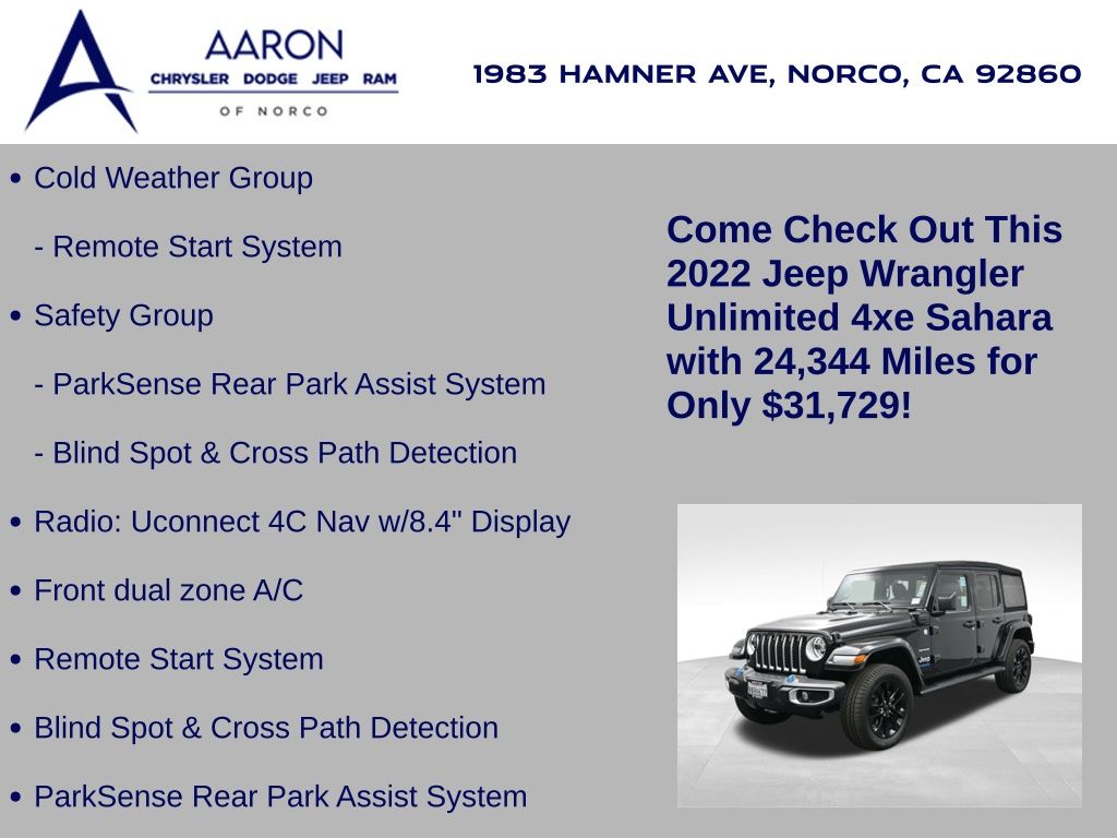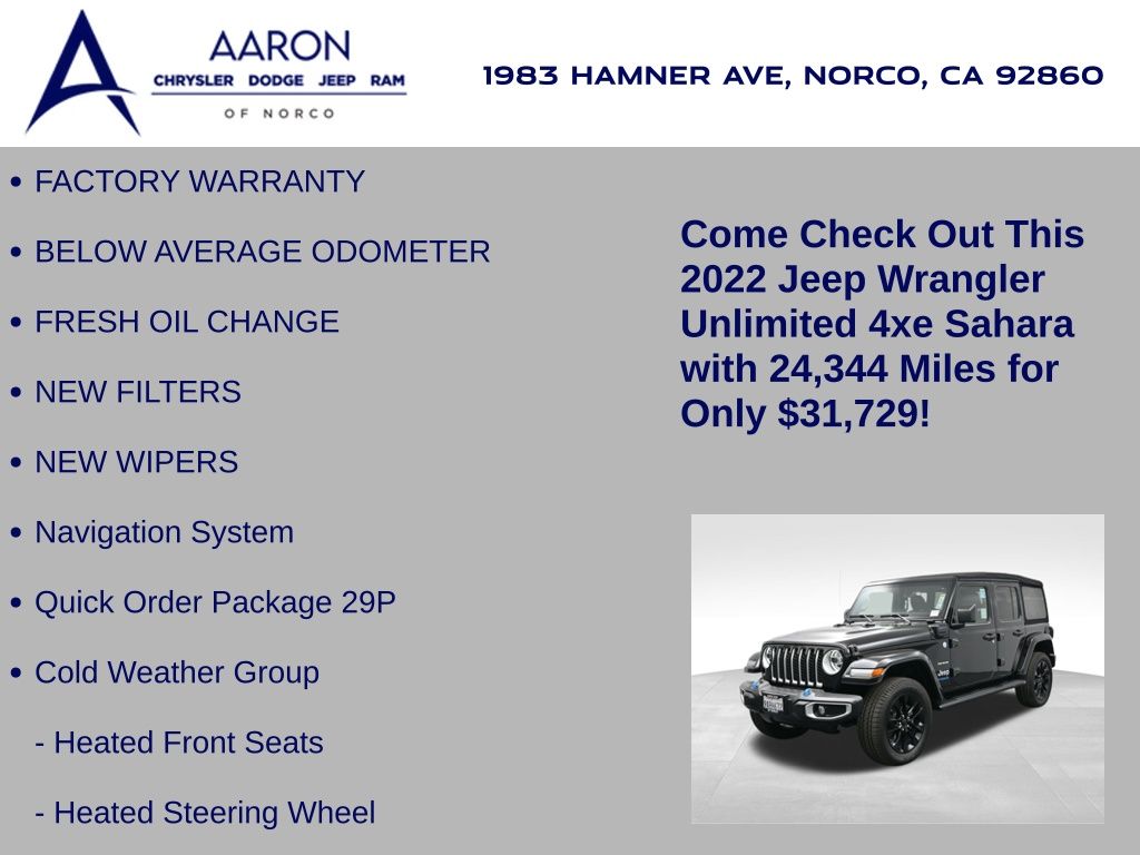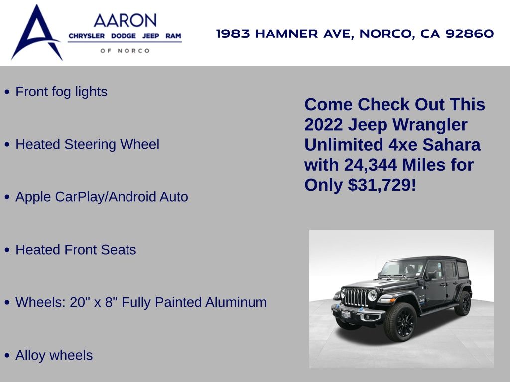 Priced below KBB Fair Purchase Price!FACTORY WARRANTY, BELOW AVERAGE ODOMETER, FRESH OIL CHANGE, NEW FILTERS, NEW WIPERS, Wrangler Unlimited Sahara 4xe, 4D Sport Utility, 2.0L I4 DOHC, 8-Speed Automatic, 4WD, Alloy wheels, Apple CarPlay/Android Auto, Blind Spot & Cross Path Detection, Cold Weather Group, Front dual zone A/C, Front fog lights, Heated Front Seats, Heated Steering Wheel, Mopar Black Tubular Side Steps, Navigation System, ParkSense Rear Park Assist System, Quick Order Package 29P, Radio: Uconnect 4C Nav w/8.4" Display, Remote Start System, Safety Group, Wheels: 20" x 8" Fully Painted Aluminum.Clean CARFAX.CARFAX One-Owner.