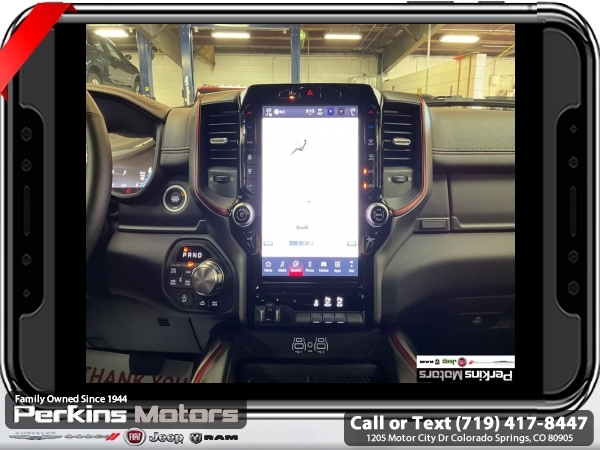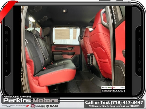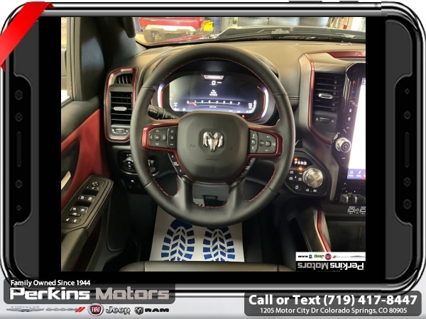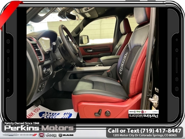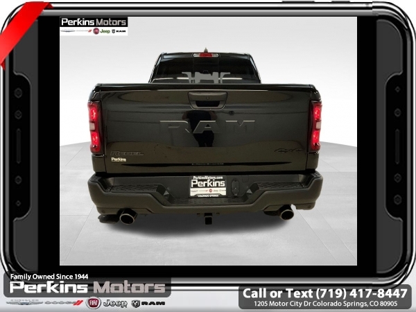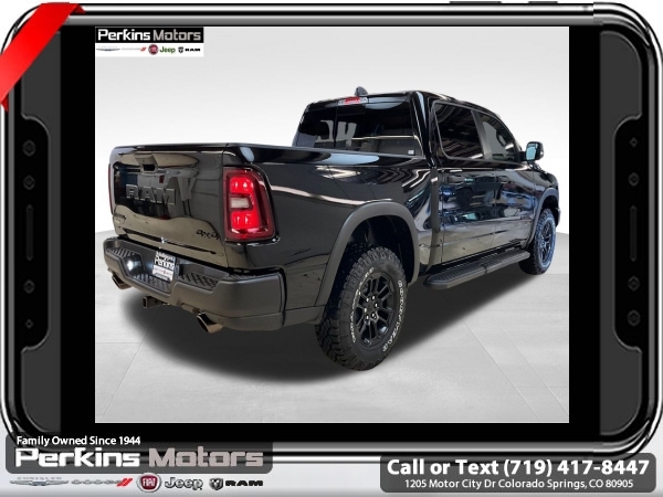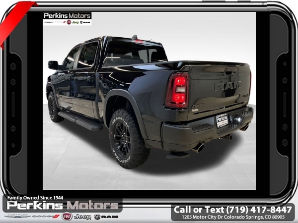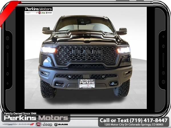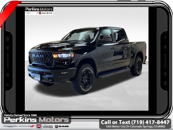 Factory MSRP: $68,615 $10,176 off MSRP! Priced below KBB Fair Purchase Price! Diamond Black Crystal Pearlcoat 2025 Ram 1500 Rebel 4WD 8-Speed Automatic 3.0L I6<br><br>Check us out at www.perkinsmotors.com to see our specials! Since opening our doors in 1944, we’ve been proud to serve Colorado Springs, CO, and the surrounding areas of Pueblo, Castle Rock and Denver, CO. Throughout this time of being family owned for 80 years, we’ve maintained a firm commitment to our customers: to offer a wide selection of New Chrysler, Dodge, Fiat, Jeep, and Ram vehicles and quality pre-owned vehicles, and provide a quick, no-hassle car-buying process that ensures everyone drives off the lot satisfied with their purchase.<br><br>Bed Utility Group (Exterior 115V AC Outlet, MOPAR 4 Adjustable Cargo Tie-Down Hooks, and MOPAR Spray In Bedliner), Quick Order Package 21W Rebel, Rebel Level 1 Equipment Group (Auto Power-Folding Mirrors, Auto-Dimming Exterior Driver Mirror, Black Premium Power Mirrors, Convex Wide-Angle Exterior Mirror Insert, Exterior Mirrors Courtesy Lamps, Exterior Mirrors w/Heating Element, Exterior Mirrors w/Supplemental Signals, Power Adjustable Pedals, Rear Window Defroster, Remote Tailgate Release, and Wireless Charging Pad), 10 Speakers, 3.92 Rear Axle Ratio, 33 Gallon Fuel Tank, 4 Way Front Headrests, 4-Wheel Disc Brakes, 4G LTE Wi-Fi Hot Spot, ABS brakes, Air Conditioning, Alloy wheels, AM/FM radio: SiriusXM with 360L, Apple CarPlay, Apple CarPlay/Android Auto, Auto High-beam Headlights, Auto-dimming Rear-View mirror, Automatic temperature control, Brake assist, Bucket Seats, Cloth/Vinyl Bucket Seats, Compass, Connected Travel & Traffic Services, Connectivity - US/Canada, Cruise Control, Delay-off headlights, Driver door bin, Driver vanity mirror, Dual front impact airbags, Dual front side impact airbags, Electronic Stability Control, Front anti-roll bar, Front Bucket Seats, Front Center Armrest w/Storage, Front dual zone A/C, Front fog lights, Front License Plate Bracket, Front reading lights, Front Seat Back Map Pockets, Front wheel independent suspension, Full Length Upgraded Floor Console, Fully automatic headlights, Garage door transmitter, Google Android Auto, GPS Antenna Input, GPS Navigation, Heated door mirrors, Heated front seats, Heated steering wheel, Illuminated entry, Integrated Voice Command w/Bluetooth, Leather steering wheel, Low tire pressure warning, Manual Folding Exterior Mirrors, Manufacturer's Statement of Origin, Mopar Black Tubular Side Steps, Navigation System, Occupant sensing airbag, Outside temperature display, Overhead airbag, Overhead console, Panic alarm, ParkView Rear Back-Up Camera, Passenger door bin, Passenger vanity mirror, Power Adjust 8-Way Driver Seat, Power door mirrors, Power driver seat, Power steering, Power windows, Radio data system, Radio: Uconnect 5 Nav w/12.0 Display, Rear 60/40 Folding Seat, Rear anti-roll bar, Rear seat center armrest, Rear step bumper, Remote keyless entry, SiriusXM w/360L, Split folding rear seat, Steering wheel mounted audio controls, Tachometer, Telescoping steering wheel, Tilt steering wheel, Traction control, Trailer Brake Control, Trip computer, USB Host Flip, Variably intermittent wipers, Voltmeter, and Wheels: 18 x 8.0 Painted Mid-Gloss Black. Sale price includes all manufacture's incentives and dealer discounts. Sale price not available on lease or compatible with special APR. $2000 - 2025 National Retail Consumer Cash. Exp. 06/30/2025 $6176 - 2025 National Minimum Employee Pricing Discount. Exp. 06/30/2025