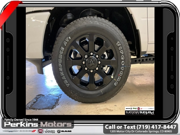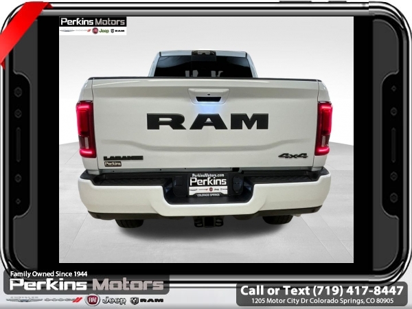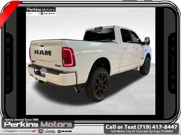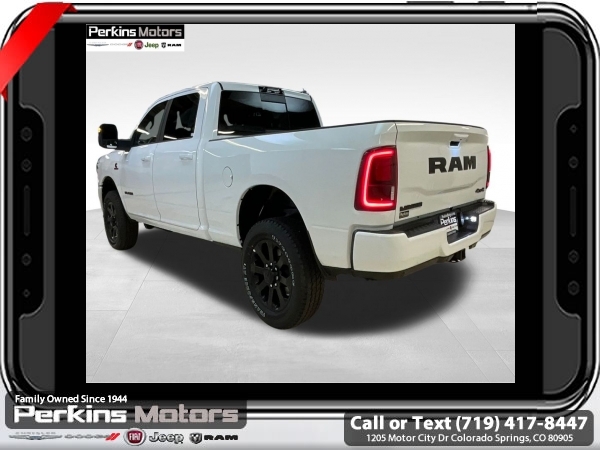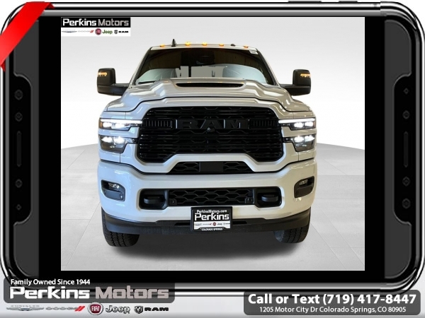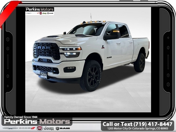 Factory MSRP: $84,790 $4,000 off MSRP! Bright White Clearcoat 2025 Ram 2500 Laramie 4WD 8-Speed Automatic 6.7L I6<br><br>Check us out at www.perkinsmotors.com to see our specials! Since opening our doors in 1944, we’ve been proud to serve Colorado Springs, CO, and the surrounding areas of Pueblo, Castle Rock and Denver, CO. Throughout this time of being family owned for 80 years, we’ve maintained a firm commitment to our customers: to offer a wide selection of New Chrysler, Dodge, Fiat, Jeep, and Ram vehicles and quality pre-owned vehicles, and provide a quick, no-hassle car-buying process that ensures everyone drives off the lot satisfied with their purchase.<br><br>Cold Weather Group (Engine Block Heater and MOPAR Winter Front Grille Cover), Laramie Level 1 Plus Equipment Group (#1 Seat Foam Cushion, 115V Auxiliary Rear Power Outlet, 2 Way Rear Headrest Seat, 2nd Row In Floor Storage Bins, 4 Way Front Headrests, Active Lane Management System, Adaptive Steering System, Anti-Spin Differential Rear Axle, Auto Adjust In Reverse Exterior Mirrors, Auto Dim Exterior Mirror, Auto High Beam Headlamp Control, Auto Power-Folding Mirrors, Auto-Dimming Exterior Passenger Mirror, Bucket Seats, Chrome Exterior Mirrors, CTR Stop Lamp w/Cargo View Camera, Drowsy Driver Detection, Dual Wireless Charging Pad, Exterior Mirrors Courtesy Lamps, Exterior Mirrors w/Heating Element, Exterior Mirrors w/Memory, Exterior Mirrors w/Supplemental Signals, Foam Bottle Insert (Door Trim Panel), Folding Flat Load Floor Storage, Forward & Reverse Utility Lights, Front Seat Back Map Pockets, Full Length Upgraded Floor Console, Heated Front Seats, Heated Steering Wheel, High Back Seats, Leather Trimmed Bucket Seats, LED Bed Lighting, Mirror Running Lights, MOPAR Deployable Bed Step, MOPAR Spray In Bedliner, Power 2-Way Driver Lumbar Adjust, Power 2-Way Passenger Lumbar Adjust, Power Adjust 8-Way Driver Seat, Power Adjust 8-Way Front Passenger Seat, Power Adjust Mirrors, Power Adjustable Convex Aux Mirrors, Power Adjustable Pedals w/Memory, Power Heated Fold Telescopic Mirrors w/Memory, Power Telescoping Mirrors, Rain Sensitive Windshield Wipers, Rear 60/40 Folding Seat, Remote Tailgate Release, and Traffic Sign Recognition), Night Edition (Black Exterior Mirrors, Black Exterior Truck Badging, Black Wheel Center Hub, Body Color Grille Surround, Gloss Black Grille Billets/Accents, Sport Performance Hood, and Wheels: 20 x 8.0 Black Painted Aluminum), Quick Order Package 24H Laramie, 10 Speakers, 3.42 Axle Ratio, 3.73 Axle Ratio, 4-Wheel Disc Brakes, 4G LTE Wi-Fi Hot Spot, 5th Wheel/Gooseneck Towing Prep Group, ABS brakes, Air Conditioning, Alexa Built-In, Alloy wheels, AM/FM radio: SiriusXM with 360L, Apple CarPlay, Apple CarPlay/Android Auto, Auto-dimming Rear-View mirror, Automatic temperature control, Brake assist, Bumpers: body-color, Clearance Lamps, Compass, Connected Travel & Traffic Services, Connectivity - US/Canada, Cruise Control, Delay-off headlights, Disassociated Touchscreen Display, Driver door bin, Driver vanity mirror, Dual front impact airbags, Dual front side impact airbags, Electronic Stability Control, Emergency Vehicle Alert System (EVAS), Front anti-roll bar, Front Center Armrest w/Storage, Front dual zone A/C, Front fog lights, Front License Plate Bracket, Front reading lights, Fully automatic headlights, Garage door transmitter, Global Telematics Box Module (TBM), Google Android Auto, GPS Antenna Input, HD Radio, Heated door mirrors, Heated front seats, Heated steering wheel, Illuminated entry, Integrated Voice Command w/Bluetooth, Leather Trim 40/20/40 Bench Seat, Low tire pressure warning, Manufacturer's Statement of Origin, Navigation System, Occupant sensing airbag, Outside temperature display, Overhead airbag, Overhead console, Panic alarm, ParkView Sale price includes all manufacture's incentives and dealer discounts. Sale price not available on lease or compatible with special APR. $1000 - 2025 National Bonus Cash . Exp. 0