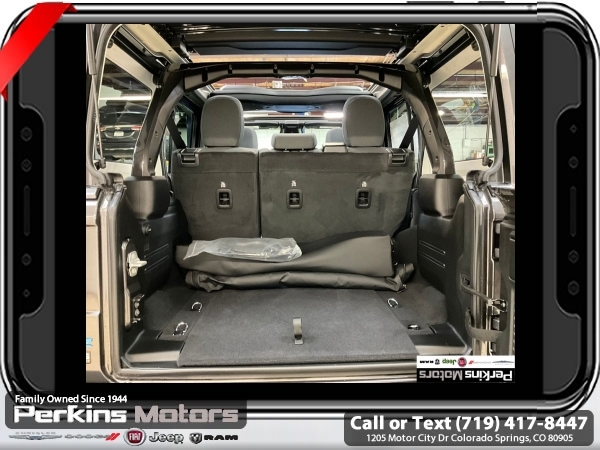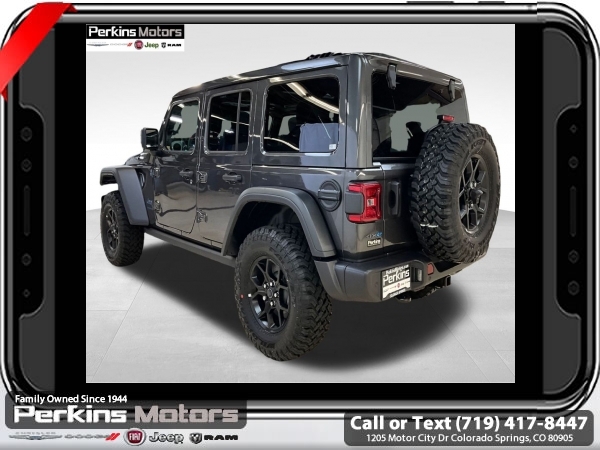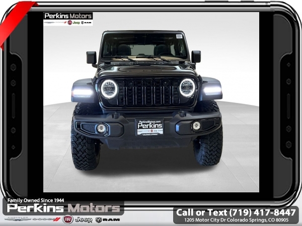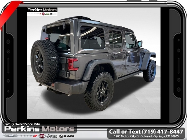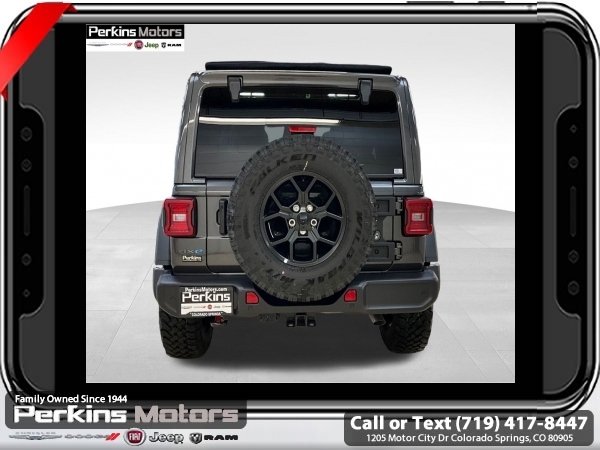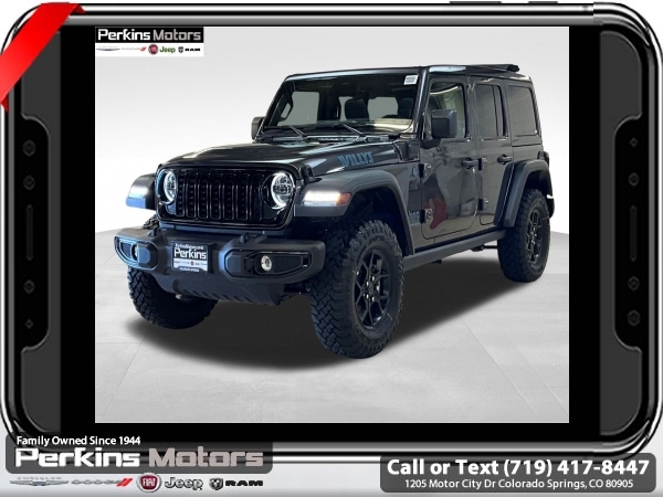 Factory MSRP: $66,455 $7,687 off MSRP! Granite Crystal Metallic Clearcoat 2025 Jeep Wrangler Willys 4xe 4WD 8-Speed Automatic 2.0L I4 DOHC<br>2.0L I4 DOHC.<br>Check us out at www.perkinsmotors.com to see our specials! Since opening our doors in 1944, we’ve been proud to serve Colorado Springs, CO, and the surrounding areas of Pueblo, Castle Rock and Denver, CO. Throughout this time of being family owned for 80 years, we’ve maintained a firm commitment to our customers: to offer a wide selection of New Chrysler, Dodge, Fiat, Jeep, and Ram vehicles and quality pre-owned vehicles, and provide a quick, no-hassle car-buying process that ensures everyone drives off the lot satisfied with their purchase.<br><br>Convenience Group (2-Door Passive Entry, Front Door Locks, Air Conditioning w/Auto Temperature Control, Air Filtering, Emergency/Assistance Call, Heated Front Seats, Heated Steering Wheel, Remote Start System, and Universal Garage Door Opener), Quick Order Package 29W Willys 4xe (4-Wheel Drive Swing Gate Decal, 4.10 Rear Axle Ratio, 7 & 4 Pin Wiring Harness, 97 MPH Vehicle Max Speed Calibration, Auxiliary Switches, Black Grille, Class II Receiver Hitch, Conventional Differential Front Axle, E-Locker Rear Axle, Front LED Fog Lamps, LED Premium Reflector Headlamps, Molded in Color Rubicon Highline Flare, MOPAR All-Weather Floor Mats, Off-Road Plus Mode, Wheels: 17 x 7.5 Painted Black, Willy's Suspension, and Willys 4xe Hood Decal), Safety Group (Auto High Beam Headlamp Control, Blind Spot & Cross Path Detection, LED Taillamps, and ParkSense Rear Park Assist System), 2.0L I4 DOHC, 3.73 Rear Axle Ratio, 4-Wheel Disc Brakes, 8 Speakers, ABS brakes, Air Conditioning, Alloy wheels, AM/FM radio: SiriusXM, Apple CarPlay/Android Auto, Brake assist, Cloth Low-Back Bucket Seats, Compass, Cruise Control, Delay-off headlights, Driver door bin, Driver vanity mirror, Dual front impact airbags, Dual front side impact airbags, Electronic Stability Control, Front anti-roll bar, Front Bucket Seats, Front Center Armrest w/Storage, Front fog lights, Front License Plate Bracket (DISC), Front reading lights, Fully automatic headlights, Heated door mirrors, Illuminated entry, Integrated roll-over protection, Low tire pressure warning, MOPAR Cargo Tub Liner, MOPAR Hinge-Gate Reinforcement, MOPAR Plastic Door Sill Guards, Occupant sensing airbag, Outside temperature display, Overhead airbag, Panic alarm, ParkView Rear Back-Up Camera, Passenger door bin, Passenger vanity mirror, Power door mirrors, Power steering, Power Top Quarter Window Storage Bag, Power windows, Radio data system, Radio: Uconnect 5 w/12.3 Display, Rear anti-roll bar, Rear reading lights, Rear Window Defroster, Rear Window Wiper/Washer, Remote keyless entry, Removable Rear Quarter Windows, Security system, Sky 1-Touch Power Top, Split folding rear seat, Sport Suspension, Steering wheel mounted audio controls, Tachometer, Telescoping steering wheel, Tilt steering wheel, Traction control, Trip computer, Variably intermittent wipers, Voltmeter, and Wheels: 20 x 8 Machined/Painted Gray. Sale price includes all manufacture's incentives and dealer discounts. Sale price not available on lease or compatible with special APR. $2000 - 2025 National Retail Consumer Cash. Exp. 06/30/2025 $3646 - 2025 National Minimum Employee Pricing Discount. Exp. 06/30/2025