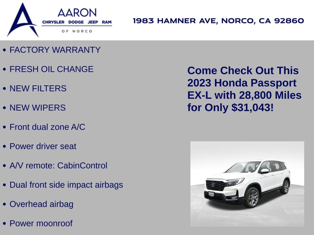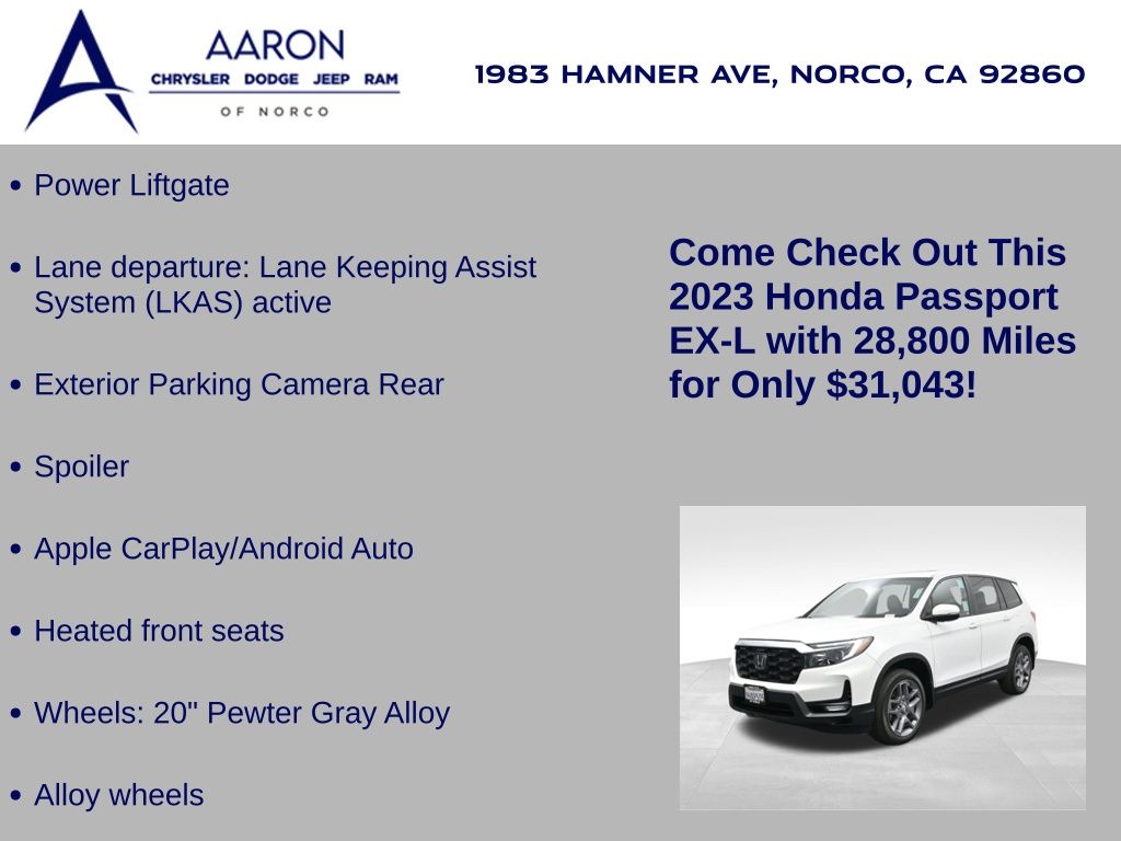 Priced below KBB Fair Purchase Price!FACTORY WARRANTY, FRESH OIL CHANGE, NEW FILTERS, NEW WIPERS, Passport EX-L, 4D Sport Utility, 3.5L V6 24V SOHC i-VTEC, 9-Speed Automatic, AWD, A/V remote: CabinControl, Alloy wheels, Apple CarPlay/Android Auto, Dual front side impact airbags, Exterior Parking Camera Rear, Front dual zone A/C, Heated front seats, Lane departure: Lane Keeping Assist System (LKAS) active, Overhead airbag, Power driver seat, Power Liftgate, Power moonroof, Spoiler, Wheels: 20" Pewter Gray Alloy.Clean CARFAX.CARFAX One-Owner.