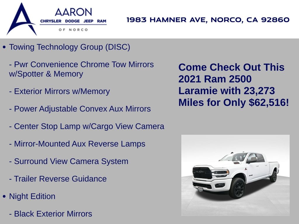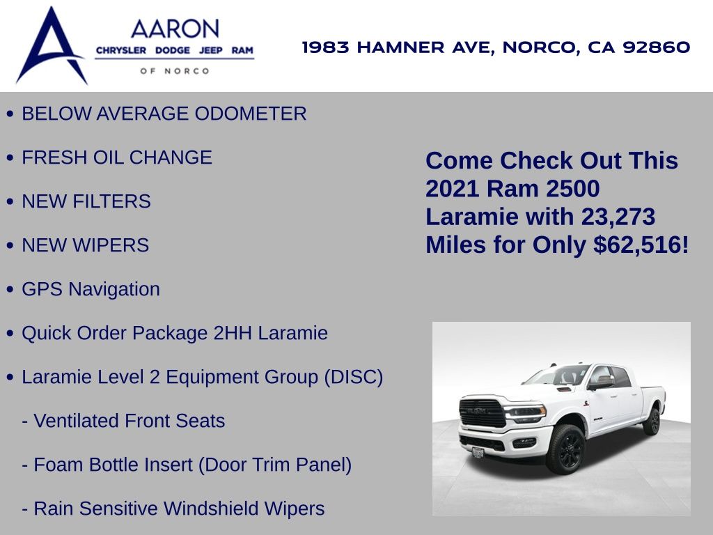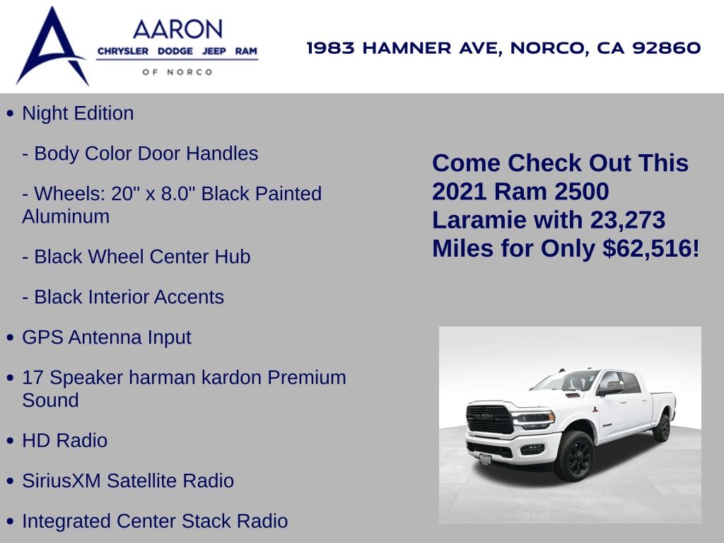 Priced below KBB Fair Purchase Price!BELOW AVERAGE ODOMETER, FRESH OIL CHANGE, NEW FILTERS, NEW WIPERS, 2500 Laramie Mega Cab, 4D Mega Cab, Cummins 6.7L I6 Turbodiesel, 6-Speed Automatic, 4WD, 1-Year SiriusXM Guardian Trial, 17 Speaker harman kardon Premium Sound, 4G LTE Wi-Fi Hot Spot, 5-Year SiriusXM Traffic Service, 5-Year SiriusXM Travel Link Service, 8.4" Touchscreen Display, Alloy wheels, Apple CarPlay, Auto High Beam Headlamp Control, Black Exterior Mirrors, Black Exterior Truck Badging, Black Headlamp Bezels, Black Interior Accents, Black RAM Head Tailgate Badge, Black Tail Lamp Bezels, Black Wheel Center Hub, Blind Spot & Cross Path Detection (DISC), Body Color Door Handles, Body Color Grille Surround, Center Stop Lamp w/Cargo View Camera, Disassociated Touchscreen Display, Exterior Mirrors w/Memory, Foam Bottle Insert (Door Trim Panel), For Details Visit DriveUconnect.com, Gloss Black Grille Billets/Accents, Google Android Auto, GPS Antenna Input, GPS Navigation, HD Radio, Heated Second Row Seats, Integrated Center Stack Radio, Integrated Voice Command w/Bluetooth, Laramie Level 2 Equipment Group (DISC), Mirror-Mounted Aux Reverse Lamps, Night Edition, Off-Road Information Pages, Painted Front Bumper, Painted Rear Bumper, Power Adjustable Convex Aux Mirrors, Power Adjustable Pedals w/Memory, Pwr Convenience Chrome Tow Mirrors w/Spotter & Memory, Quick Order Package 2HH Laramie, Radio: Uconnect 4C Nav w/8.4" Display, Radio/Driver Seat/Mirrors/Pedals Memory, Rain Sensitive Windshield Wipers, Remote Tailgate Release, Selectable Tire Fill Alert, SiriusXM Satellite Radio, SiriusXM Traffic Plus, SiriusXM Travel Link, Surround View Camera System, Towing Technology Group (DISC), Trailer Reverse Guidance, Ventilated Front Seats, Wheels: 20" x 8.0" Black Painted Aluminum.Clean CARFAX.CARFAX One-Owner.Awards: * JD Power Initial Quality Study (IQS)