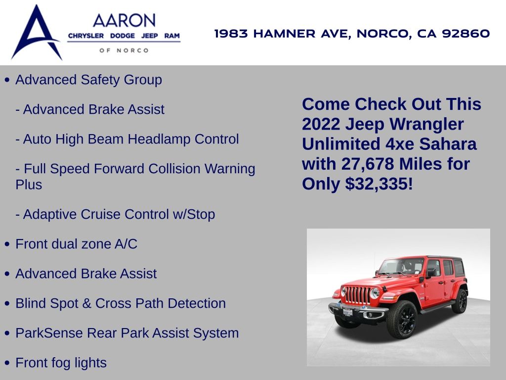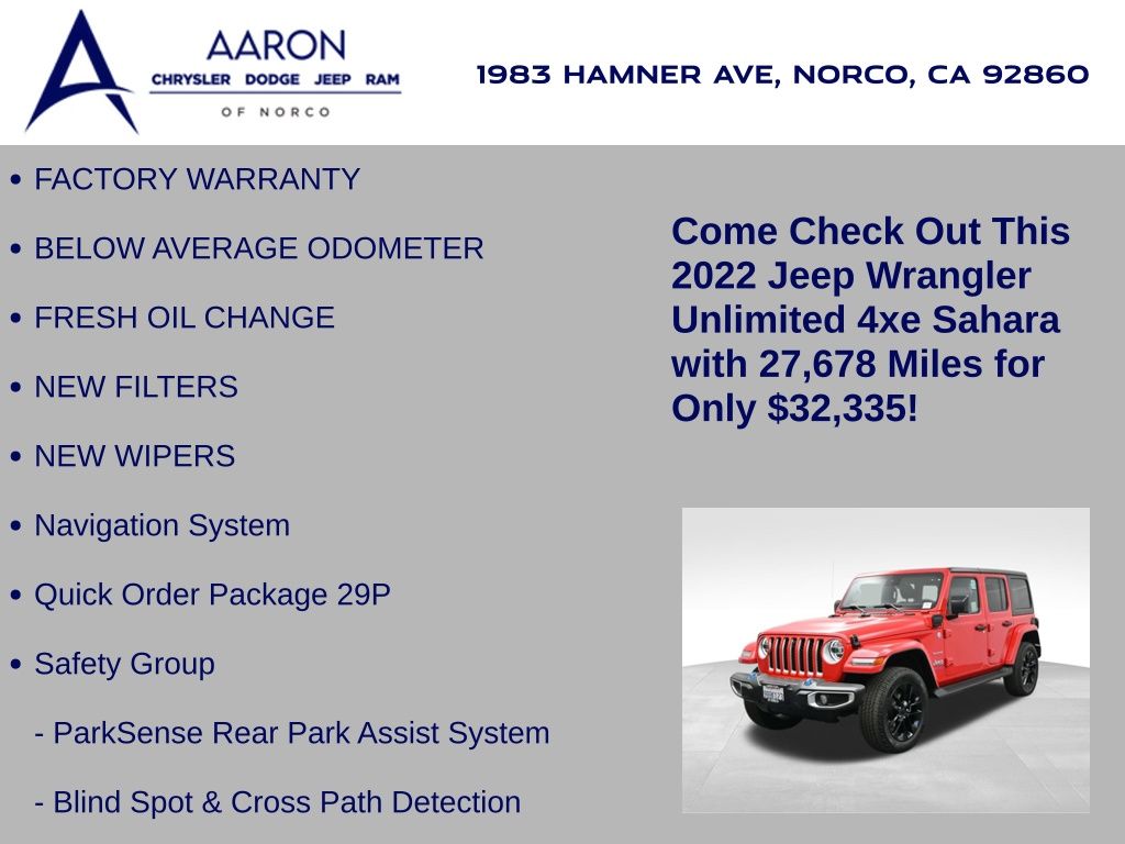 Priced below KBB Fair Purchase Price!FACTORY WARRANTY, BELOW AVERAGE ODOMETER, FRESH OIL CHANGE, NEW FILTERS, NEW WIPERS, Wrangler Unlimited Sahara 4xe, 4D Sport Utility, 2.0L I4 DOHC, 8-Speed Automatic, 4WD, Adaptive Cruise Control w/Stop, Advanced Brake Assist, Advanced Safety Group, Auto High Beam Headlamp Control, Blind Spot & Cross Path Detection, Front dual zone A/C, Front fog lights, Full Speed Forward Collision Warning Plus, Navigation System, ParkSense Rear Park Assist System, Quick Order Package 29P, Safety Group.Clean CARFAX.CARFAX One-Owner.