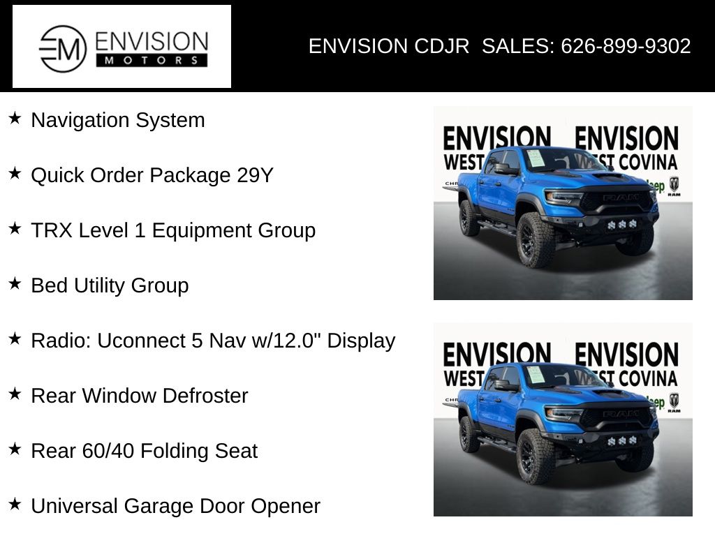 WE SPECIALIZE IN ALL CREDIT PROFILES! See what we can do for you! Call to find out (626) 899-9302.Odometer is 1116 miles below market average! #2 Seat Foam Cushion, 4 Way Front Headrests, Bed Utility Group, Bucket Seats, Center Console Parts Module, Driver/Passenger Wrapped Assist Handles, Front Door Accent Lighting, Front Seat Back Map Pockets, Full Length Premium Upgraded Floor Console, Heated Front Seats, Heated Steering Wheel, IP LED Ambient Light Pipe, Leather Trimmed Bucket Seats, Luxury Front Door Trim Panel, MOPAR 4 Adjustable Cargo Tie-Down Hooks, MOPAR Bright Pedal Kit, MOPAR Deployable Bed Step, MOPAR Spray In Bedliner, Navigation System, Pick-Up Box Lighting, Power 4-Way Driver Lumbar Adjust, Power 4-Way Passenger Lumbar Adjust, Power 8-Way Driver & Passenger Seats, Power Adjustable Pedals, Premium Wrapped IP Bezel, Quick Order Package 29Y, Radio: Uconnect 5 Nav w/12.0" Display, Rain Sensitive Windshield Wipers, Rear 60/40 Folding Seat, Rear Door Accent Lighting, Rear Underseat Compartment Storage, Rear Window Defroster, Sun Visors w/Illuminated Vanity Mirrors, TRX Level 1 Equipment Group, Universal Garage Door Opener, Wheels: 18" x 9" Black Paint/Polish Aluminum.Hydro Blue Pearlcoat2023 Ram 1500 TRX 4WD 8-Speed Automatic 6.2L Supercharged HEMI V8 SRT**********All Pricing and Advertised Prices for any/all vehicles offered for sale does not include dealer installed accessories which can be purchased for an additional cost.********** The Factory Rebates may not be available on this vehicle if you elect to take advantage of a Special Alternative APR or Special Lease program. Some Factory Rebates are California Resident specific and may vary for residents of other states. NO sales to Dealers, Brokers or Exporters. For out of state purchase, customers must be present to purchase. If shipping is required, dealership must facilitate; no exceptions. Please contact us for special Multi-Vehicle or Fleet pricing. Prices are plus government fees and taxes, any finance charges, $85 documentary fee, $29 electronic registration fee, any emission testing charge and $1.75 per new tire state tire fee. *** We make every effort to provide accurate information, but please verify before purchasing. Leasing & financing available on approved credit. Trade-ins accepted. Subject to prior sale.