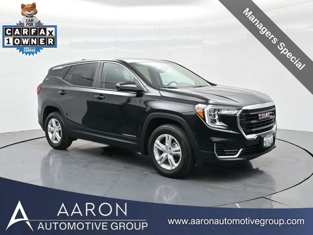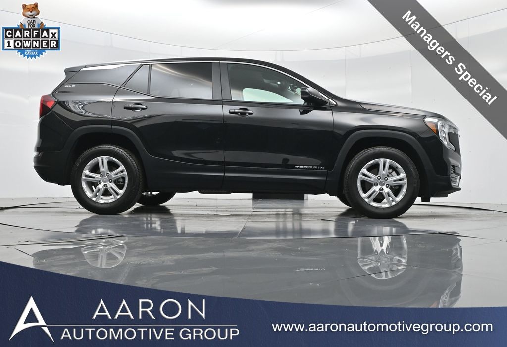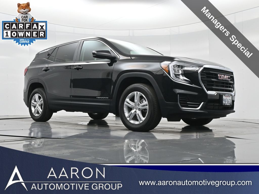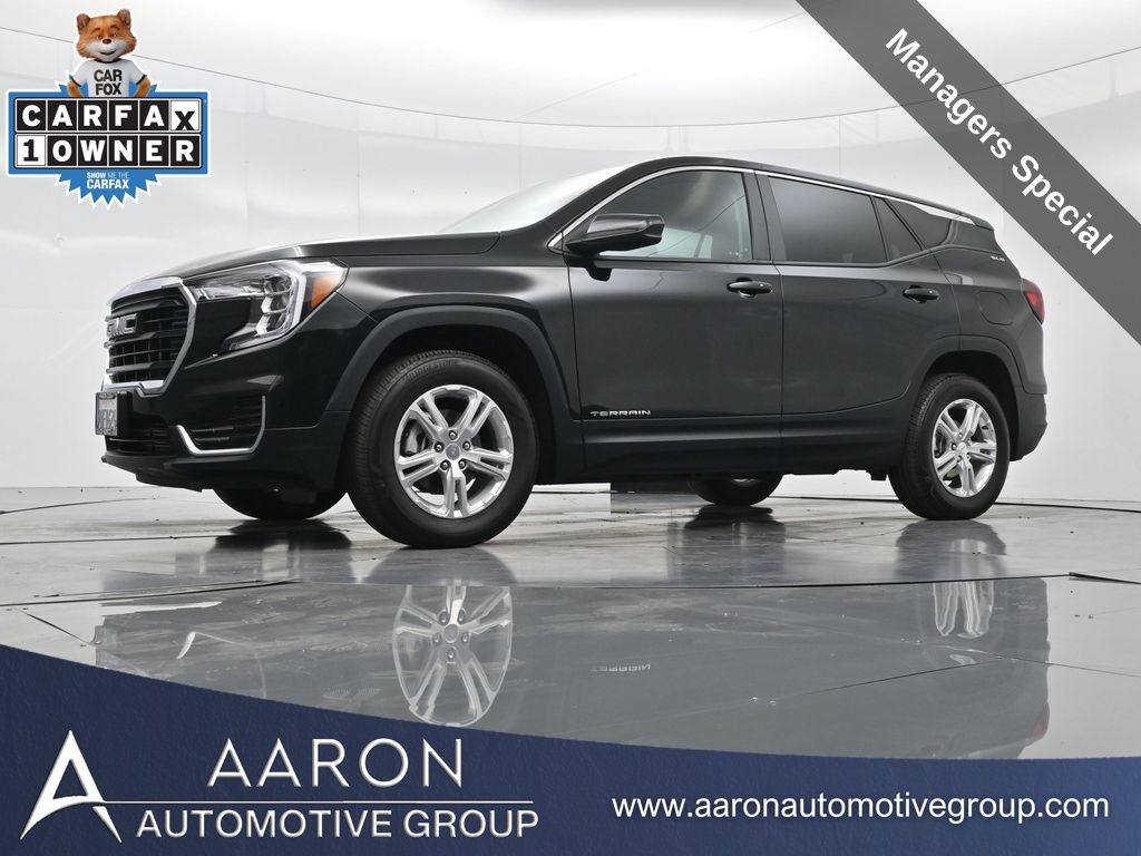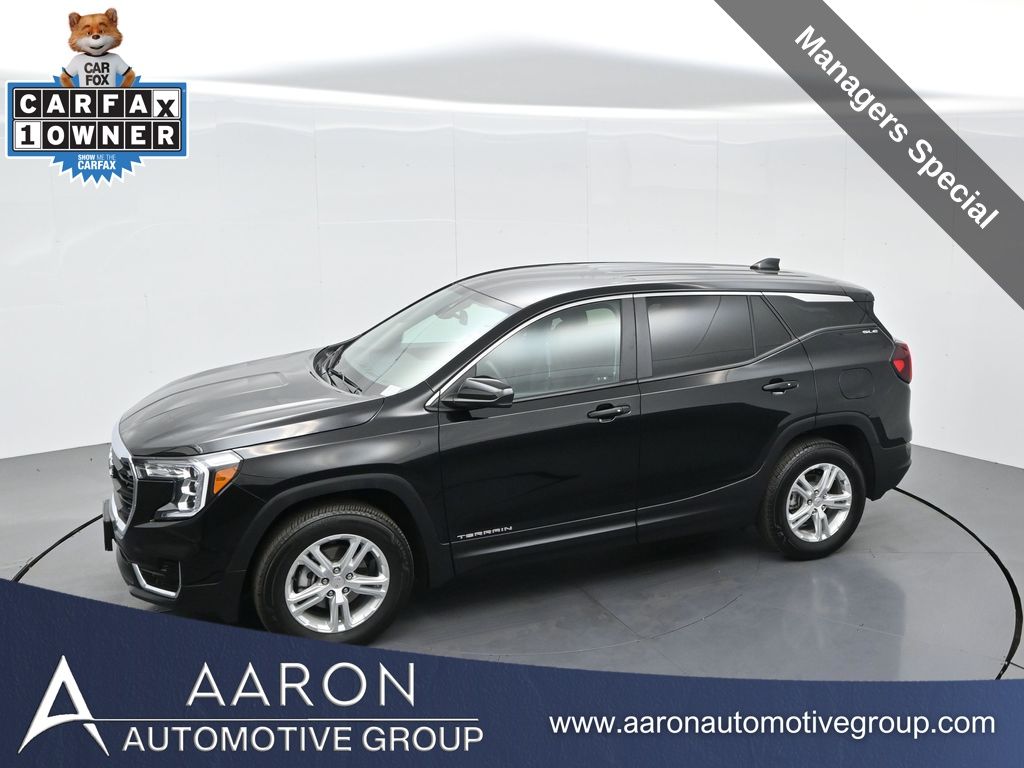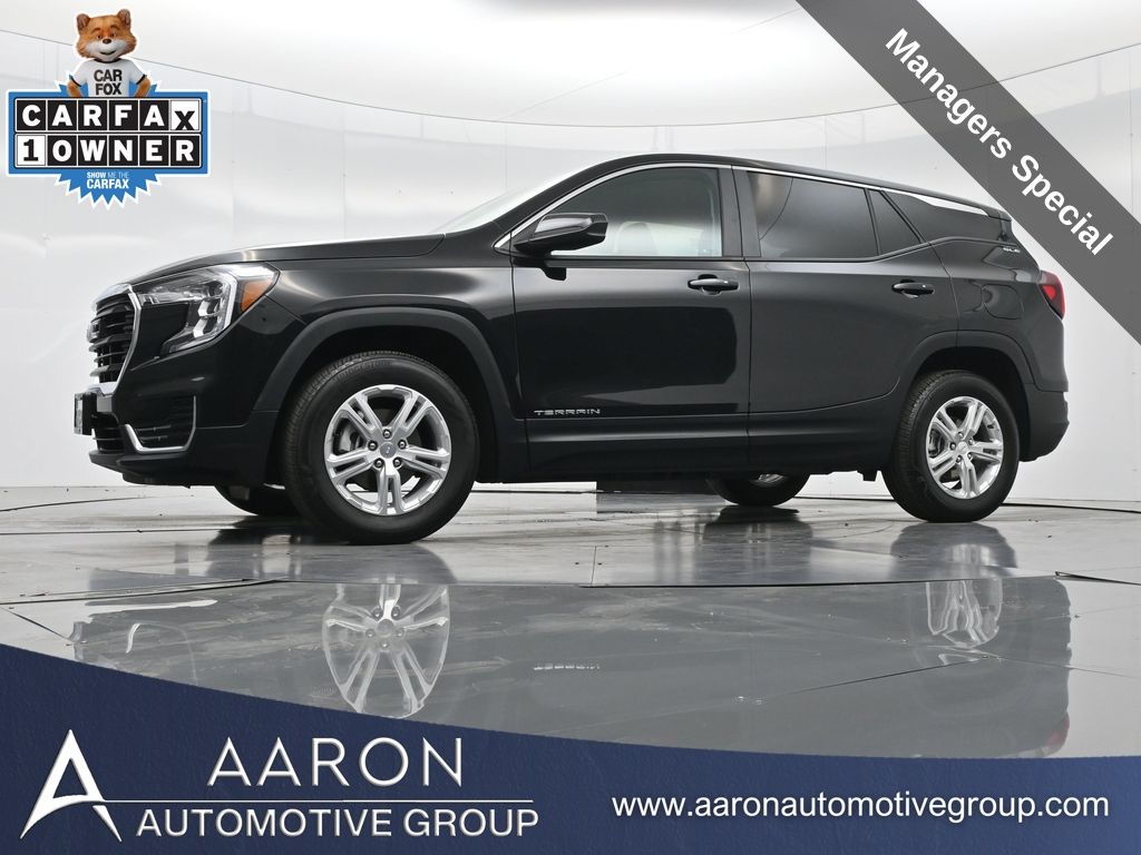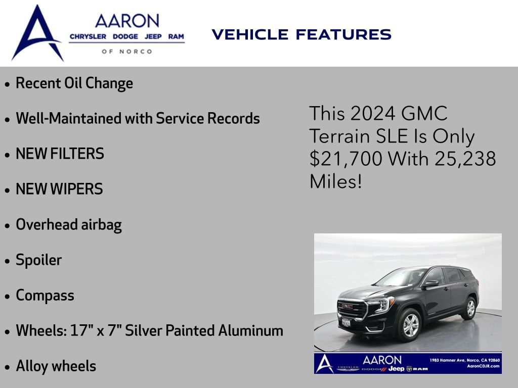 Spacious, confident, and impressively efficient, this 2024 GMC Terrain SLE AWD blends bold styling, advanced safety tech, and all-weather capability into a compact SUV designed to adapt to your daily life. With just 23,808 miles and a clean Carfax history, this one-owner Terrain offers exceptional value with peace of mind. Under the hood, the 1.5L turbocharged 4-cylinder engine delivers the perfect balance of power and efficiency, paired with a smooth-shifting 9-speed automatic transmission and advanced all-wheel drive for optimal traction. It delivers an EPA-estimated 23 MPG city and 28 MPG highway, making it a practical choice for both commuters and small families. Dressed in Ebony Twilight Metallic over Jet Black cloth interior, this Terrain SLE stands out with LED signature daytime running lamps, 17-inch aluminum wheels, and refined body styling that reflects GMCs precision design philosophy. Inside, the cabin is loaded with intuitive features including a 7-inch GMC Infotainment System touchscreen, Apple CarPlay and Android Auto compatibility, Bluetooth audio streaming, SiriusXM trial subscription, OnStar with Wi-Fi hotspot capability, two USB charge ports, and a rear vision camera. Comfort and convenience are further enhanced by automatic climate control, deep-tinted rear glass, a flat-folding rear seatback, and keyless open and start. Safety is a top priority with GMC Pro Safety, which includes automatic emergency braking, forward collision alert, front pedestrian braking, lane keep assist with lane departure warning, Intelli-Beam automatic high beams, and a following distance indicatorall designed to support confident driving in every condition. With its practical layout, confident road manners, and premium touchpoints throughout, the 2024 Terrain SLE is a smart choice for drivers looking for modern style and versatility without compromise. Backed by a 5-year/60,000-mile powertrain warranty and a 3-year/36,000-mile bumper-to-bumper limited warranty, this low-mileage Terrain is ready for whatever your journey holds. Visit us today and experience why more drivers are turning to GMC for performance, safety, and value in one sleek package.