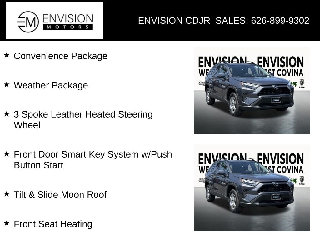 WE SPECIALIZE IN ALL CREDIT PROFILES! See what we can do for you! Call to find out (626) 899-9302.Clean CARFAX.Odometer is 10751 miles below market average! 27/35 City/Highway MPG Black Cloth, 3 Spoke Leather Heated Steering Wheel, Convenience Package, Front Door Smart Key System w/Push Button Start, Front Seat Heating, Tilt & Slide Moon Roof, Weather Package.Magnetic Gray2024 Toyota RAV4 XLE FWD 8-Speed Automatic 2.5L 4-Cylinder DOHC Dual VVT-i**********All Pricing and Advertised Prices for any/all vehicles offered for sale does not include dealer installed accessories which can be purchased for an additional cost.********** The Factory Rebates may not be available on this vehicle if you elect to take advantage of a Special Alternative APR or Special Lease program. Some Factory Rebates are California Resident specific and may vary for residents of other states. NO sales to Dealers, Brokers or Exporters. For out of state purchase, customers must be present to purchase. If shipping is required, dealership must facilitate; no exceptions. Please contact us for special Multi-Vehicle or Fleet pricing. Prices are plus government fees and taxes, any finance charges, $85 documentary fee, $29 electronic registration fee, any emission testing charge and $1.75 per new tire state tire fee. *** We make every effort to provide accurate information, but please verify before purchasing. Leasing & financing available on approved credit. Trade-ins accepted. Subject to prior sale.