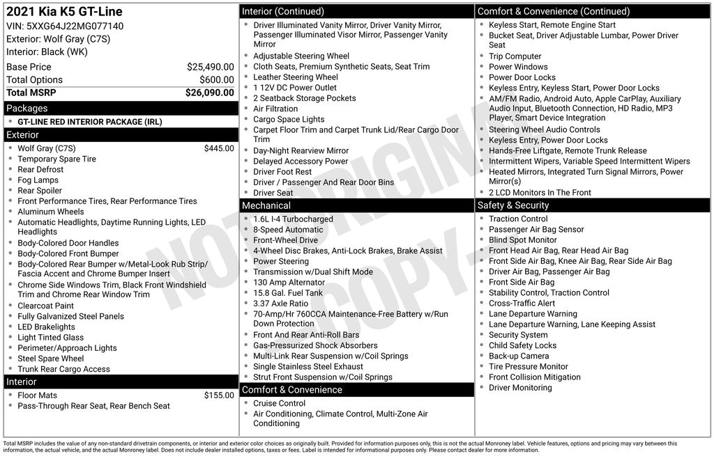 Priced below KBB Fair Purchase Price!BELOW AVERAGE ODOMETER, FRESH OIL CHANGE, NEW FILTERS, K5 GT-Line, 4D Sedan, 8-Speed Automatic, FWD, Alloy wheels, Apple CarPlay & Android Auto, Front dual zone A/C, Front fog lights, GT-Line Red Interior Package, Knee airbag, Overhead airbag, Spoiler, Wheels: 7.5J x 18" Graphite Machined Finish Alloy.CARFAX One-Owner.