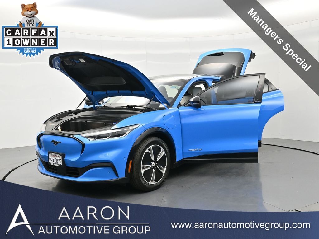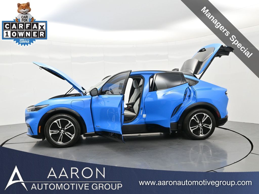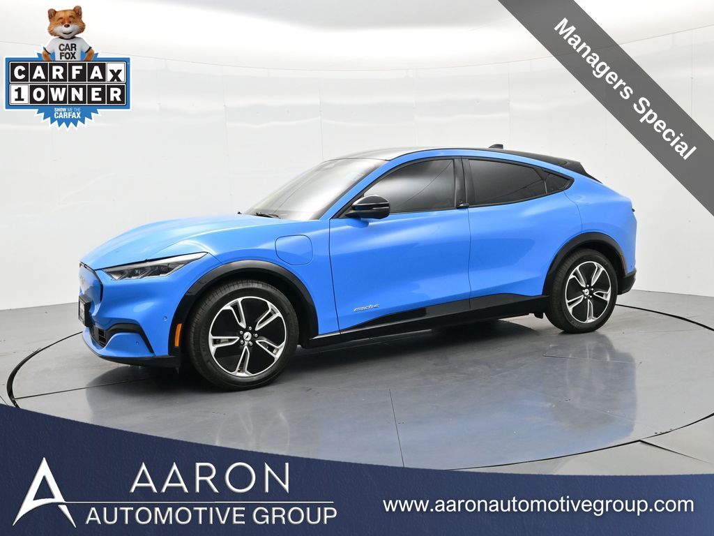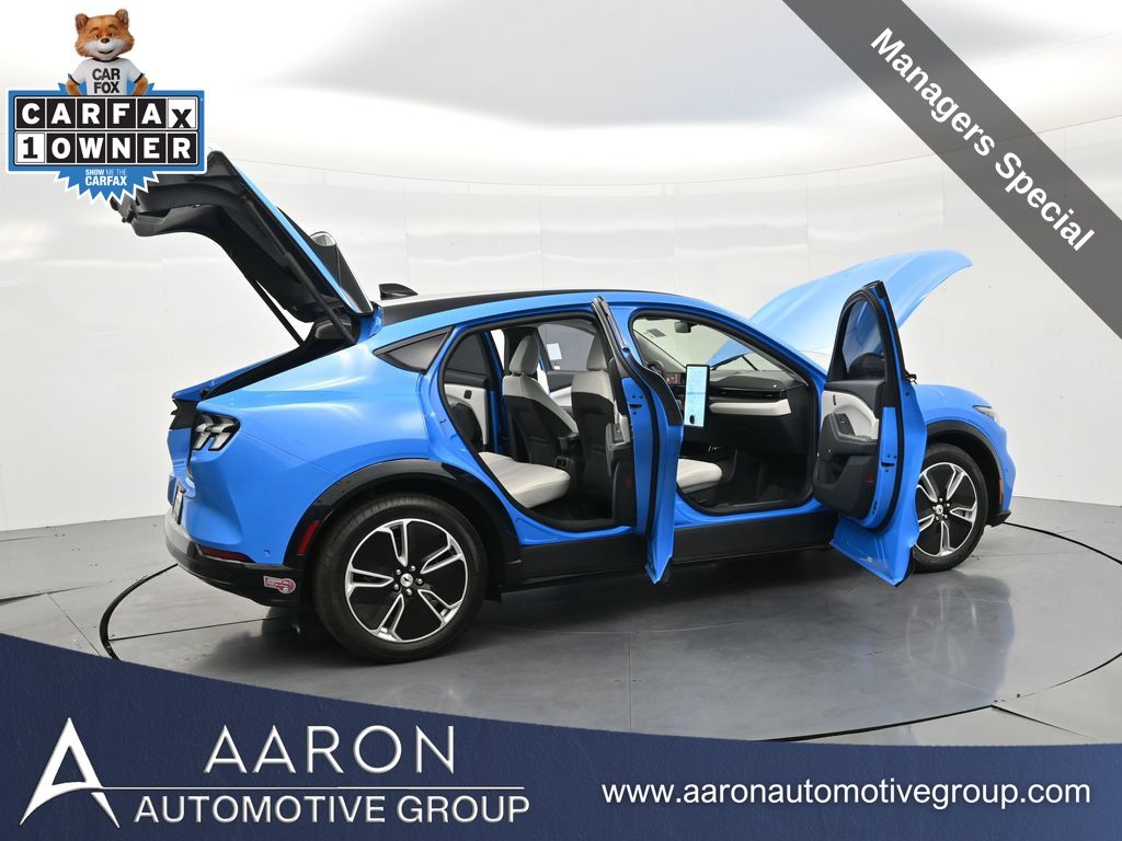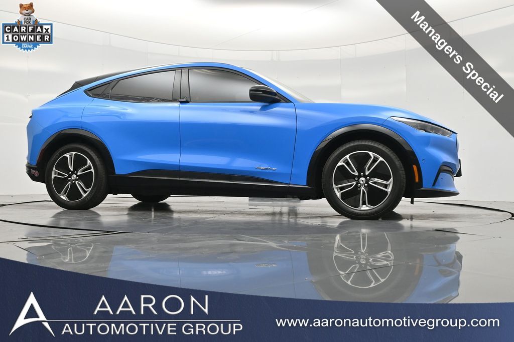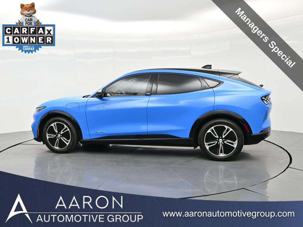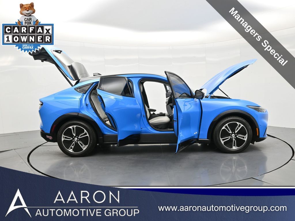 Experience the future of performance and design with this all-electric 2023 Ford Mustang Mach-E Premium, a rear-wheel drive crossover that blends iconic Mustang DNA with cutting-edge EV innovation. With just 23,265 miles and a clean one-owner Carfax showing consistent service, this Grabber Blue Metallic Mach-E offers exhilarating electric driving with the added confidence of remaining factory warranty. Powered by a permanent magnet motor and 91kWh extended-range lithium-ion battery, this Premium trim delivers seamless torque, whisper-quiet acceleration, and an impressive EPA-estimated range of up to 310 miles on a full charge. Ideal for daily commuting and road-tripping alike. Enjoy the convenience of multiple charging solutions including a mobile power cord and access to the BlueOval Charge Network. This Premium model is loaded with luxury and tech-forward features like perforated ActiveX heated front seats, a panoramic fixed-glass roof, and a SYNC 4A infotainment system with a massive 15.5-inch touchscreen, Apple CarPlay and Android Auto integration, enhanced voice recognition, and SiriusXM with 360L. Driver-assist technology is state-of-the-art, featuring Ford Co-Pilot360 Active 2.0 with Adaptive Cruise Control, Intersection Assist, Lane Centering, Evasive Steering Assist, and a full surround-view camera system for complete situational awareness. The interior feels upscale with a heated steering wheel, ambient lighting, aluminum and Carbonized Gray trim accents, and a power hands-free liftgate. Safety is comprehensive with Blind Spot Information System (BLIS), rear cross-traffic alert, Pre-Collision Assist with automatic emergency braking, and reverse sensing system. Additional upgrades include 19-inch shadow silver-painted aluminum wheels, Gray/Black two-tone interior with metallic pedals, memory driver's seat, dual-zone climate control, and wireless charging pad. Built for those who want the muscle of a Mustang with the forward-thinking power of electrification, this Mach-E Premium offers spirited handling, spacious comfort, and standout efficiency all in one electrifying package. Visit us today and take your driving experience to the next level zero emissions, maximum impact.