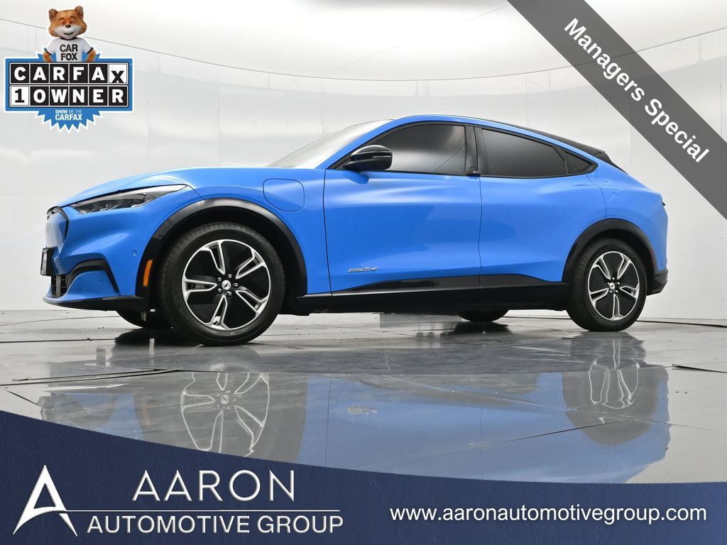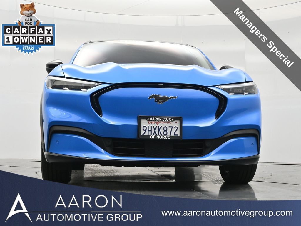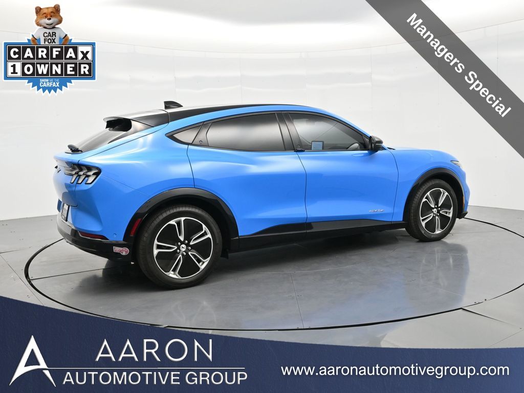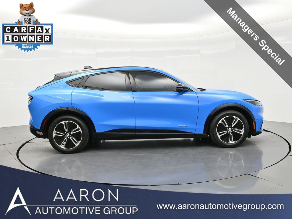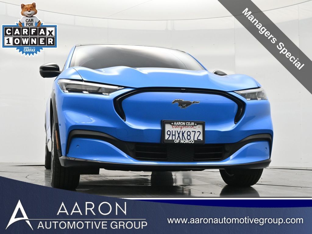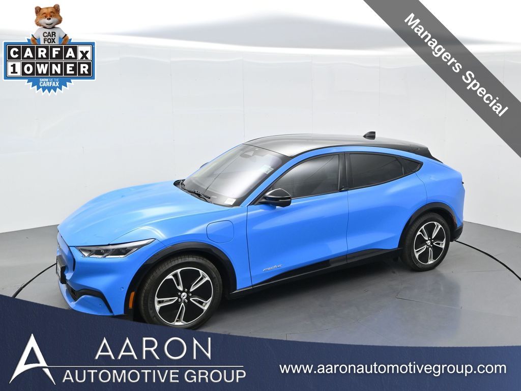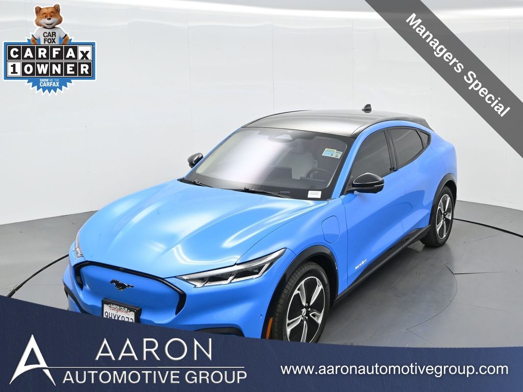Experience the future of performance and design with this all-electric 2023 Ford Mustang Mach-E Premium, a rear-wheel drive crossover that blends iconic Mustang DNA with cutting-edge EV innovation. With just 23,265 miles and a clean one-owner Carfax showing consistent service, this Grabber Blue Metallic Mach-E offers exhilarating electric driving with the added confidence of remaining factory warranty. Powered by a permanent magnet motor and 91kWh extended-range lithium-ion battery, this Premium trim delivers seamless torque, whisper-quiet acceleration, and an impressive EPA-estimated range of up to 310 miles on a full charge. Ideal for daily commuting and road-tripping alike. Enjoy the convenience of multiple charging solutions including a mobile power cord and access to the BlueOval Charge Network. This Premium model is loaded with luxury and tech-forward features like perforated ActiveX heated front seats, a panoramic fixed-glass roof, and a SYNC 4A infotainment system with a massive 15.5-inch touchscreen, Apple CarPlay and Android Auto integration, enhanced voice recognition, and SiriusXM with 360L. Driver-assist technology is state-of-the-art, featuring Ford Co-Pilot360 Active 2.0 with Adaptive Cruise Control, Intersection Assist, Lane Centering, Evasive Steering Assist, and a full surround-view camera system for complete situational awareness. The interior feels upscale with a heated steering wheel, ambient lighting, aluminum and Carbonized Gray trim accents, and a power hands-free liftgate. Safety is comprehensive with Blind Spot Information System (BLIS), rear cross-traffic alert, Pre-Collision Assist with automatic emergency braking, and reverse sensing system. Additional upgrades include 19-inch shadow silver-painted aluminum wheels, Gray/Black two-tone interior with metallic pedals, memory driver's seat, dual-zone climate control, and wireless charging pad. Built for those who want the muscle of a Mustang with the forward-thinking power of electrification, this Mach-E Premium offers spirited handling, spacious comfort, and standout efficiency all in one electrifying package. Visit us today and take your driving experience to the next level zero emissions, maximum impact.