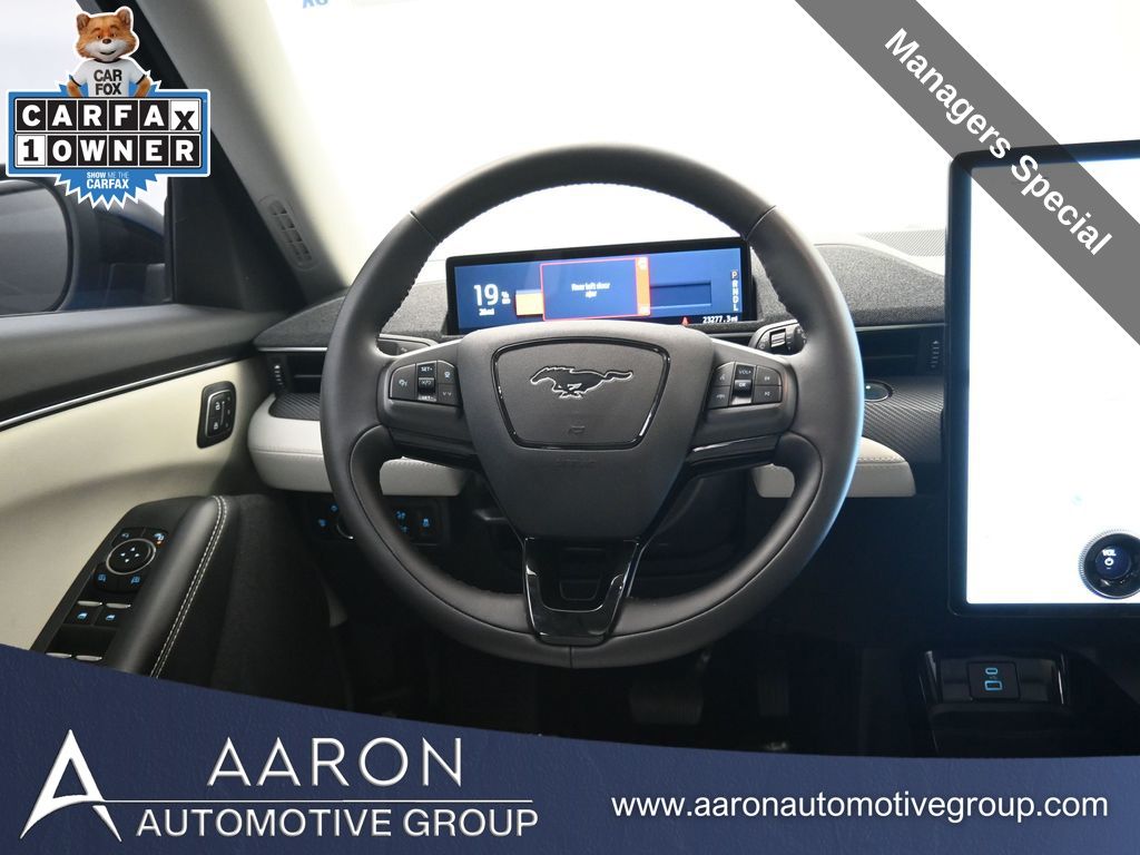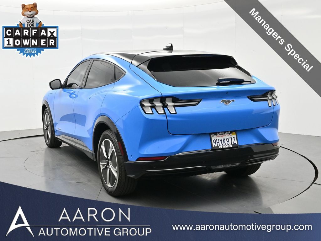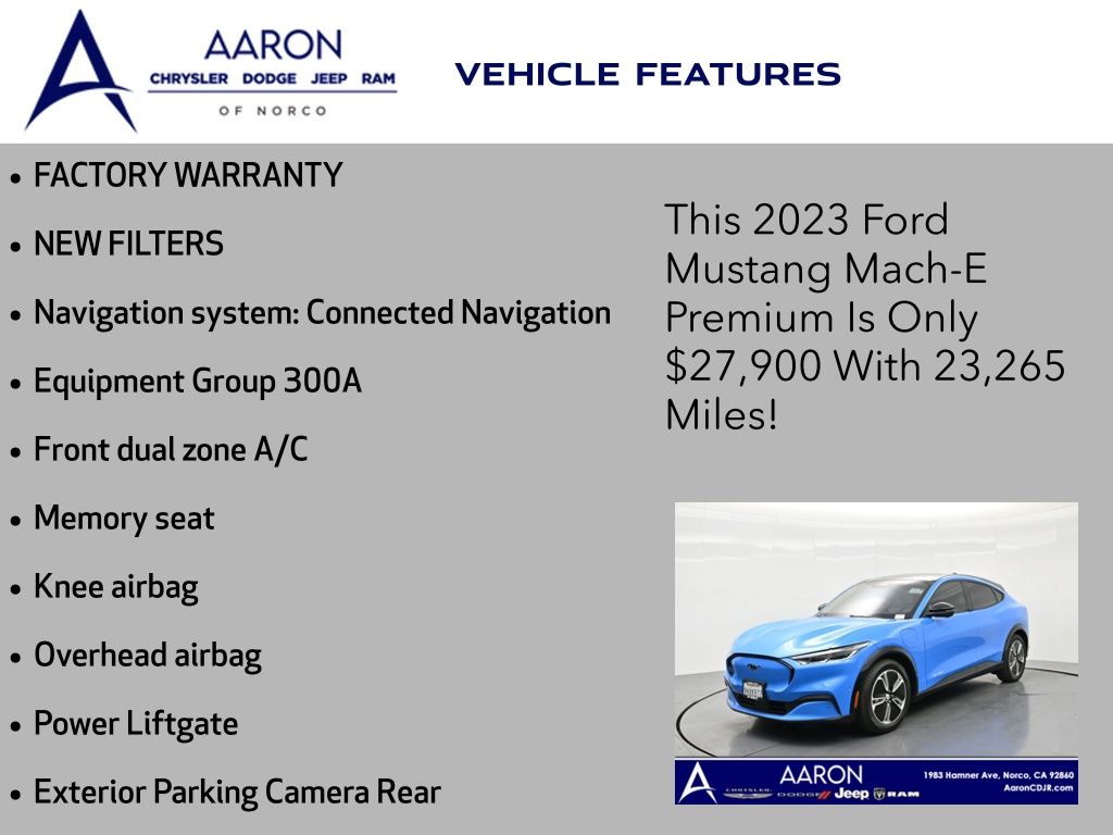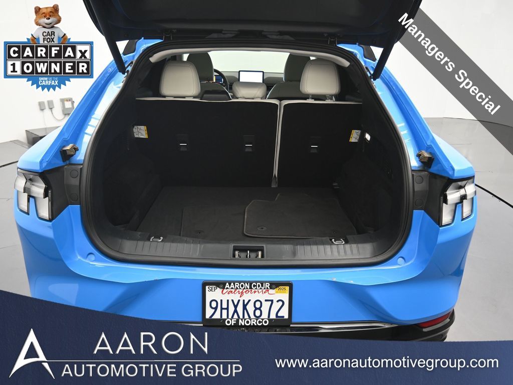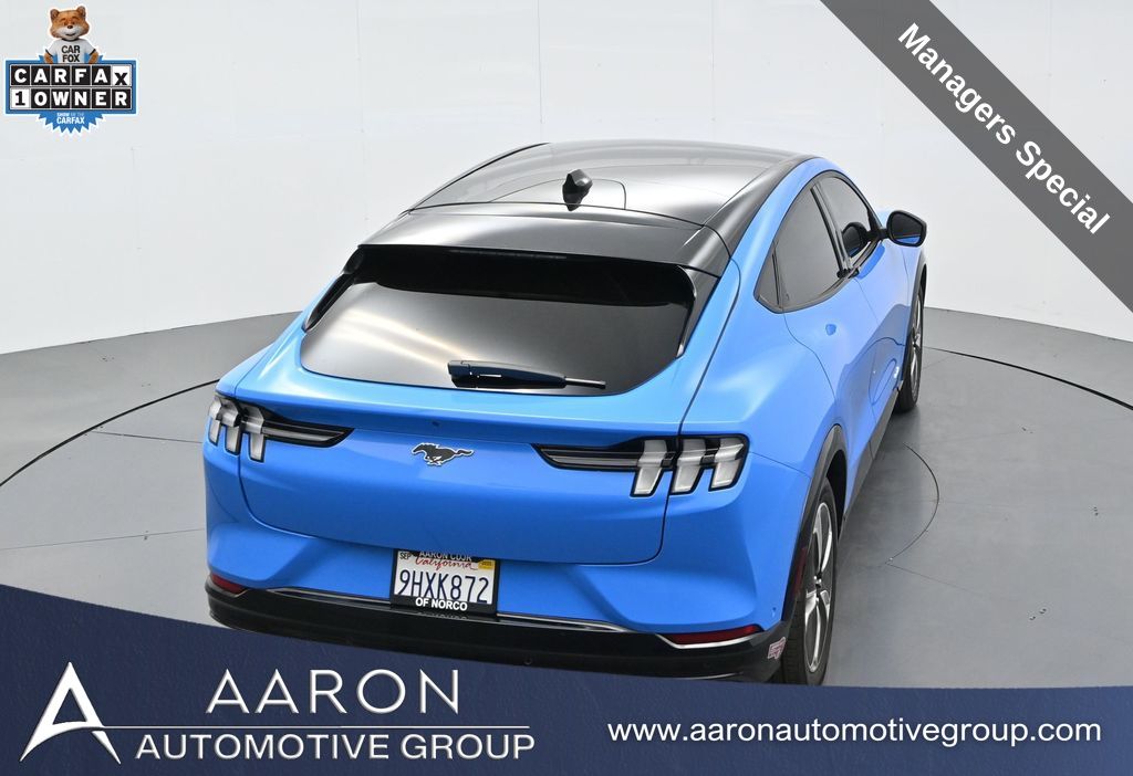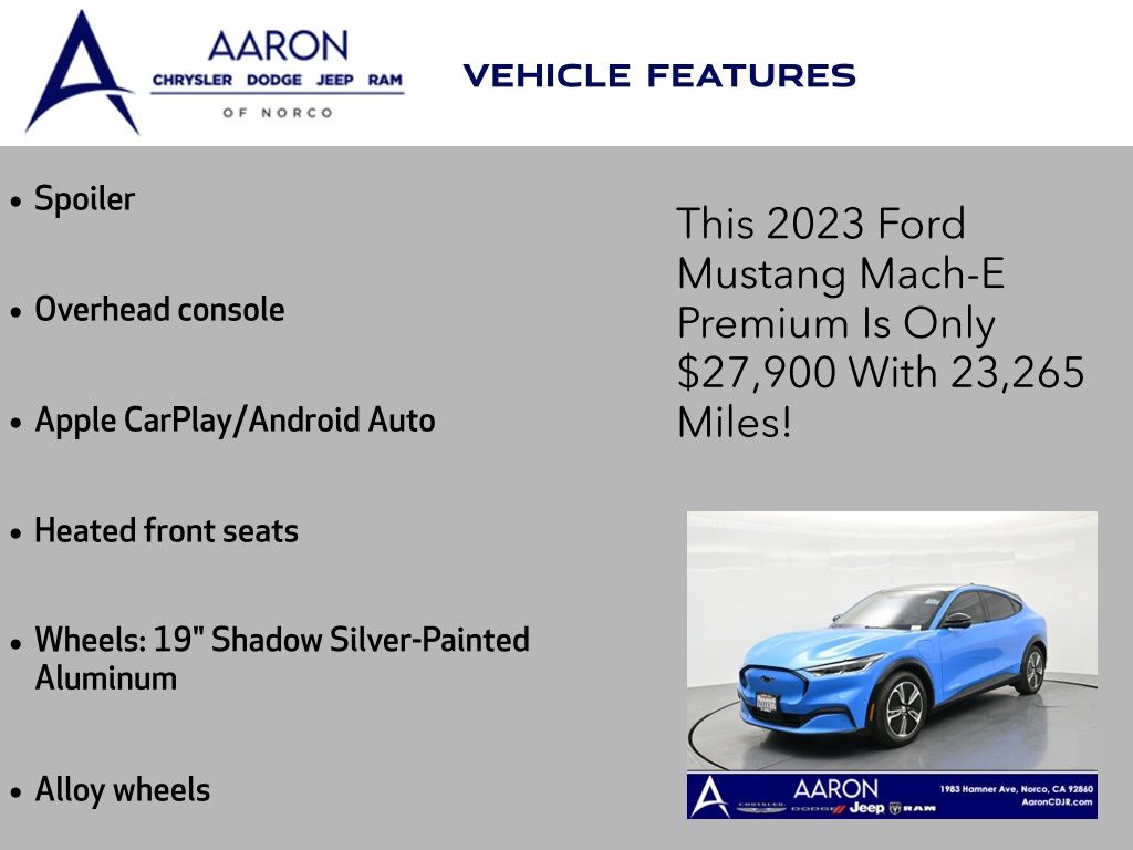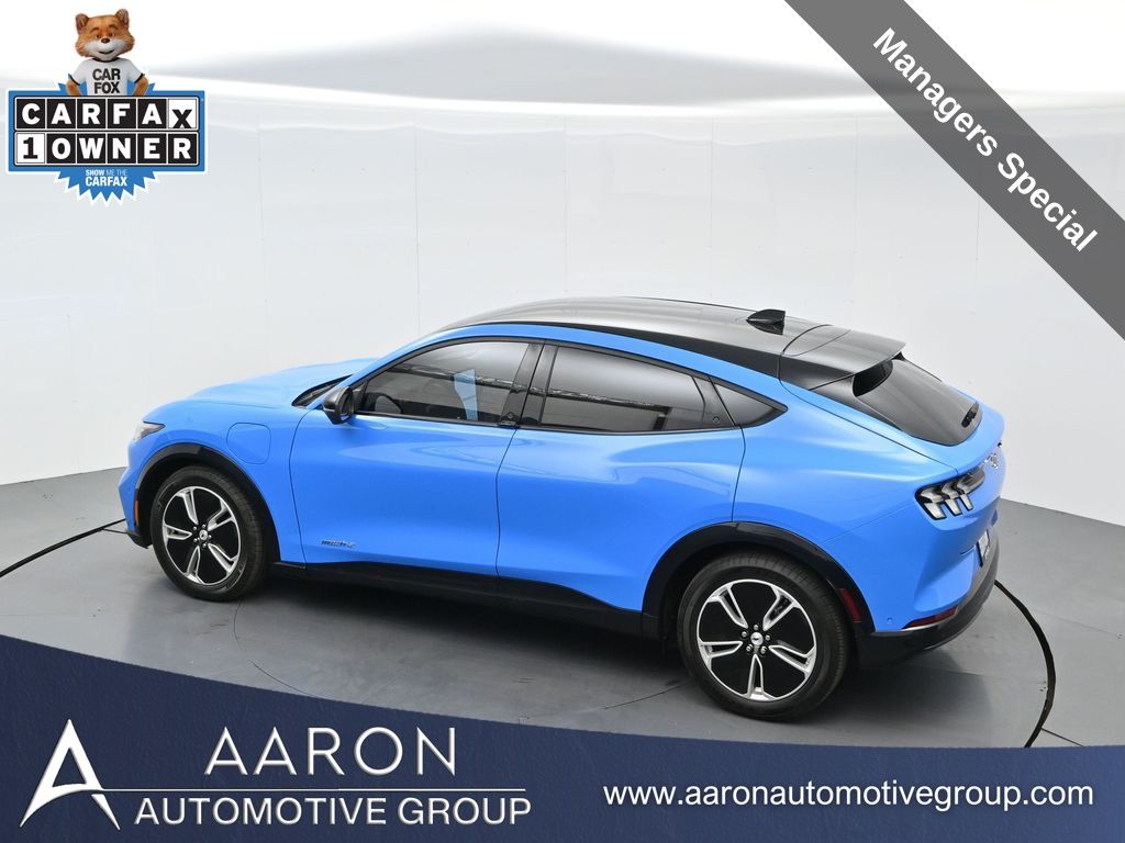 Experience the future of performance and design with this all-electric 2023 Ford Mustang Mach-E Premium, a rear-wheel drive crossover that blends iconic Mustang DNA with cutting-edge EV innovation. With just 23,265 miles and a clean one-owner Carfax showing consistent service, this Grabber Blue Metallic Mach-E offers exhilarating electric driving with the added confidence of remaining factory warranty. Powered by a permanent magnet motor and 91kWh extended-range lithium-ion battery, this Premium trim delivers seamless torque, whisper-quiet acceleration, and an impressive EPA-estimated range of up to 310 miles on a full charge. Ideal for daily commuting and road-tripping alike. Enjoy the convenience of multiple charging solutions including a mobile power cord and access to the BlueOval Charge Network. This Premium model is loaded with luxury and tech-forward features like perforated ActiveX heated front seats, a panoramic fixed-glass roof, and a SYNC 4A infotainment system with a massive 15.5-inch touchscreen, Apple CarPlay and Android Auto integration, enhanced voice recognition, and SiriusXM with 360L. Driver-assist technology is state-of-the-art, featuring Ford Co-Pilot360 Active 2.0 with Adaptive Cruise Control, Intersection Assist, Lane Centering, Evasive Steering Assist, and a full surround-view camera system for complete situational awareness. The interior feels upscale with a heated steering wheel, ambient lighting, aluminum and Carbonized Gray trim accents, and a power hands-free liftgate. Safety is comprehensive with Blind Spot Information System (BLIS), rear cross-traffic alert, Pre-Collision Assist with automatic emergency braking, and reverse sensing system. Additional upgrades include 19-inch shadow silver-painted aluminum wheels, Gray/Black two-tone interior with metallic pedals, memory driver's seat, dual-zone climate control, and wireless charging pad. Built for those who want the muscle of a Mustang with the forward-thinking power of electrification, this Mach-E Premium offers spirited handling, spacious comfort, and standout efficiency all in one electrifying package. Visit us today and take your driving experience to the next level zero emissions, maximum impact.