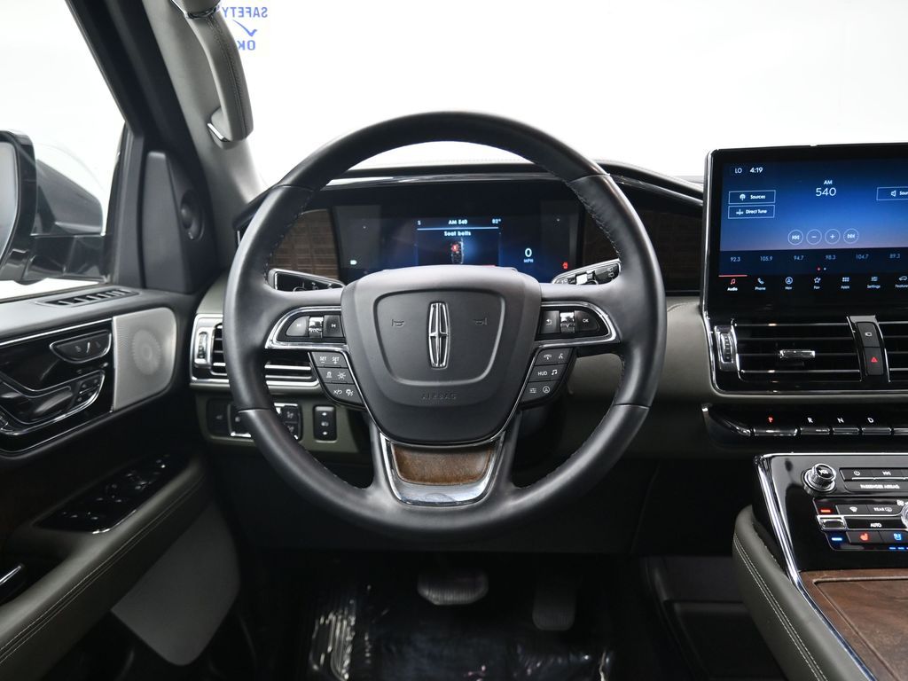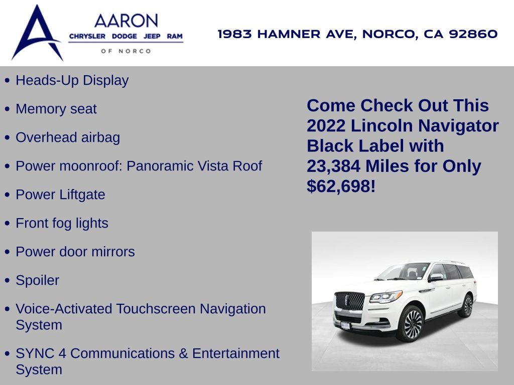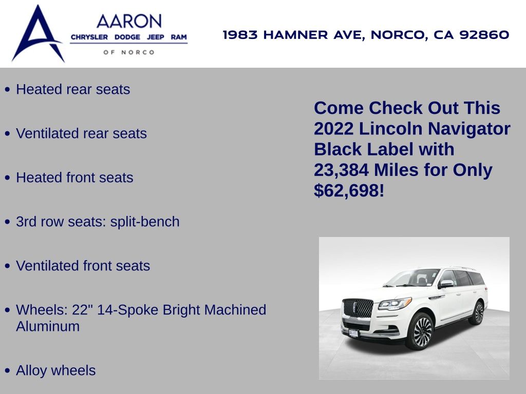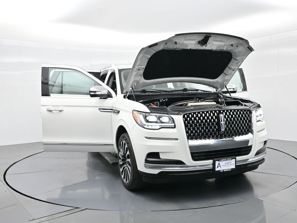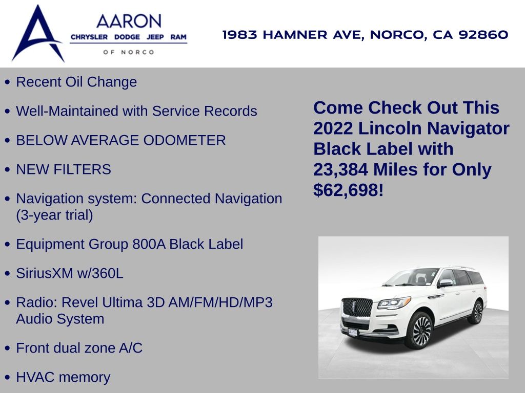 Immerse yourself in unmatched refinement and commanding performance with this 2022 Lincoln Navigator Black Label 4x4, the pinnacle of American luxury SUV craftsmanship. With just 23,384 miles and a clean one-owner Carfax, this Navigator is finished in pristine White Metallic with the exclusive Central Park Black Label theme, delivering an elegant yet bold presence on the road. Beneath the hood lies a robust 3.5L Twin-Turbocharged V6 engine paired with a smooth 10-speed automatic transmission and intelligent 4WD, effortlessly balancing power and control. Rated at an EPA-estimated 16 MPG city and 22 MPG highway, this full-size SUV brings refined efficiency to its class-leading capability. The Black Label trim offers elite amenities such as 30-way Perfect Position front seats with massage and Active Motion, Venetian leather seating surfaces, real wood accents, and a panoramic Vista Roof for a premium open-air experience. Technology is abundant with a 13.2-inch SYNC 4 infotainment system with built-in navigation, wireless Apple CarPlay and Android Auto, Revel Ultima 28-speaker 3D audio system, wireless device charging, head-up display, and Lincoln Connect with 4G Wi-Fi hotspot. The luxury continues in the second row with captains chairs, heated and ventilated functions, and power folding to access the power-folding third row. Advanced safety comes standard through the Lincoln Co-Pilot360 suite, including adaptive cruise control with stop-and-go, lane centering, evasive steering assist, blind spot detection with cross-traffic alert, a 360-degree camera, pre-collision assist with automatic emergency braking, and more. Ride comfort is elevated with adaptive suspension, active park assist 2.0, and Dynamic Brake Support, ensuring confidence and ease whether navigating city streets or highway cruising. Additional Black Label perks include a curated ownership experience with complimentary pickup and delivery, premium service scheduling, and access to exclusive Lincoln lifestyle privileges. Backed by a 6-year/70,000-mile powertrain warranty and loaded with thoughtful details like illuminated power running boards and LED adaptive pixel projector headlamps, this Navigator Black Label is a rare opportunity to command luxury, space, and technology in one iconic package. Visit us today and discover how this Navigator redefines what a premium SUV should be sophisticated, powerful, and unforgettable.