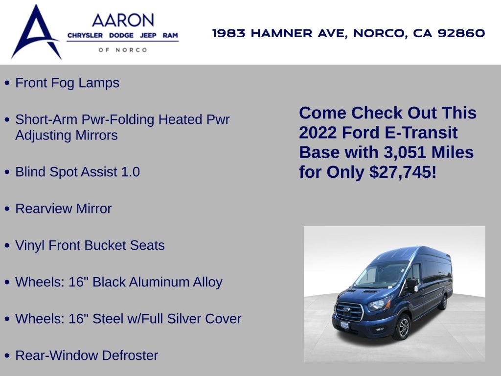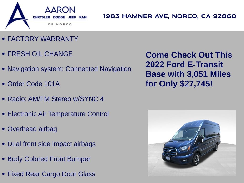 Priced below KBB Fair Purchase Price!FACTORY WARRANTY, FRESH OIL CHANGE, 3D Extended Cargo Van, Electric Motor, Single-Speed Automatic, RWD, Blind Spot Assist 1.0, Body Colored Front Bumper, Dual front side impact airbags, Electronic Air Temperature Control, Fixed Rear Cargo Door Glass, Front Fog Lamps, Navigation system: Connected Navigation, Order Code 101A, Overhead airbag, Radio: AM/FM Stereo w/SYNC 4, Rear-Window Defroster, Rearview Mirror, Short-Arm Pwr-Folding Heated Pwr Adjusting Mirrors, Vinyl Front Bucket Seats, Wheels: 16" Black Aluminum Alloy, Wheels: 16" Steel w/Full Silver Cover.Clean CARFAX.CARFAX One-Owner.