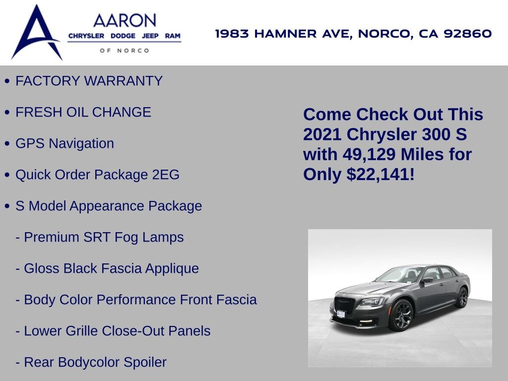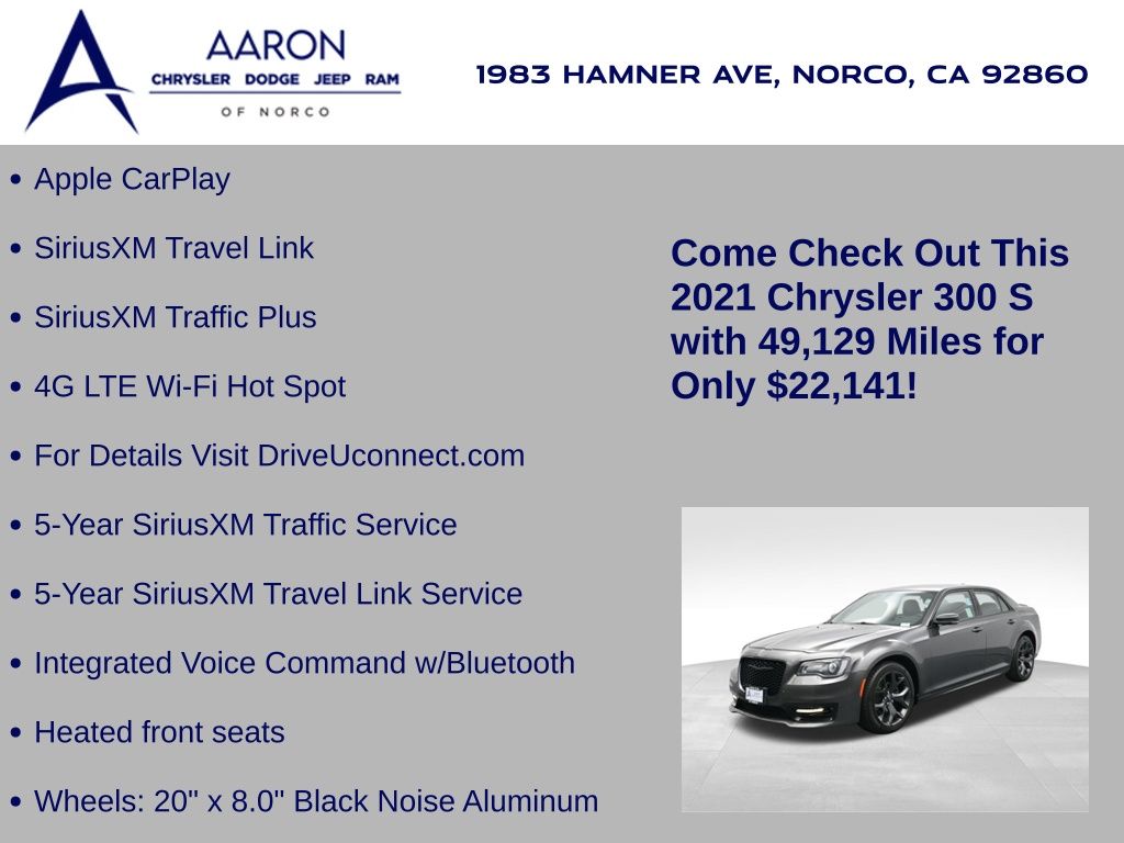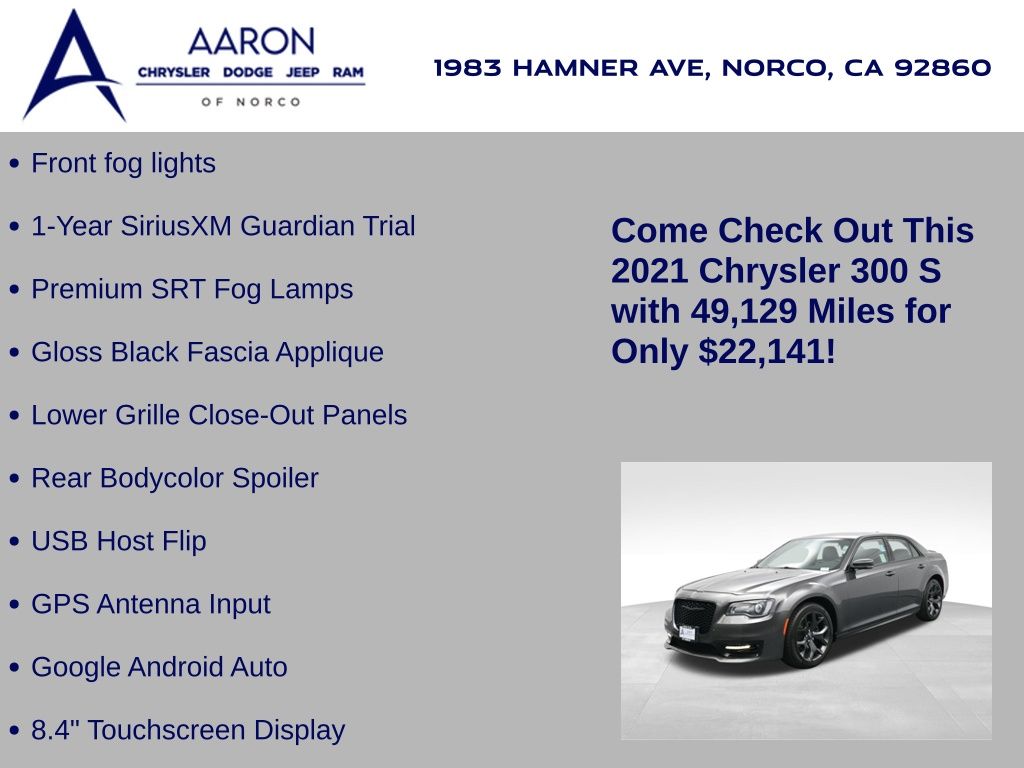 Priced below KBB Fair Purchase Price!FACTORY WARRANTY, FRESH OIL CHANGE, 300 S, 4D Sedan, 3.6L V6 24V VVT, 8-Speed Automatic, RWD, 1-Year SiriusXM Guardian Trial, 4G LTE Wi-Fi Hot Spot, 5-Year SiriusXM Traffic Service, 5-Year SiriusXM Travel Link Service, 8.4" Touchscreen Display, Alloy wheels, Apple CarPlay, Body Color Performance Front Fascia, For Details Visit DriveUconnect.com, Front dual zone A/C, Front fog lights, Gloss Black Fascia Applique, Google Android Auto, GPS Antenna Input, GPS Navigation, HD Radio, Heated front seats, Integrated Voice Command w/Bluetooth, Knee airbag, Lower Grille Close-Out Panels, Media Hub (2 USB, AUX), Overhead airbag, ParkView Rear Back-Up Camera, Power driver seat, Premium SRT Fog Lamps, Quick Order Package 2EG, Radio: Uconnect 4C Nav w/8.4" Display, Rear Bodycolor Spoiler, S Model Appearance Package, SiriusXM Satellite Radio, SiriusXM Traffic Plus, SiriusXM Travel Link, USB Host Flip, Wheels: 20" x 8.0" Black Noise Aluminum.Clean CARFAX.CARFAX One-Owner.