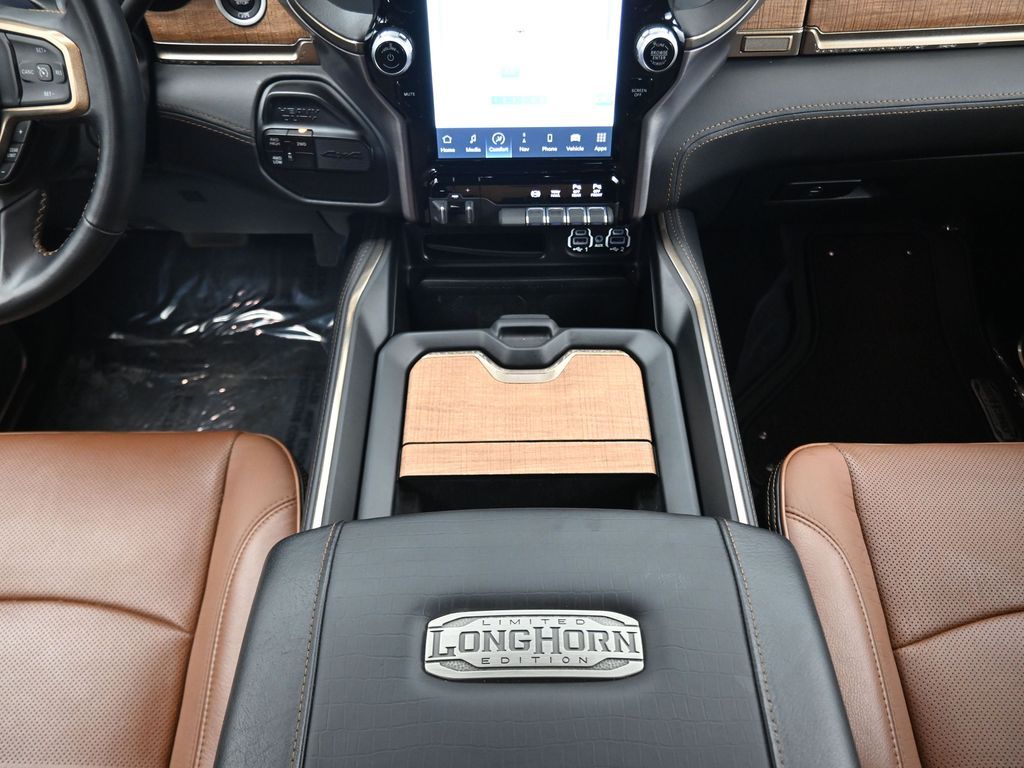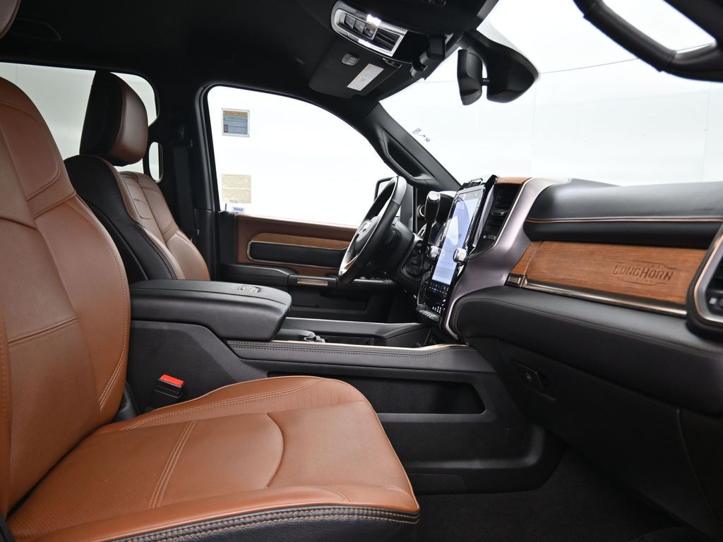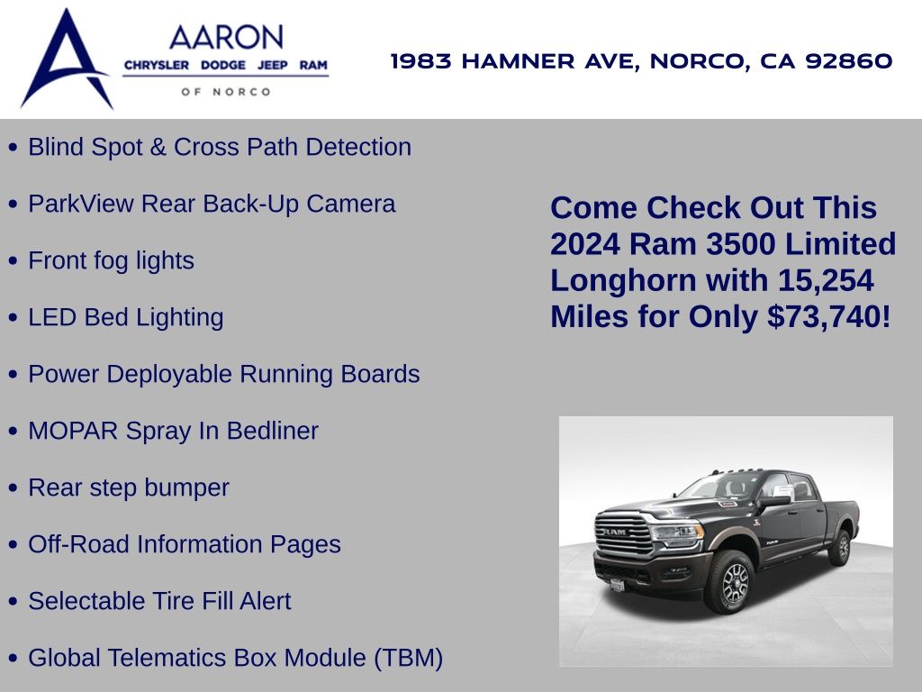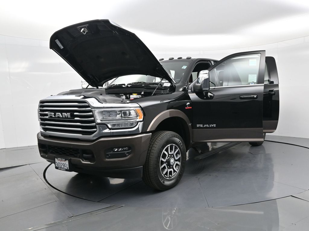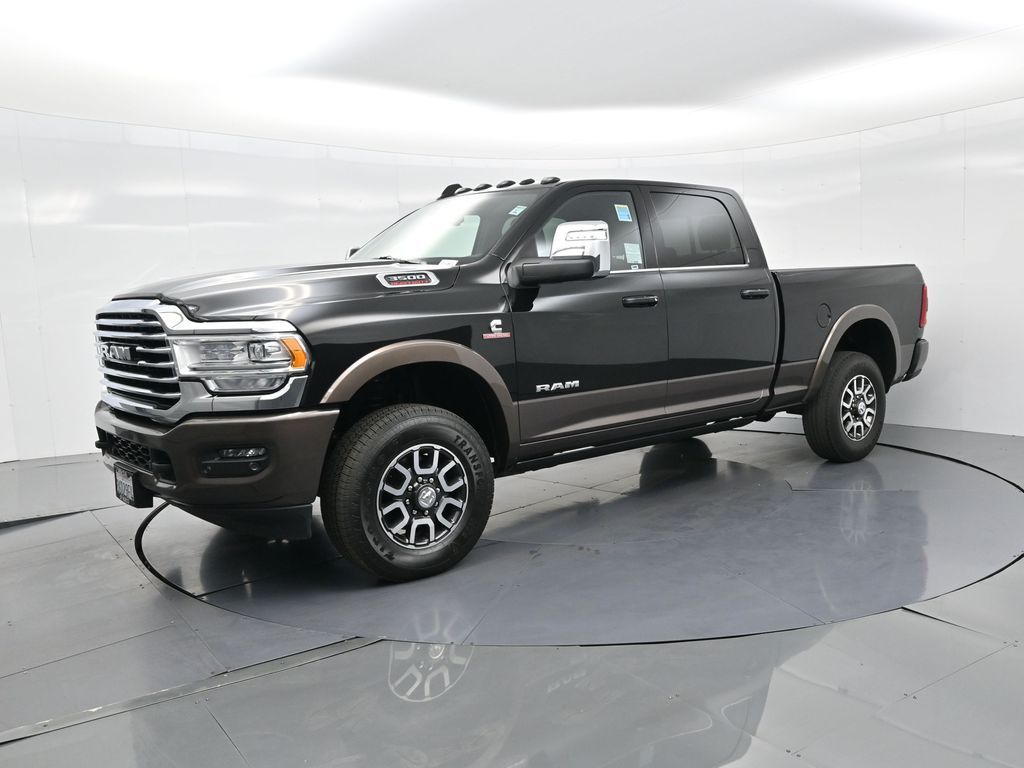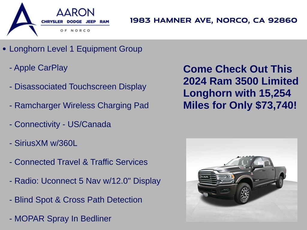 Commanding in both presence and capability, this 2024 Ram 3500 Limited Longhorn Crew Cab 4x4 is the epitome of heavy-duty luxury, built to handle the toughest jobs while surrounding you with premium comfort. With just 15,254 miles and a clean one-owner Carfax showing regular oil changes, this Diamond Black Crystal Pearl-Coat truck is powered by the legendary 6.7L Cummins Turbo Diesel I6 engine paired with a robust 6-speed automatic transmission, delivering massive towing and payload capacities for serious work and play. Outfitted with the Longhorn Level 1 Equipment Group, this truck elevates every drive with a Harman Kardon Premium Sound System, LED bed lighting, navigation, surround-view camera, ventilated and heated front and rear seats, premium leather upholstery, and genuine wood and metal interior accents that showcase exceptional craftsmanship. Practical upgrades like the Customer Preferred Package 21K, fifth-wheel/gooseneck towing prep, painted rear bumper, and clearance lamps enhance its utility and style. The exterior blends rugged durability with elegance, featuring chrome accents, 18-inch polished aluminum wheels, power deployable running boards, LED lighting, and RamBox cargo management. Inside, advanced tech includes a 12-inch touchscreen with Uconnect, Apple CarPlay, Android Auto, SiriusXM with 360L, and wireless charging. Safety is equally impressive, with blind spot monitoring, cross-path detection, adaptive cruise control, forward collision warning, and a 360-degree camera providing confidence in all driving conditions. Backed by a 5-year/100,000-mile powertrain warranty, this Limited Longhorn offers the perfect combination of muscle, refinement, and technology. Whether youre towing heavy equipment, hauling livestock, or embarking on long-distance trips in absolute comfort, this Ram 3500 Limited Longhorn is built to exceed expectations. Visit us today and experience the strength and sophistication that set this truck apart in the heavy-duty segment.