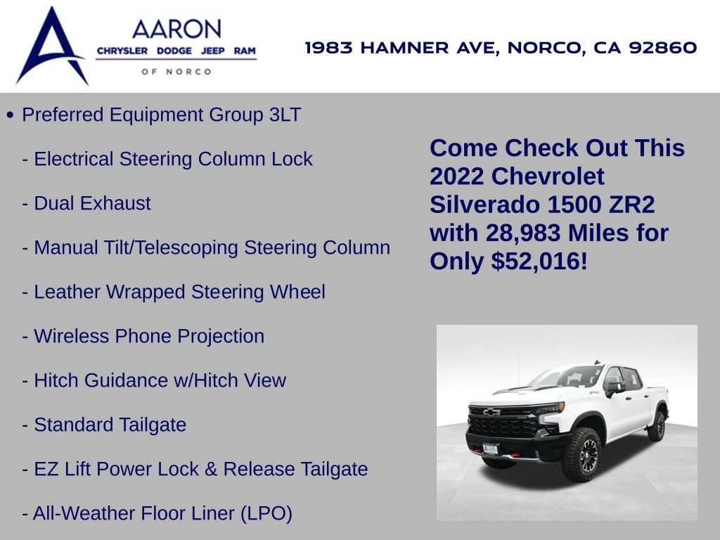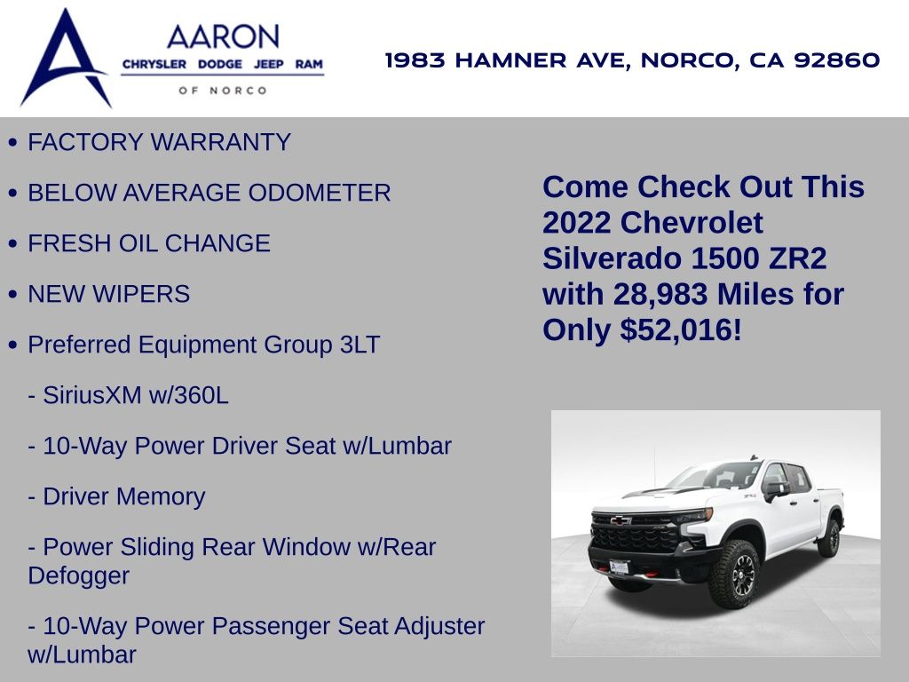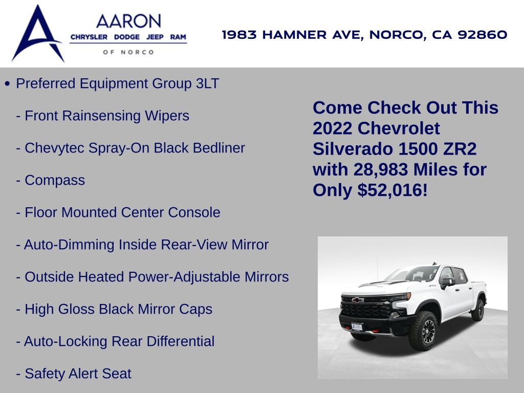 Priced below KBB Fair Purchase Price!FACTORY WARRANTY, BELOW AVERAGE ODOMETER, FRESH OIL CHANGE, NEW WIPERS, Silverado 1500 ZR2, 4D Crew Cab, EcoTec3 6.2L V8, 10-Speed Automatic, 4WD, 10-Way Power Driver Seat w/Lumbar, 10-Way Power Passenger Seat Adjuster w/Lumbar, 12.3" Multicolor Reconfigurable Digital Display, 120-Volt Bed Mounted Power Outlet, 120-Volt Instrument Panel Power Outlet, 15" Diagonal Multicolor Head-Up Display, 170 Amp Alternator, 2 USB Data Ports, 2nd Row Heated Outboard Seats, Adaptive Cruise Control, All-Weather Floor Liner (LPO), Auto-Dimming Inside Rear-View Mirror, Auto-Locking Rear Differential, Bed View Camera, Bluetooth® For Phone, Chevrolet Connected Access Capable, Chevytec Spray-On Black Bedliner, Color-Keyed Carpeting Floor Covering, Compass, Deep-Tinted Glass, Driver Memory, Dual Exhaust, Dual Rear USB Ports (Charge Only), Electric Rear-Window Defogger, Electrical Steering Column Lock, Electronic Cruise Control, EZ Lift Power Lock & Release Tailgate, Floor Mounted Center Console, Front fog lights, Front LED Fog Lamps, Front Rainsensing Wipers, HD Surround Vision, Heated Driver & Front Outboard Passenger Seats, Heated Steering Wheel, Heavy-Duty Air Filter, High Gloss Black Mirror Caps, Hill Descent Control, Hitch Guidance, Hitch Guidance w/Hitch View, Integrated Trailer Brake Controller, Keyless Open & Start, Leather Wrapped Steering Wheel, LED Cargo Area Lighting, Manual Tilt/Telescoping Steering Column, OnStar & Chevrolet Connected Services Capable, Outside Heated Power-Adjustable Mirrors, Performance Red Recovery Hooks, Perimeter Lighting, Power Front Passenger Windows w/Express Up/Down, Power Front Windows w/Driver Express Up/Down, Power Rear Windows w/Express Down, Power Sliding Rear Window w/Rear Defogger, Power Tilt & Telescoping Steering Column, Preferred Equipment Group 3LT, Rear Camera Mirror, Rear Cross Traffic Alert-Braking, Rear Park Assist, Rear Pedestrian Detection, Rear Wheelhouse Liners, Remote Vehicle Starter System, Safety Alert Seat, SiriusXM w/360L, Standard Tailgate, Steering Wheel Audio Controls, Technology Package, Theft Deterrent System (Unauthorized Entry), Trailer Camera Provisions, Trailer Side Blind Zone Alert, Trailering App, Trailering Package, Universal Home Remote, Up-Level Rear Seat w/Storage Package, Ventilated Driver & Front Passenger Seats, Wi-Fi Hot Spot Capable, Wireless Charging, Wireless Phone Projection, ZR2 Suspension Package.Clean CARFAX.CARFAX One-Owner.