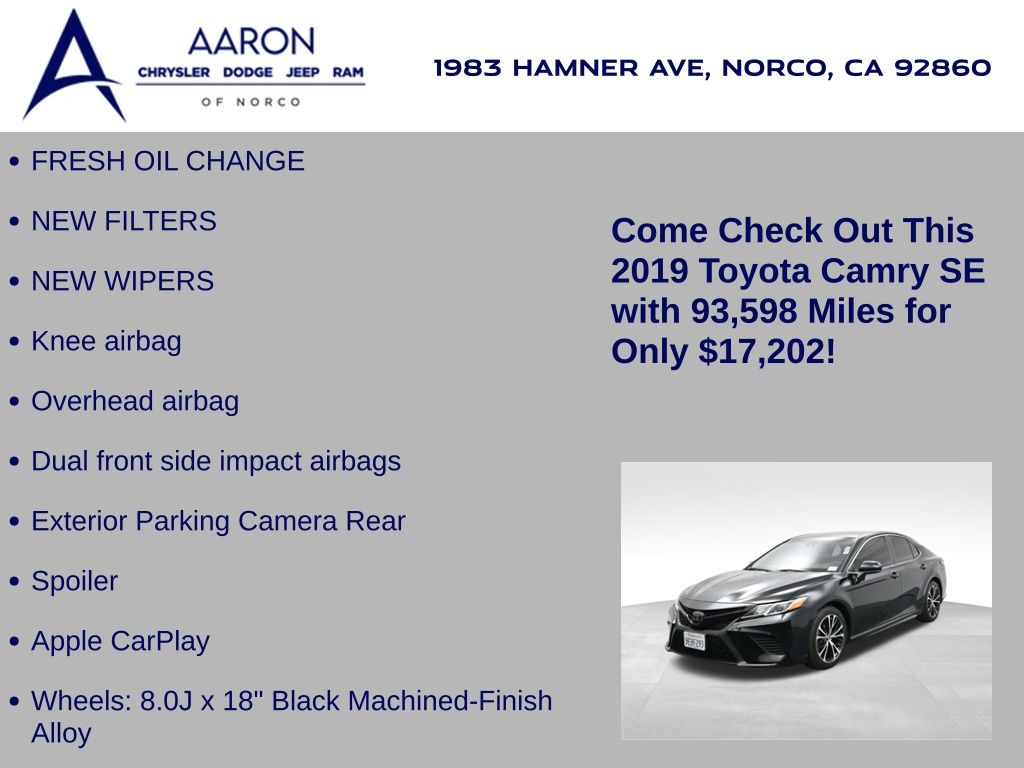FRESH OIL CHANGE, NEW FILTERS, NEW WIPERS, Camry SE, 4D Sedan, 2.5L I4 DOHC 16V, 8-Speed Automatic, FWD, Alloy wheels, Apple CarPlay, Dual front side impact airbags, Exterior Parking Camera Rear, Knee airbag, Overhead airbag, Spoiler, Wheels: 8.0J x 18" Black Machined-Finish Alloy.Awards: * 2019 KBB.com 10 Most Comfortable Cars Under $30,000 * 2019 KBB.com 10 Best Sedans Under $30,000 * 2019 KBB.com Brand Image Awards * 2019 KBB.com Best Resale Value Awards