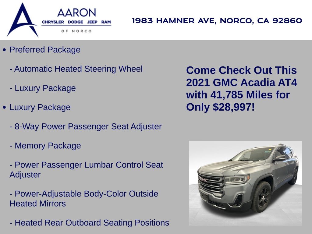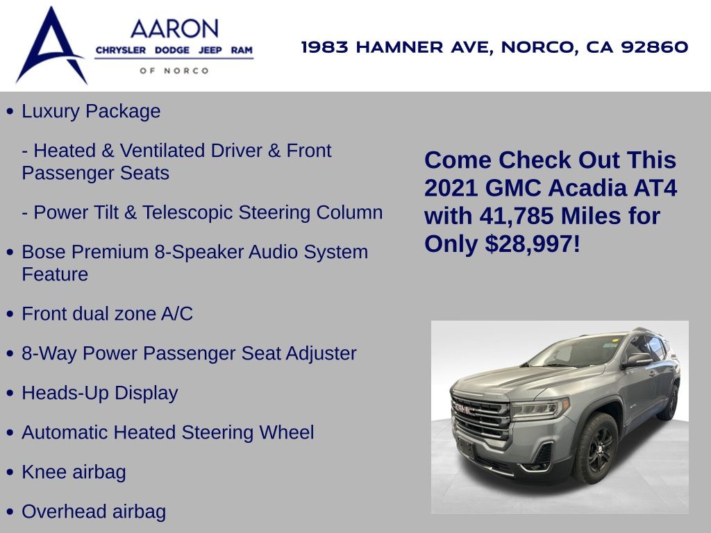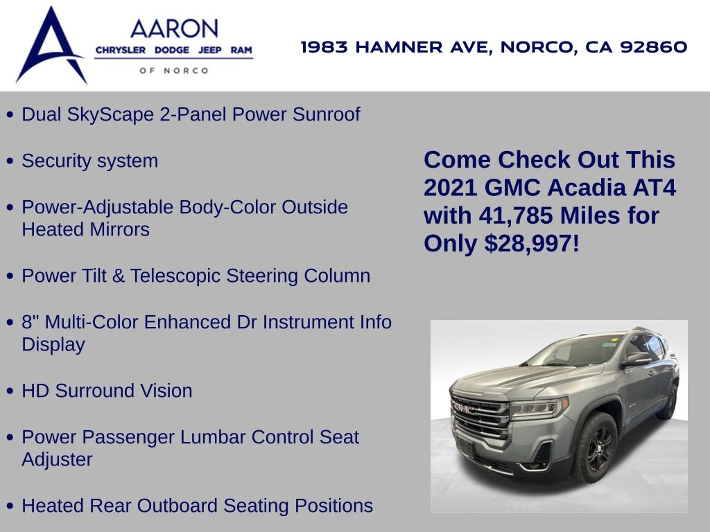 Priced below KBB Fair Purchase Price!BELOW AVERAGE ODOMETER, FRESH OIL CHANGE, NEW FILTERS, NEW WIPERS, Acadia AT4, 3.6L V6 SIDI, 9-Speed Automatic, AWD, Satin Steel Metallic, 8-Way Power Passenger Seat Adjuster, 8" Multi-Color Enhanced Dr Instrument Info Display, Alloy wheels, Automatic Heated Steering Wheel, Black Center Caps w/Red GMC Logo (LPO), Bose Premium 8-Speaker Audio System Feature, Dual front side impact airbags, Dual SkyScape 2-Panel Power Sunroof, Front dual zone A/C, HD Surround Vision, Heads-Up Display, Heated & Ventilated Driver & Front Passenger Seats, Heated Rear Outboard Seating Positions, Knee airbag, Luxury Package, Memory Package, Navigation System, Overhead airbag, Power Passenger Lumbar Control Seat Adjuster, Power Tilt & Telescopic Steering Column, Power-Adjustable Body-Color Outside Heated Mirrors, Preferred Equipment Group 4SB, Preferred Package, Security system, Technology Package, Wheels: 17" Gloss Black Aluminum.Clean CARFAX.CARFAX One-Owner.